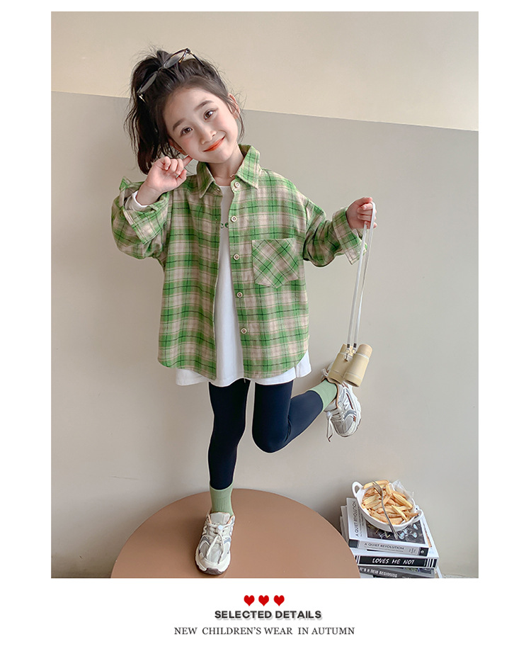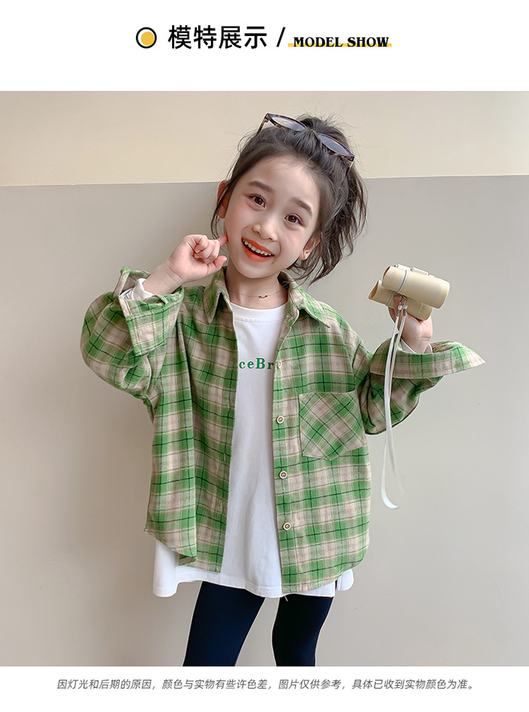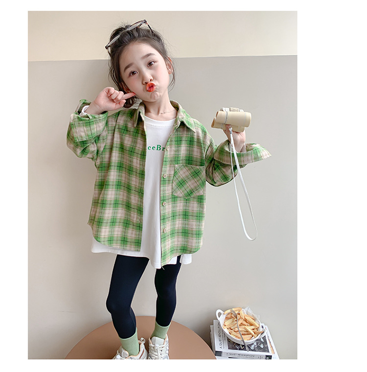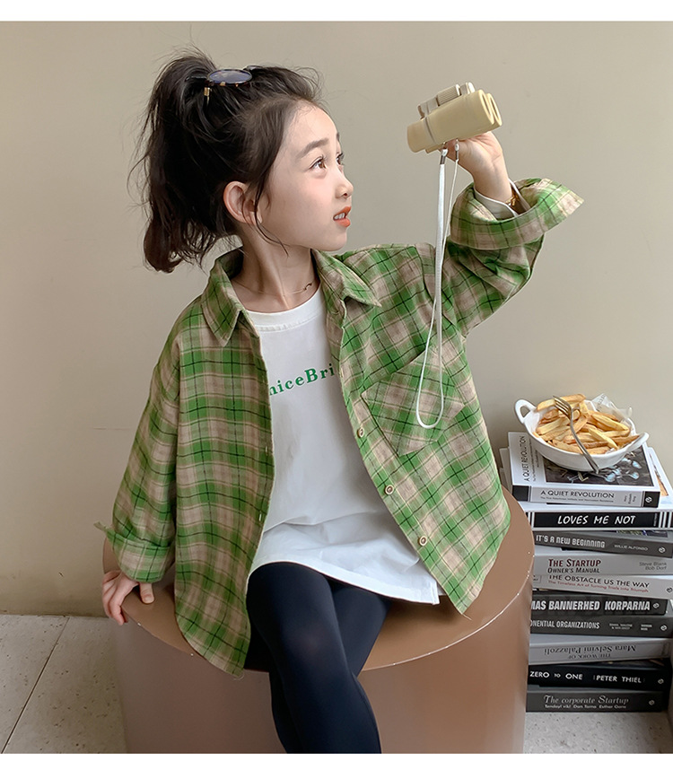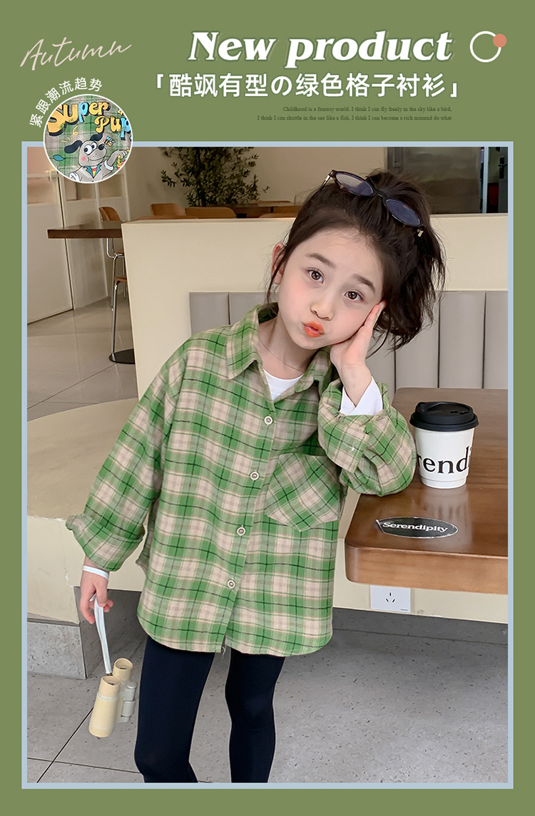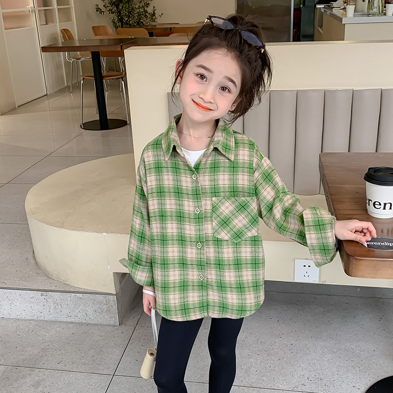 소녀의 셔츠 봄과 가을 2024 새로운 패션 어린 소녀의 녹색 격자 무늬 셔츠 중소 어린이 캐주얼 탑스토어 가기