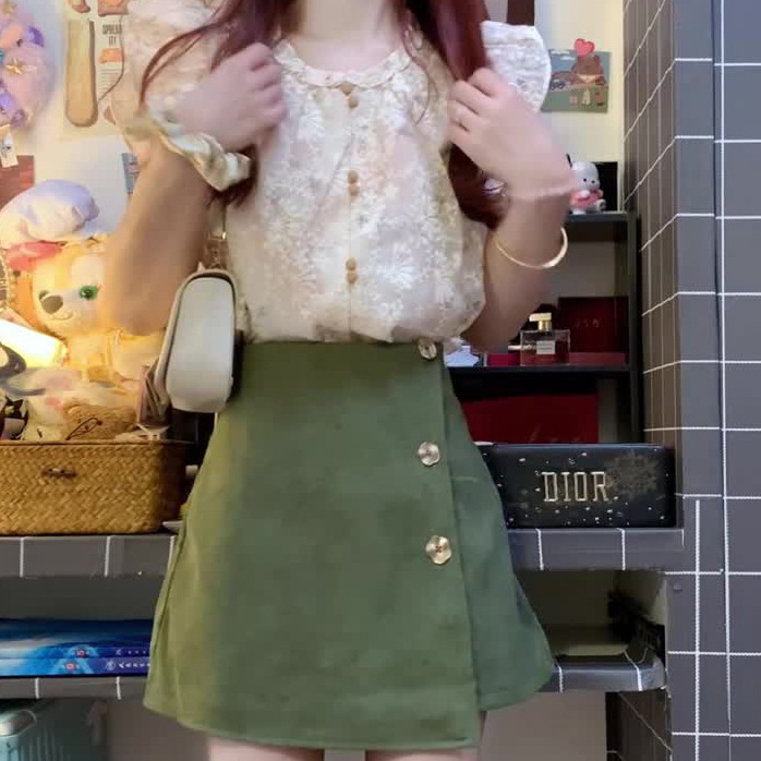 슬리밍 우아한 디자인 센스 셔츠 플라잉 슬리브 탑 여성 레트로 그린 크로스 A 라인 스커트 새로운 중국 세트스토어 가기
