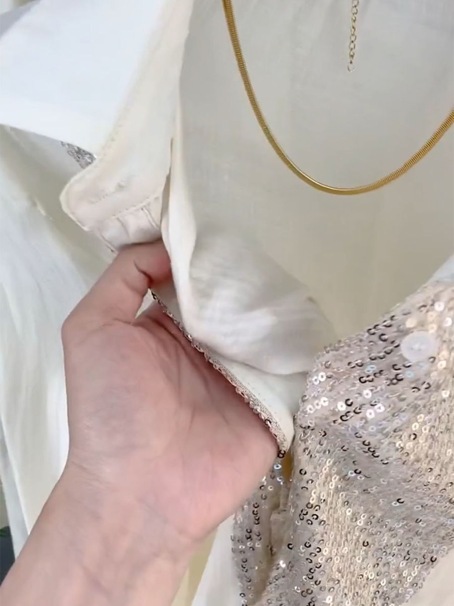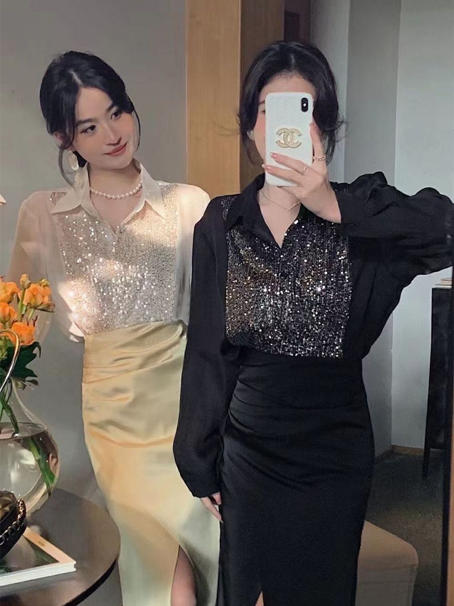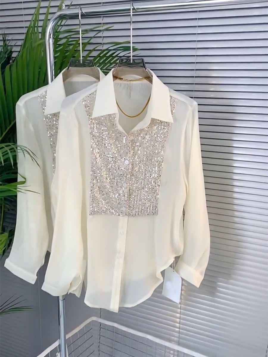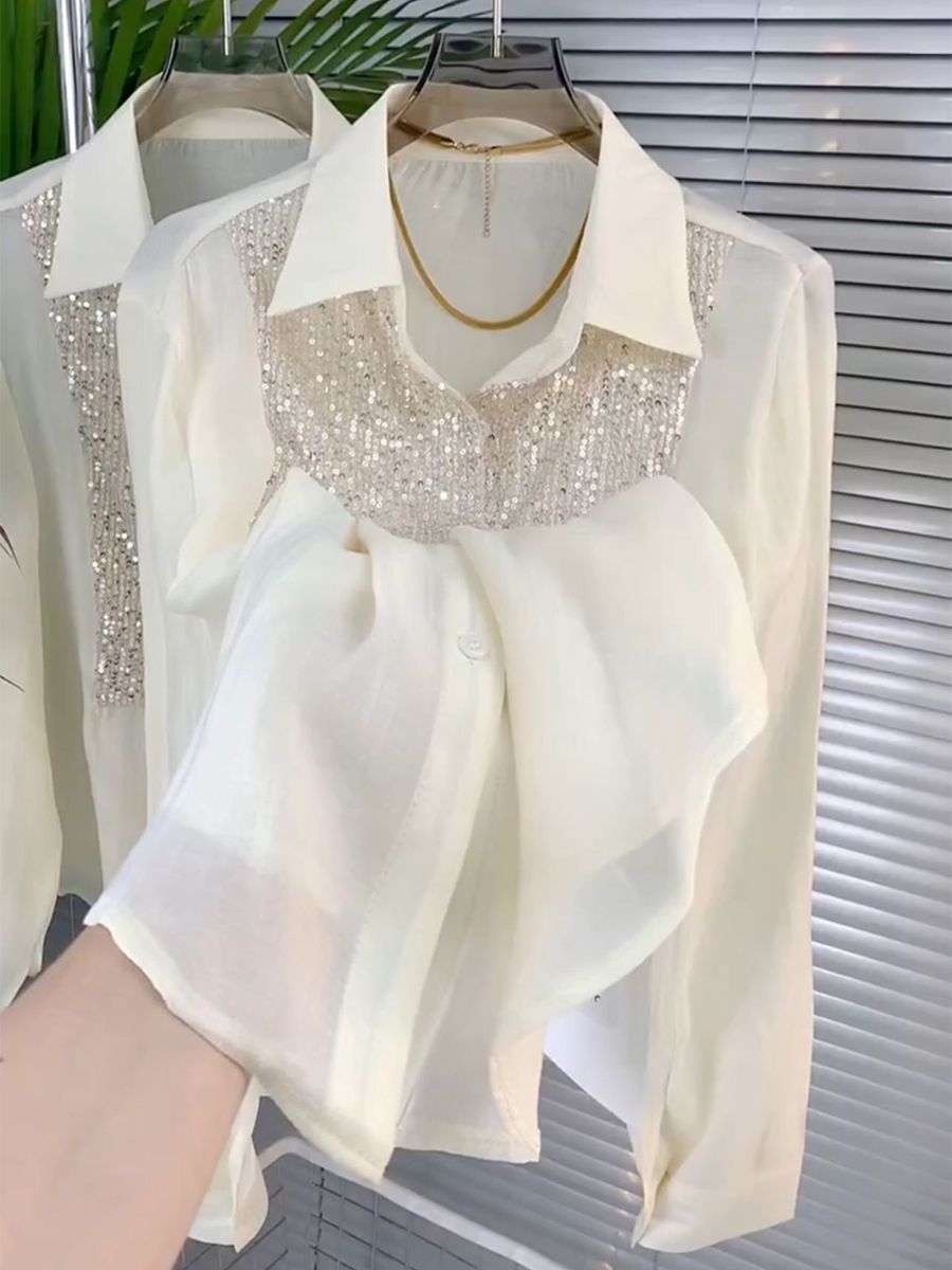 프랑스 스팽글 반짝이는 긴 소매 살구색 셔츠 여성의 2024 년 초가을 새로운 디자인 틈새 POLO 칼라 탑스토어 가기