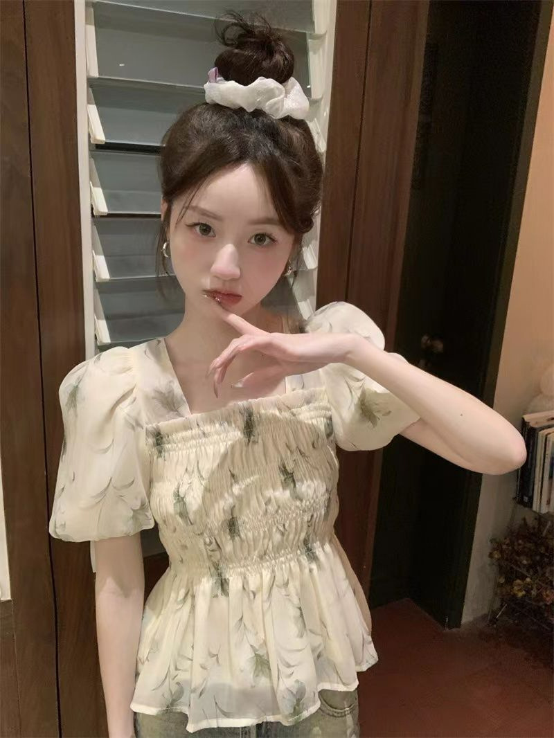 한국 스타일 달콤한 꽃 쉬폰 탑 여름 느슨한 스퀘어 칼라 퍼프 소매 디자인 틈새 선스크린 셔츠스토어 가기
