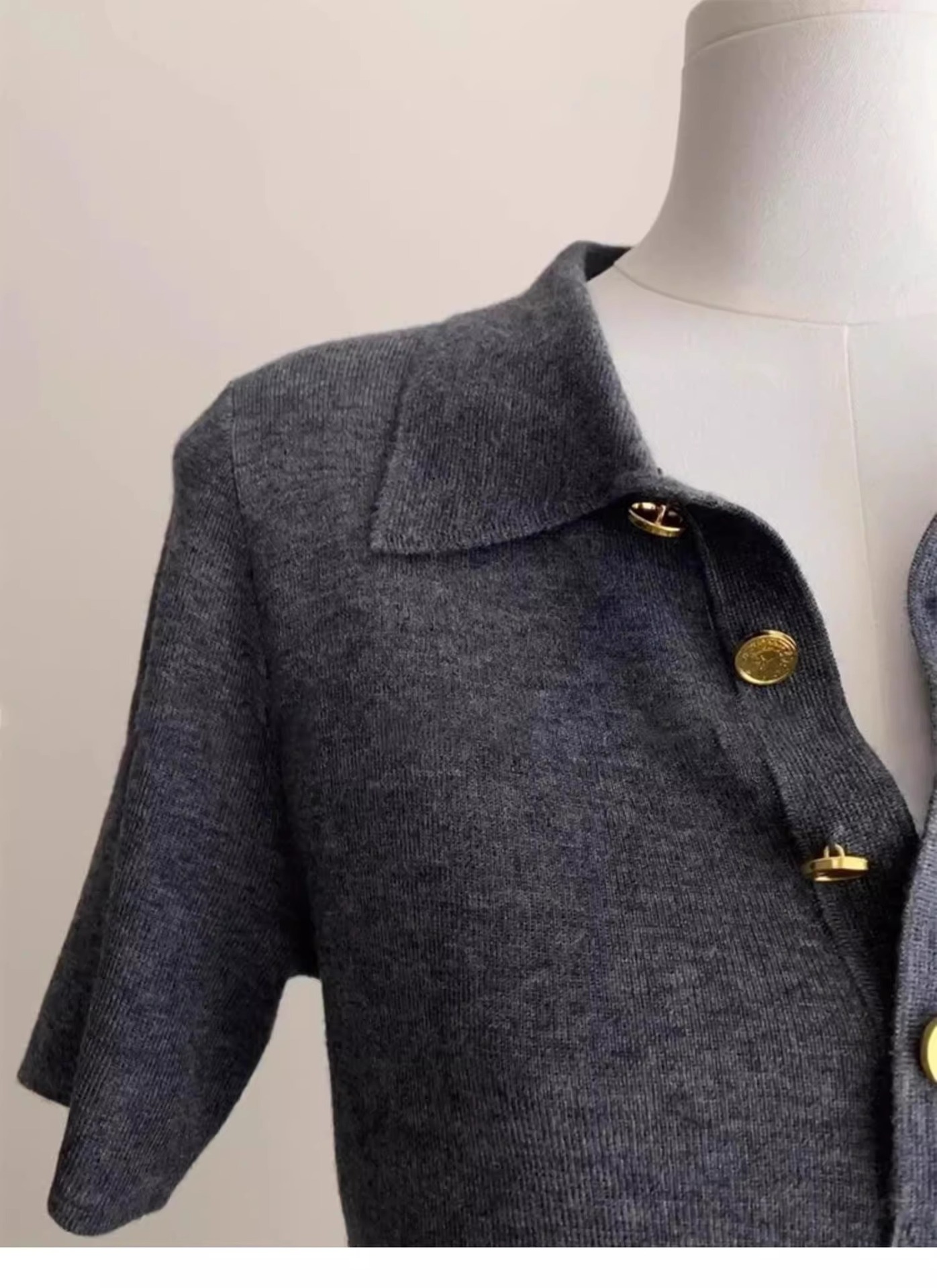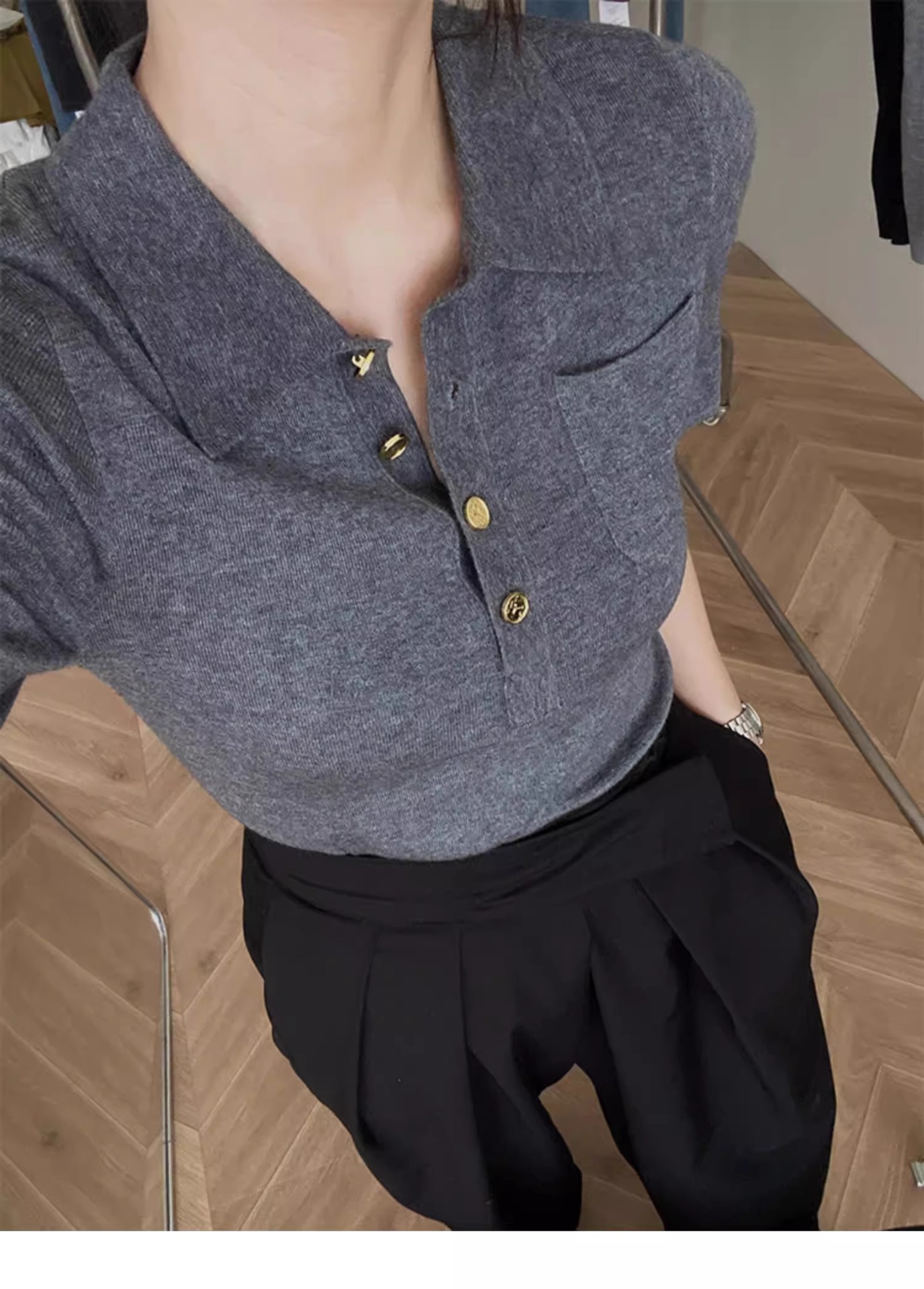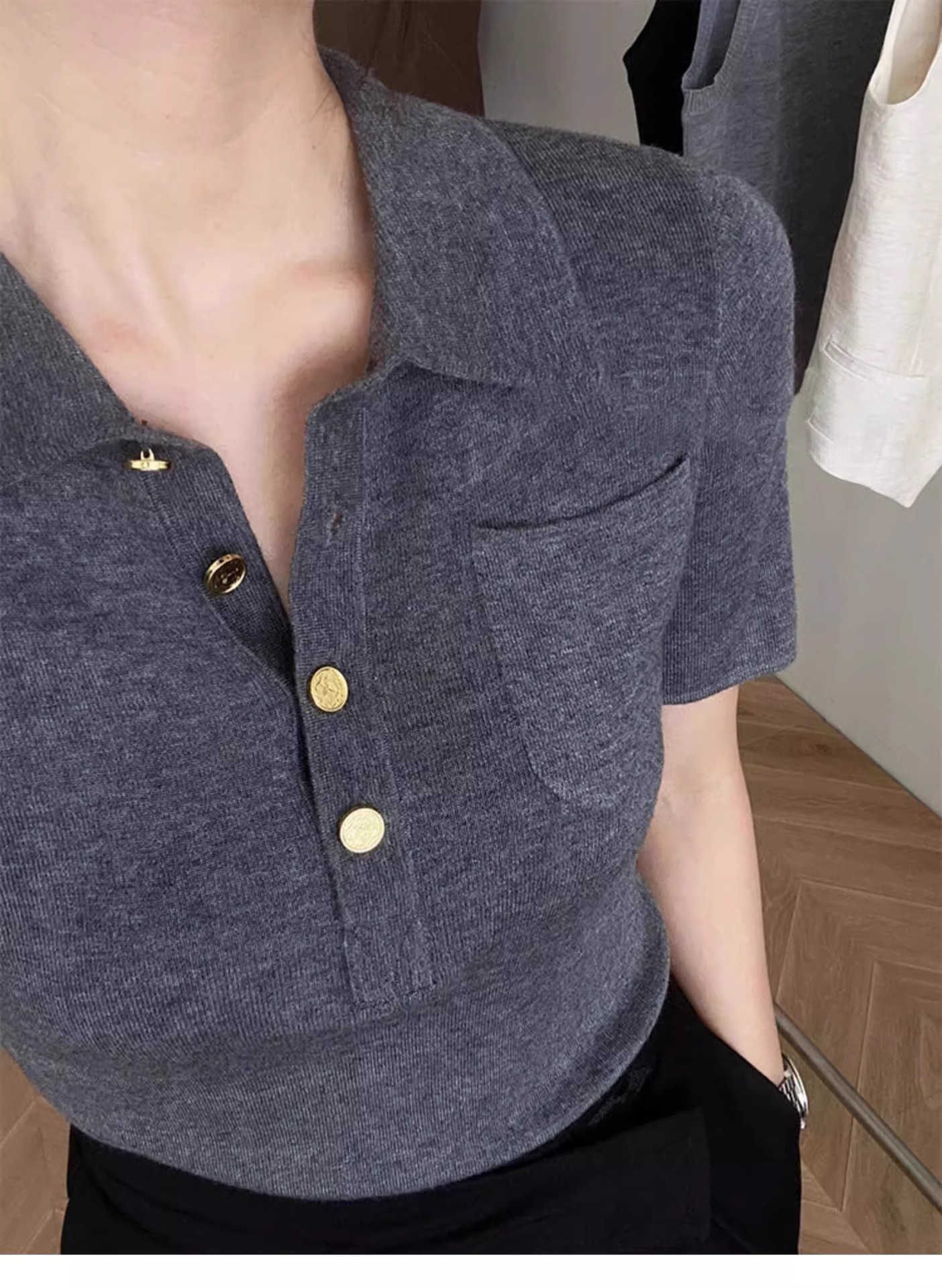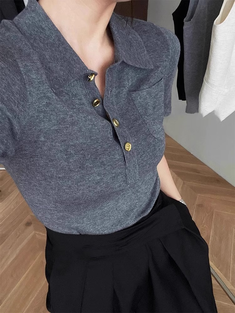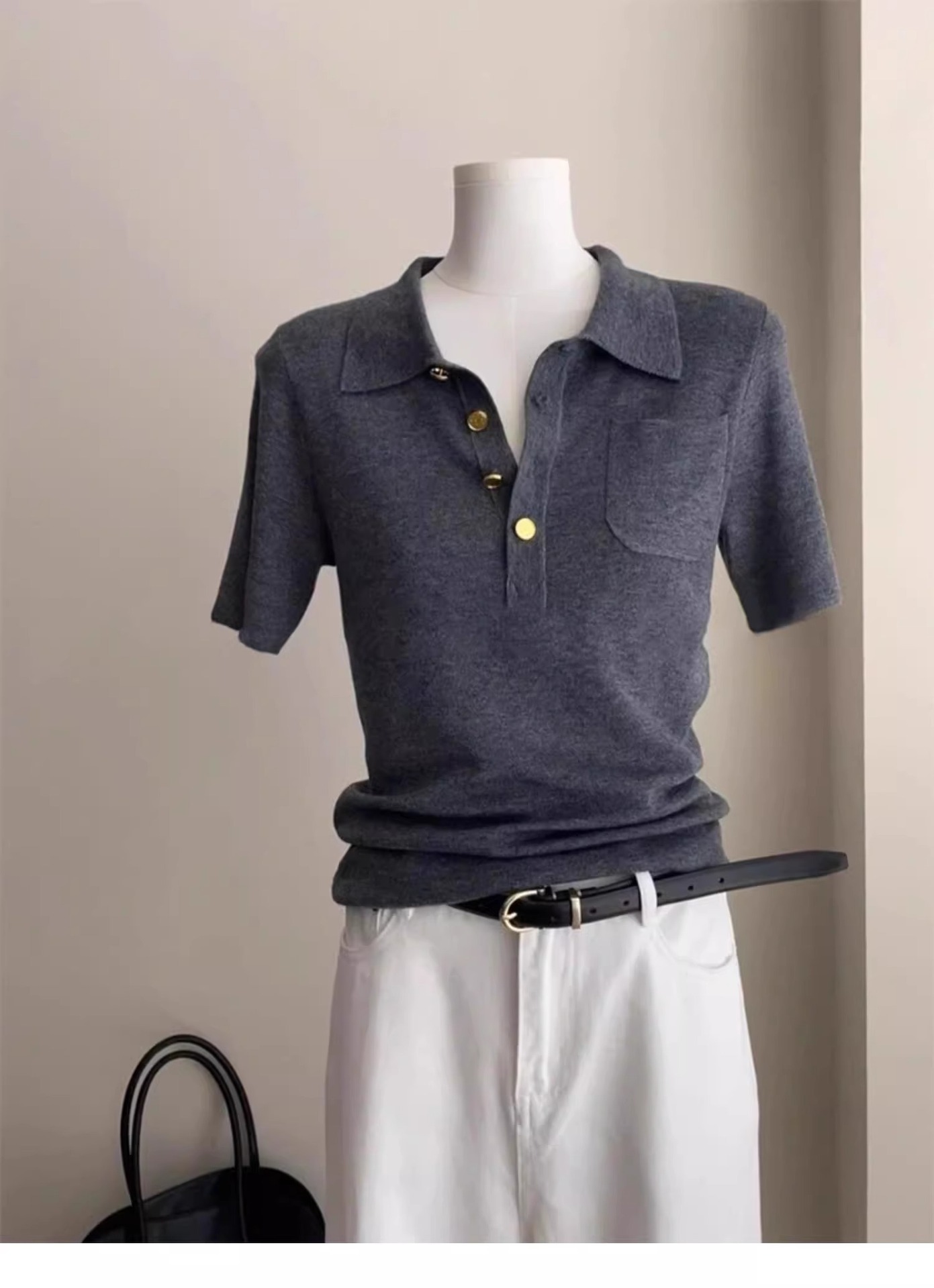 프랑스 폴로 칼라 그레이 반팔 스웨터 여성 여름 짧은 고급 우아한 아이스 실크 숄더 티셔츠 탑