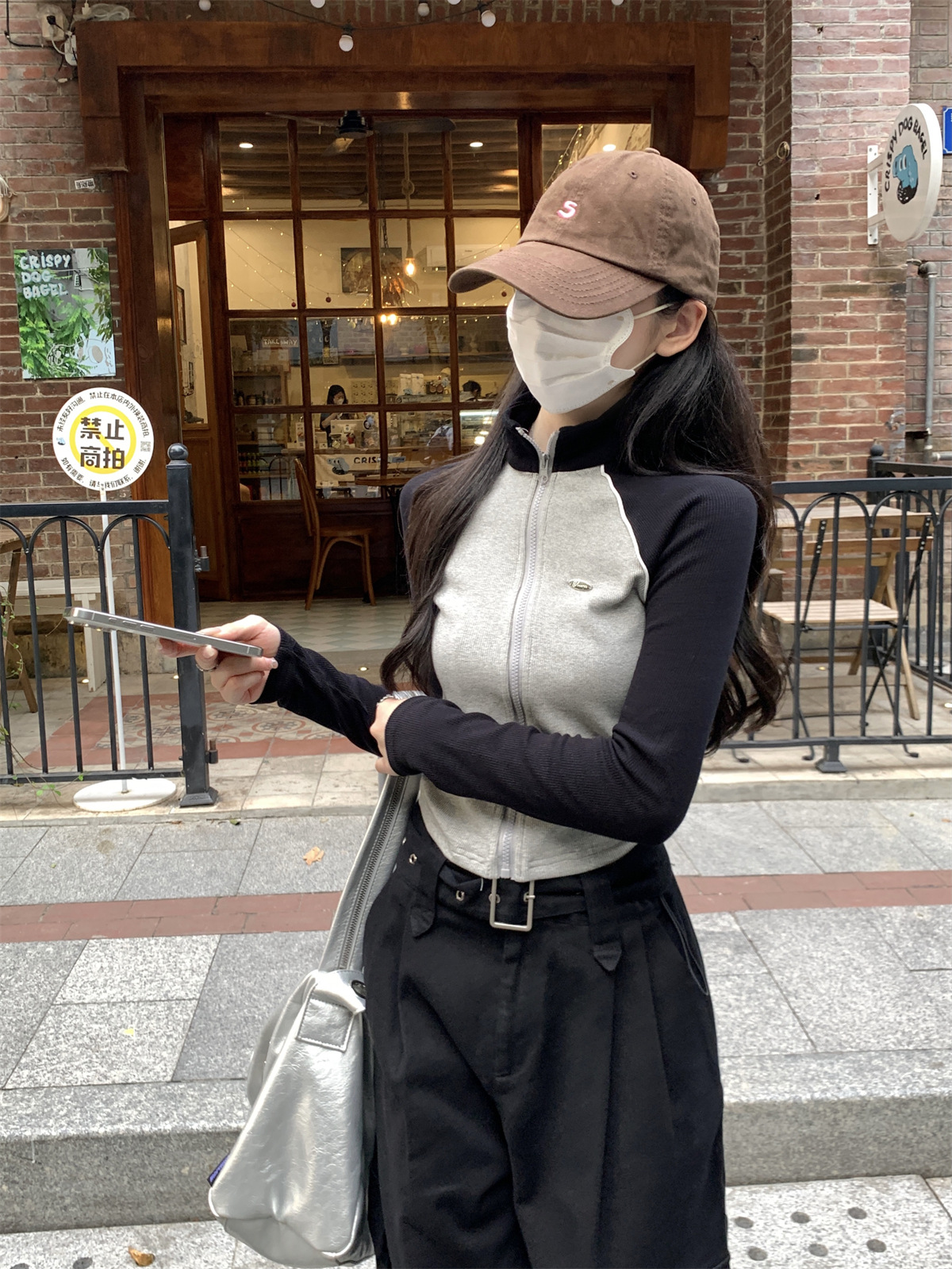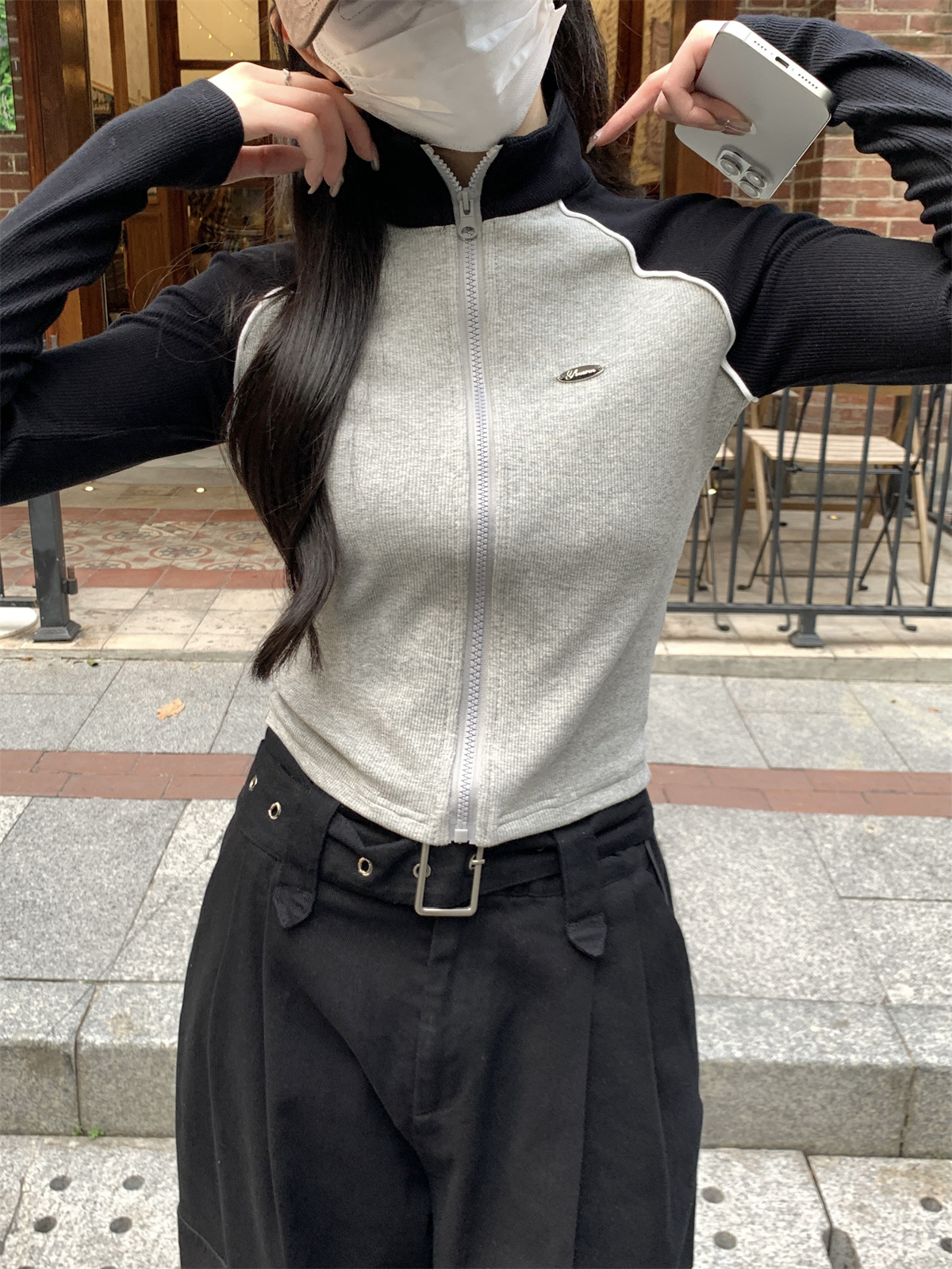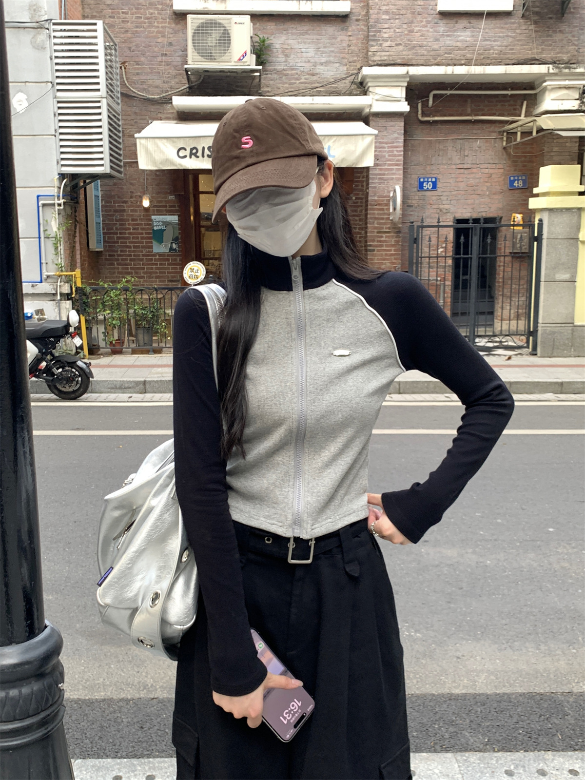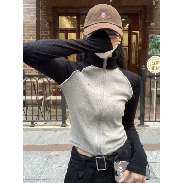 미국 국경 새로운 스탠드 칼라 대비 색상 접합 긴팔 티셔츠 여성 봄, 가을 학생 슬리밍 짧은 재킷