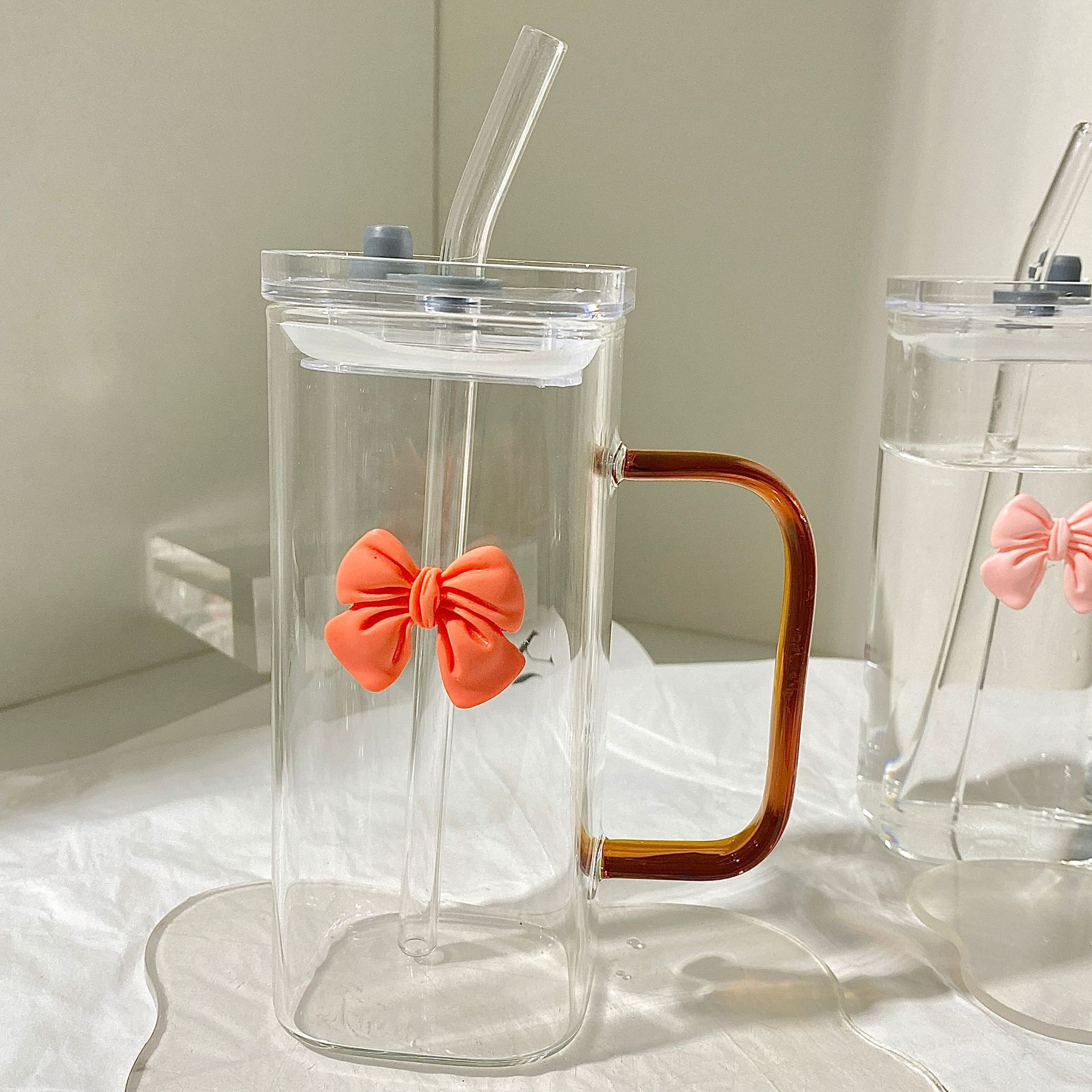 • 호박색 손잡이 + 주황색 리본 + 투명 빨대 + 투명 뚜껑