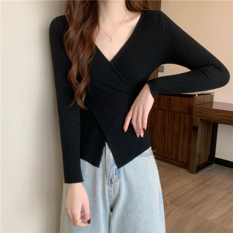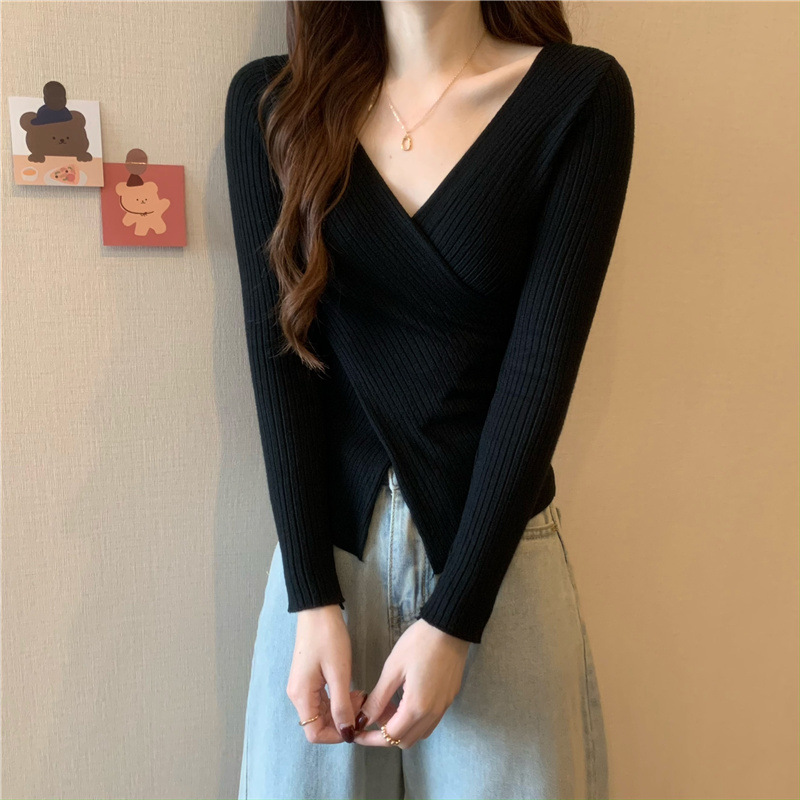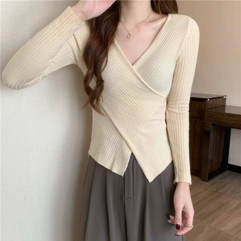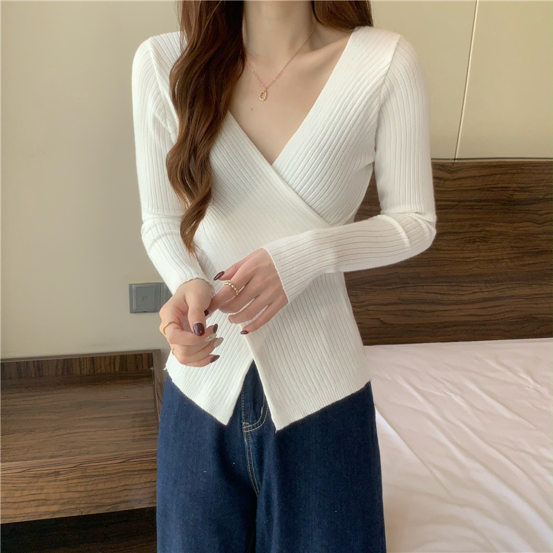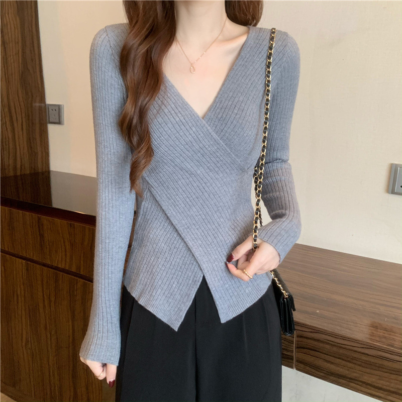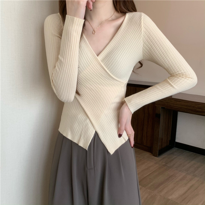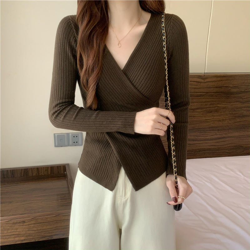 올해의 아름다운 긴팔 스웨터 스웨터 이른 가을 하이 엔드 크로스 v-neck 탑 여성용 이너 베이스 셔츠스토어 가기