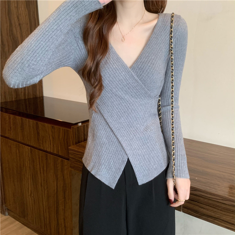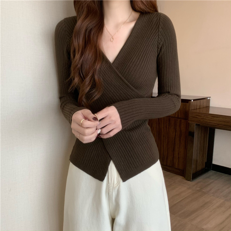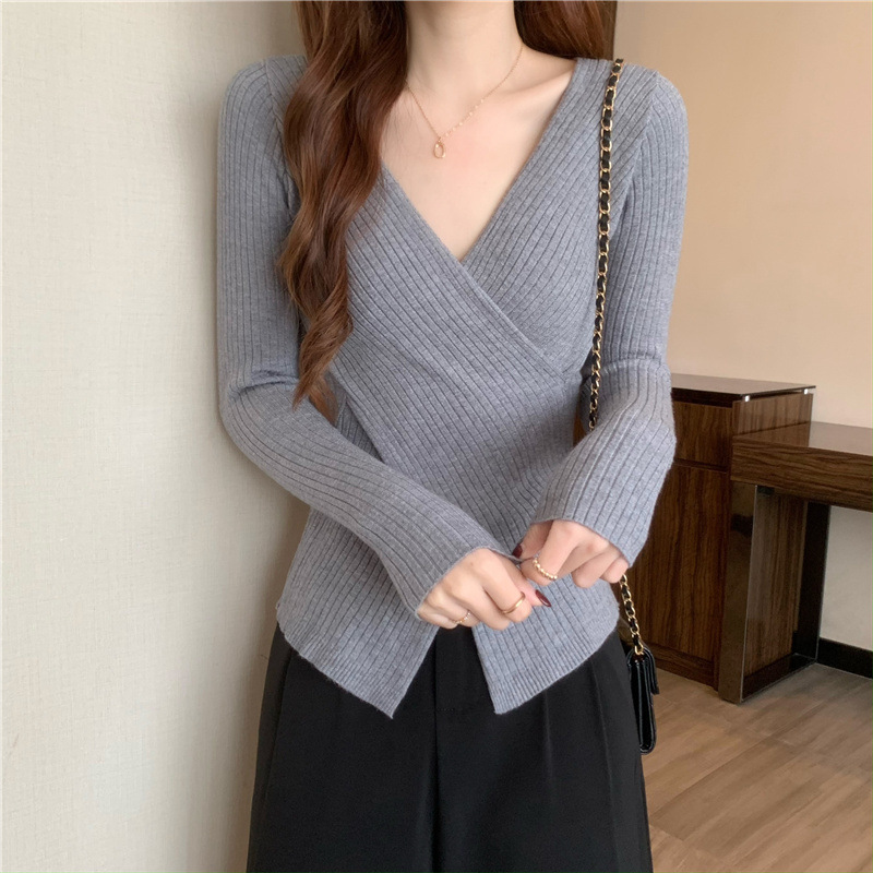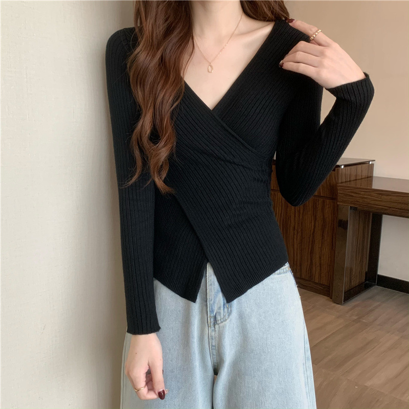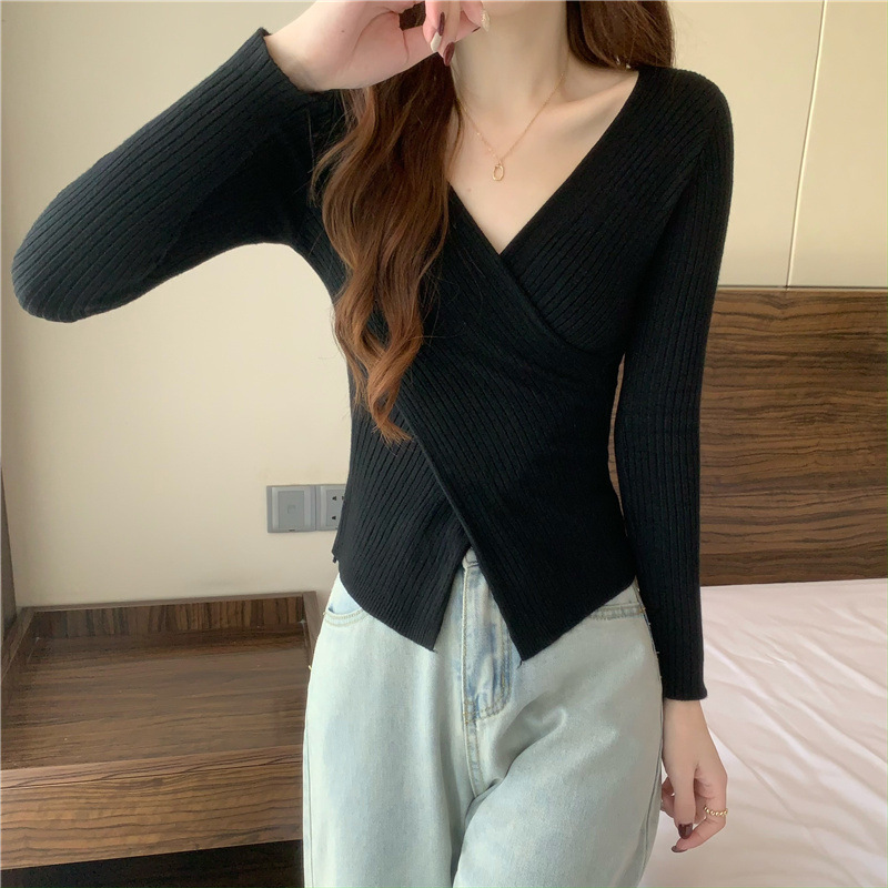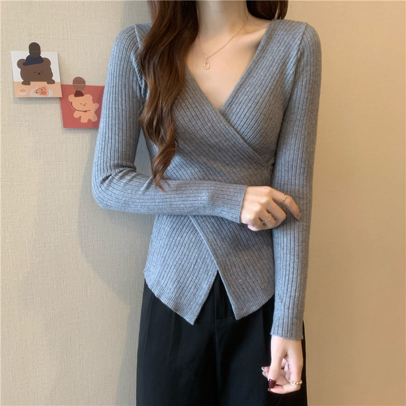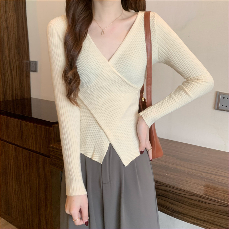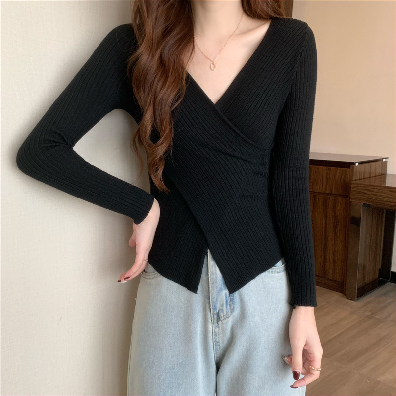 올해의 아름다운 긴팔 스웨터 스웨터 이른 가을 하이 엔드 크로스 v-neck 탑 여성용 이너 베이스 셔츠스토어 가기