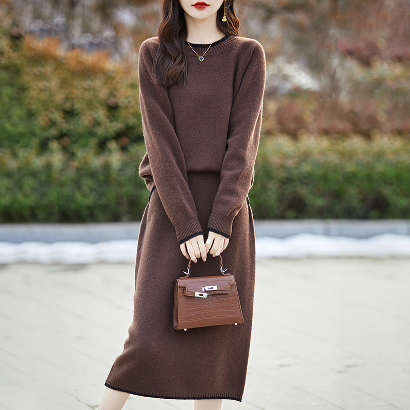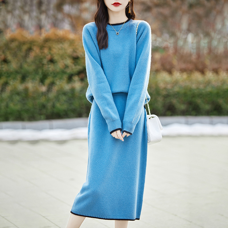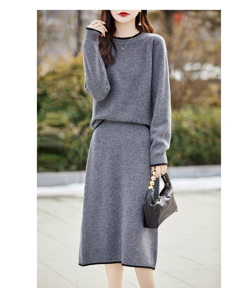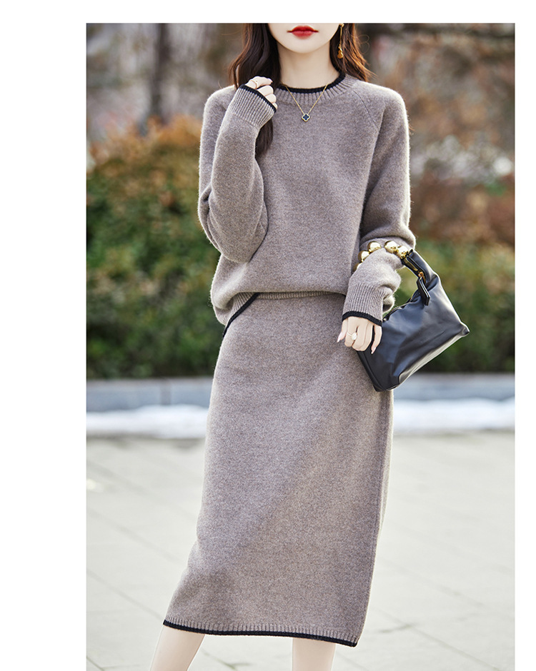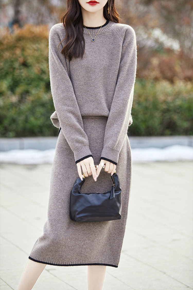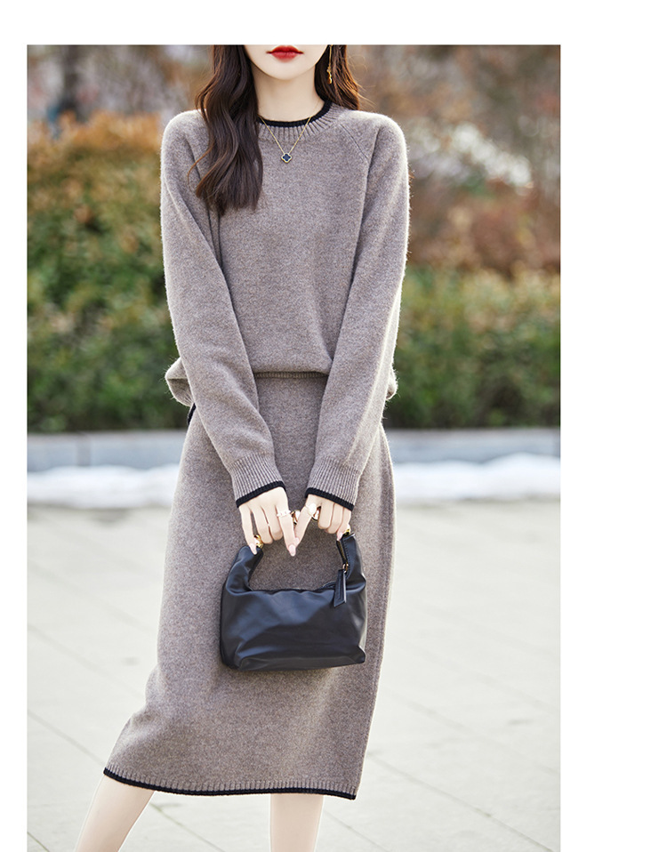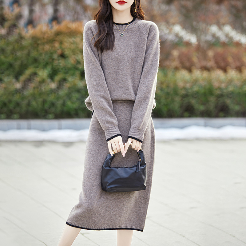 24 가을과 겨울 새로운 라운드 넥 라글란 슬리브 컬러 어울리는 울 원피스 여성 패션 간단한 올 매치 스커트 세트 플러스 사이즈
