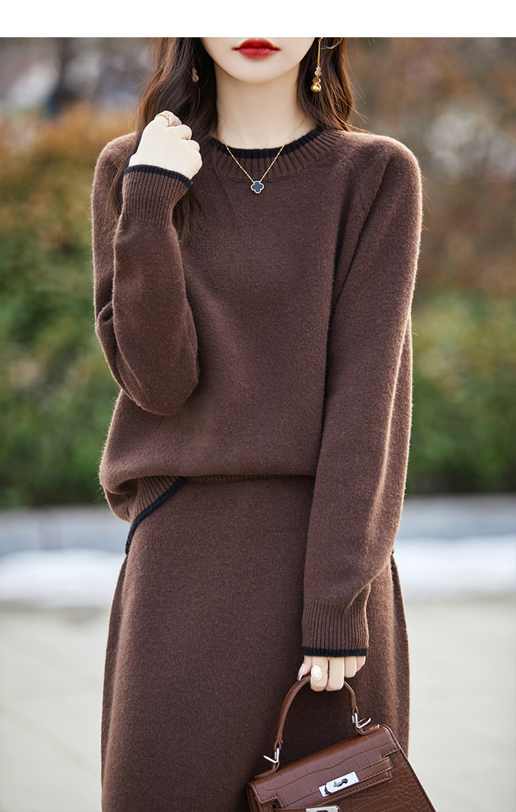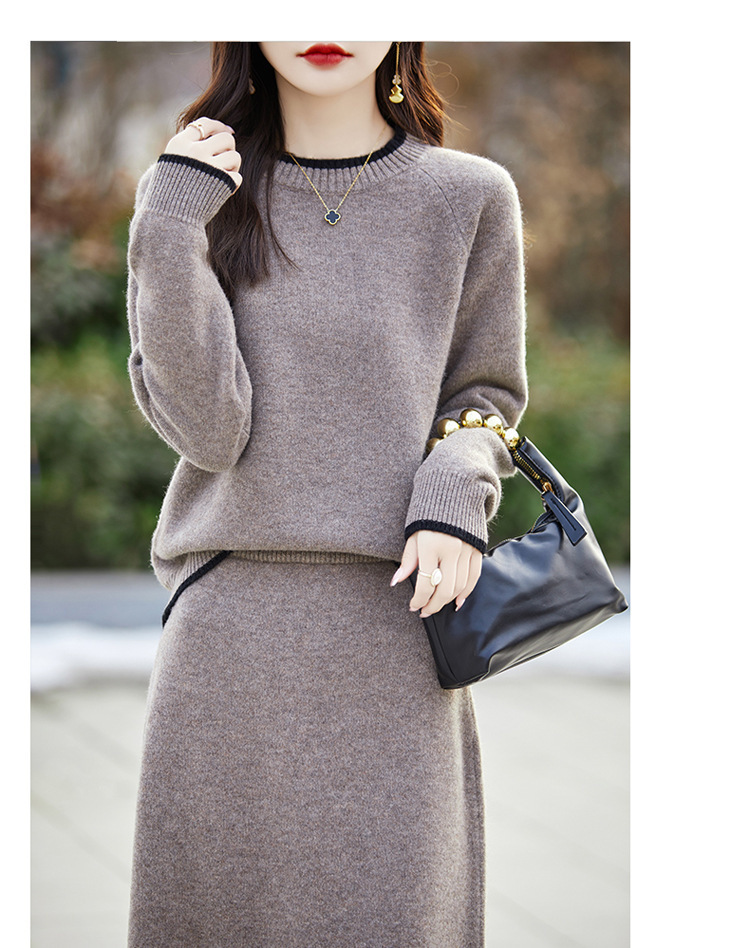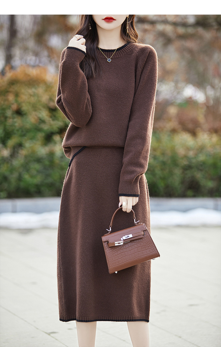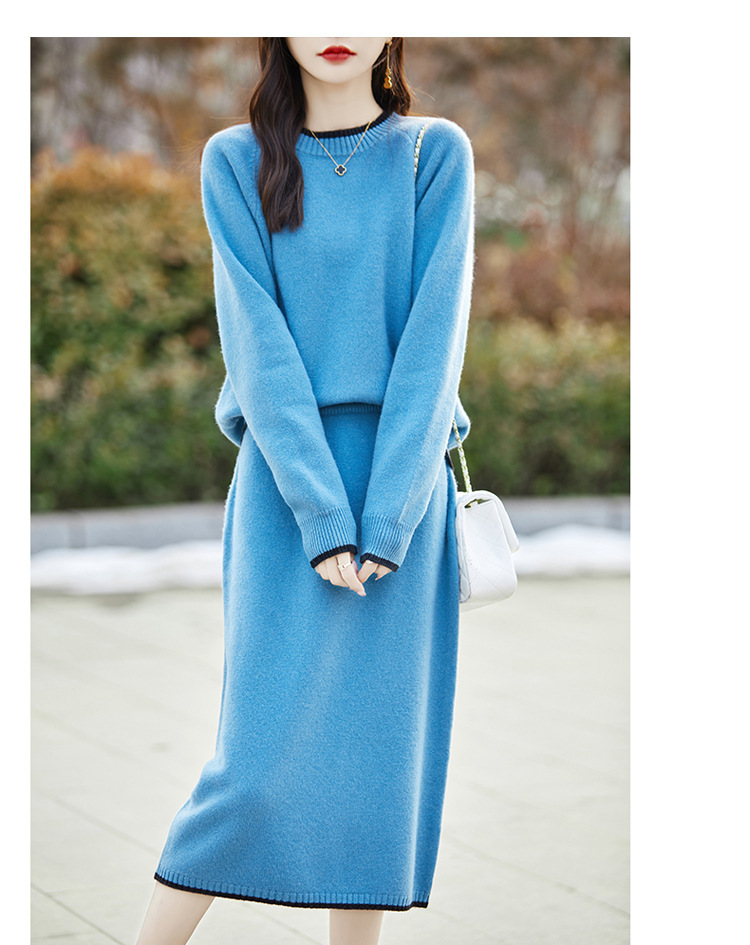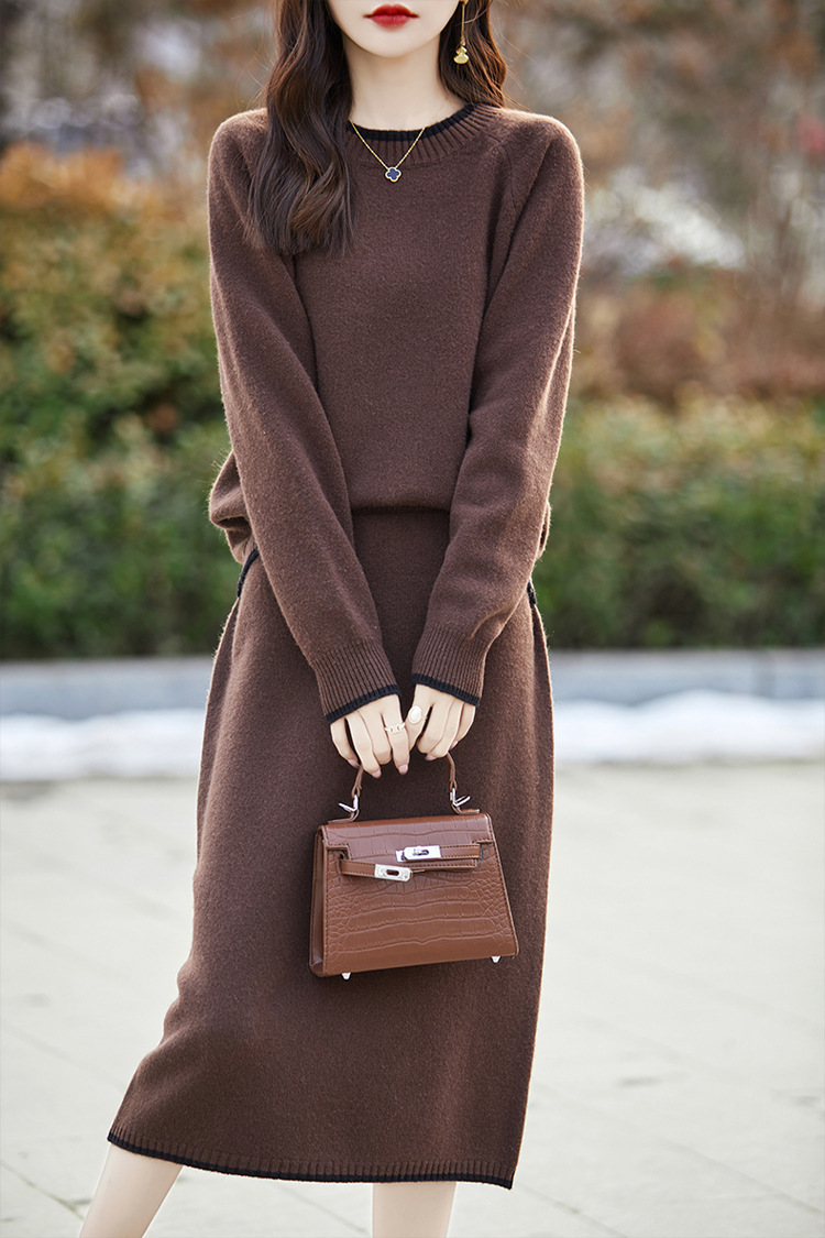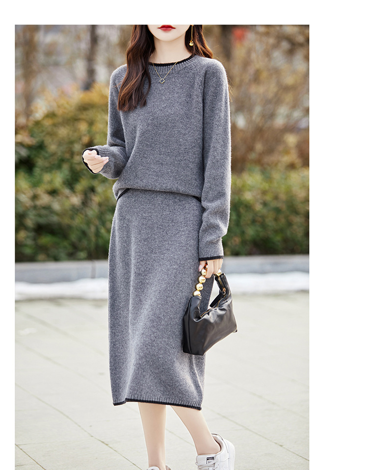 24 가을과 겨울 새로운 라운드 넥 라글란 슬리브 컬러 어울리는 울 원피스 여성 패션 간단한 올 매치 스커트 세트 플러스 사이즈
