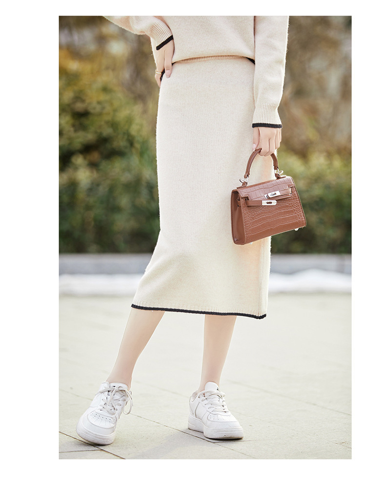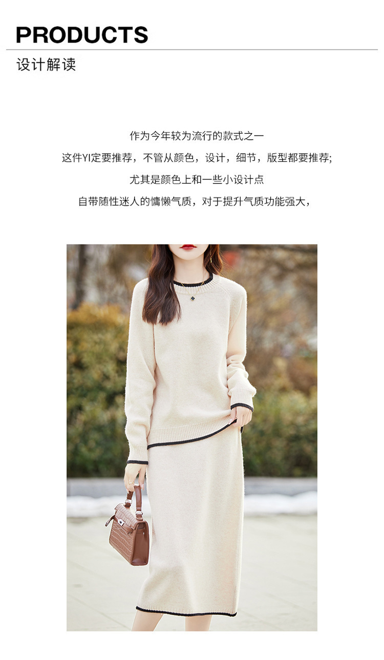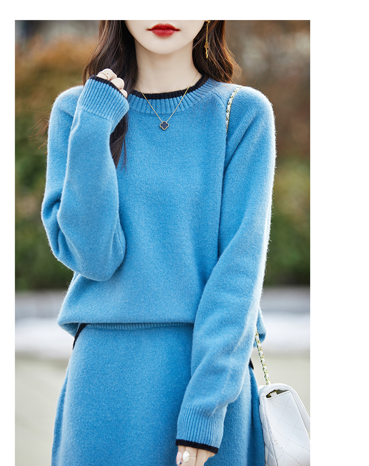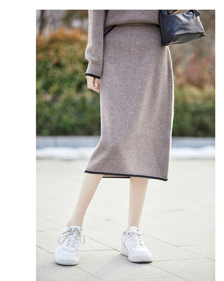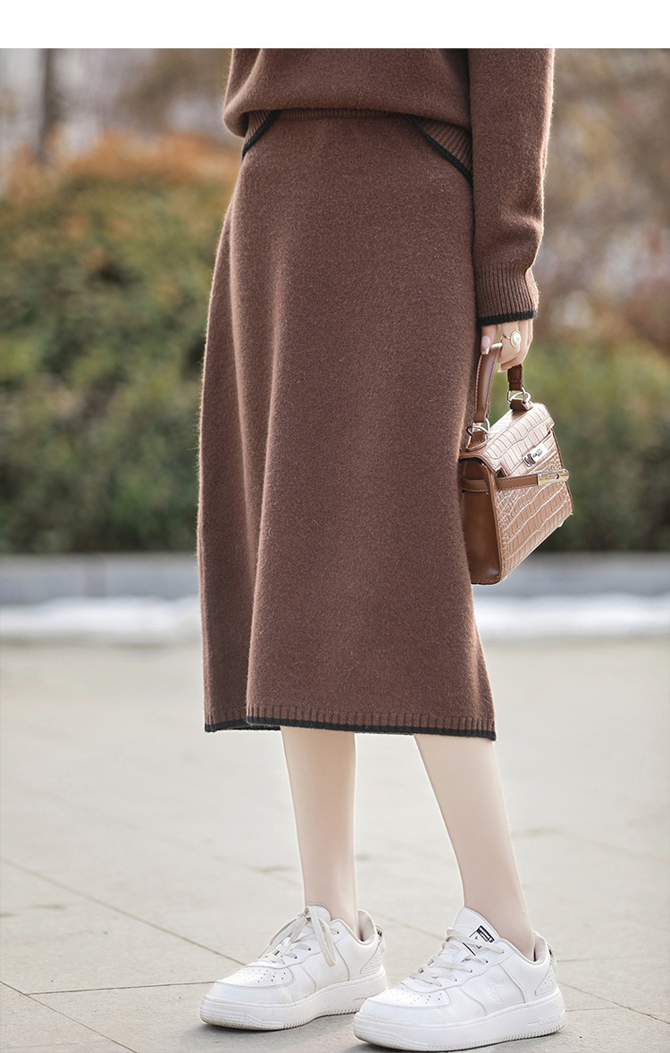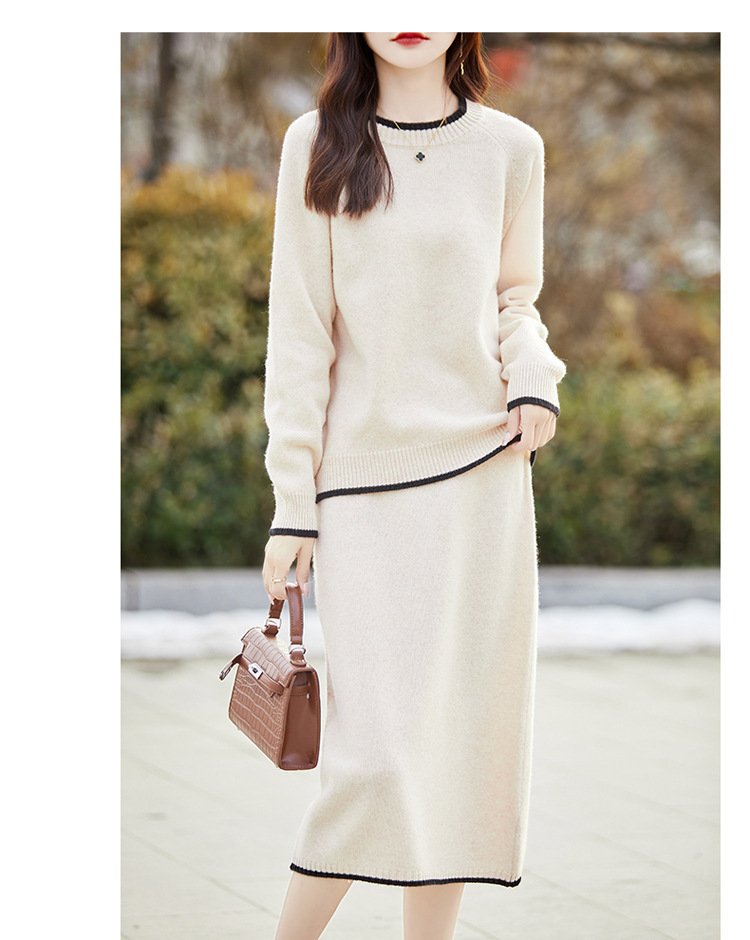 24 가을과 겨울 새로운 라운드 넥 라글란 슬리브 컬러 어울리는 울 원피스 여성 패션 간단한 올 매치 스커트 세트 플러스 사이즈
