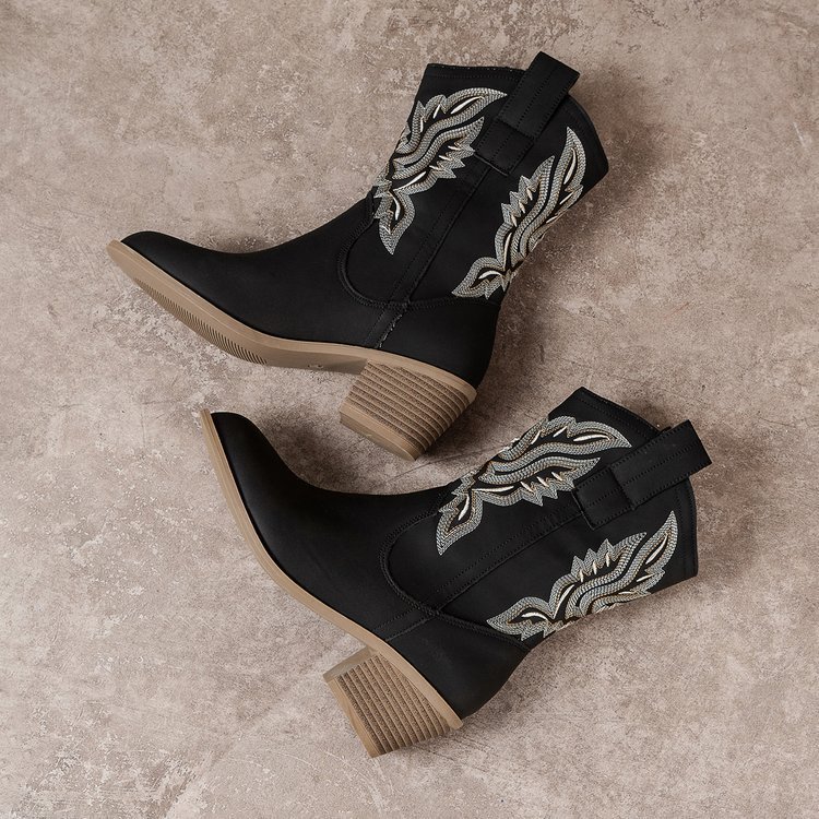 여성용 부츠 2024 가을과 겨울 새로운 V-입 자수 슬리브 두꺼운 힐 나이트 부츠 레트로 미드 배럴 포인팅 웨스턴 카우보이 부츠
