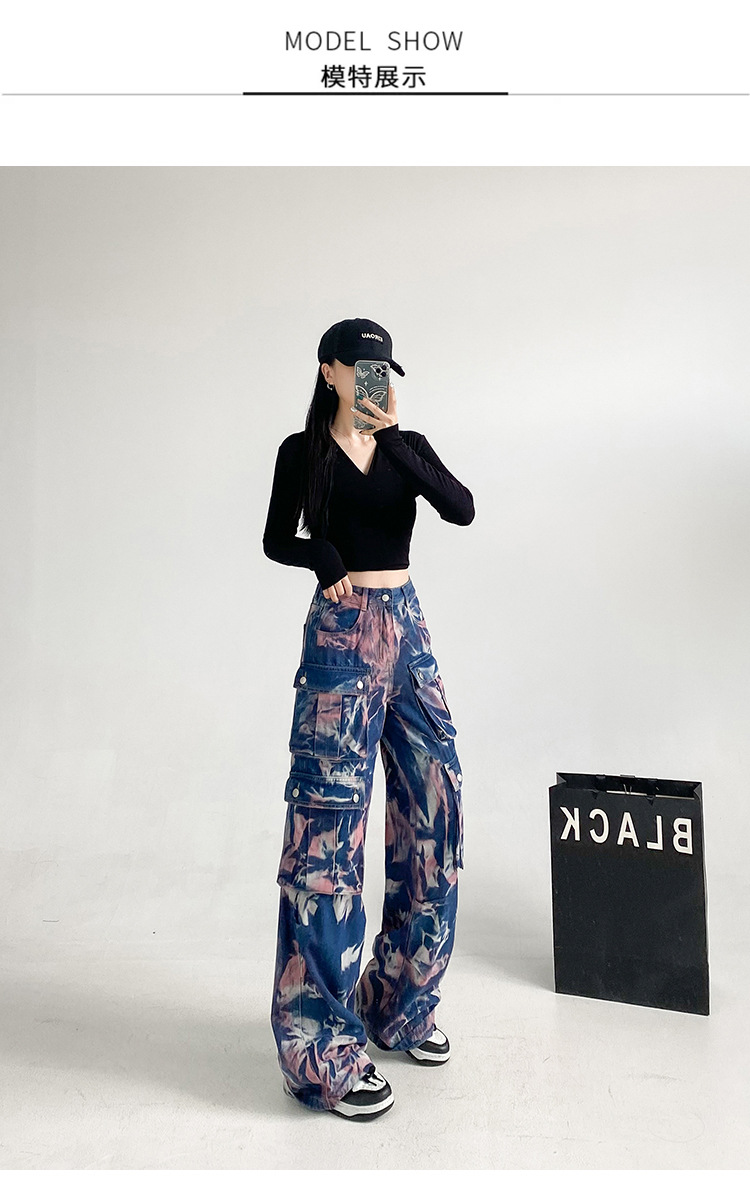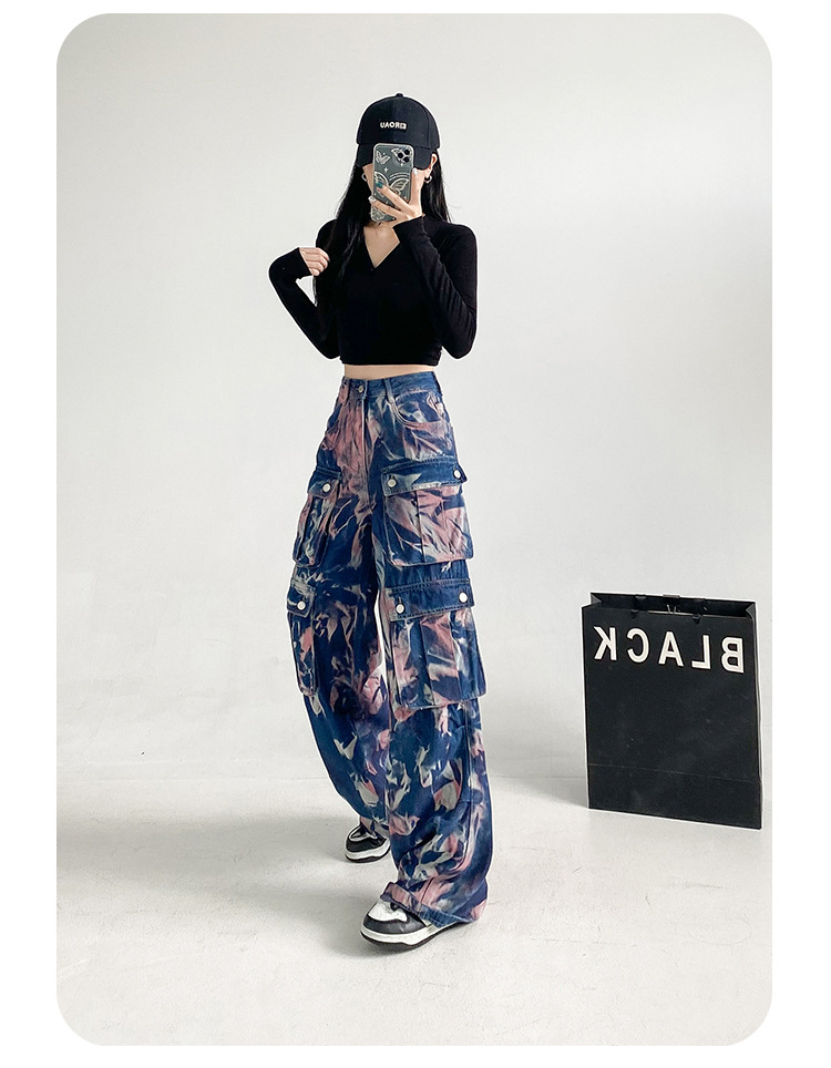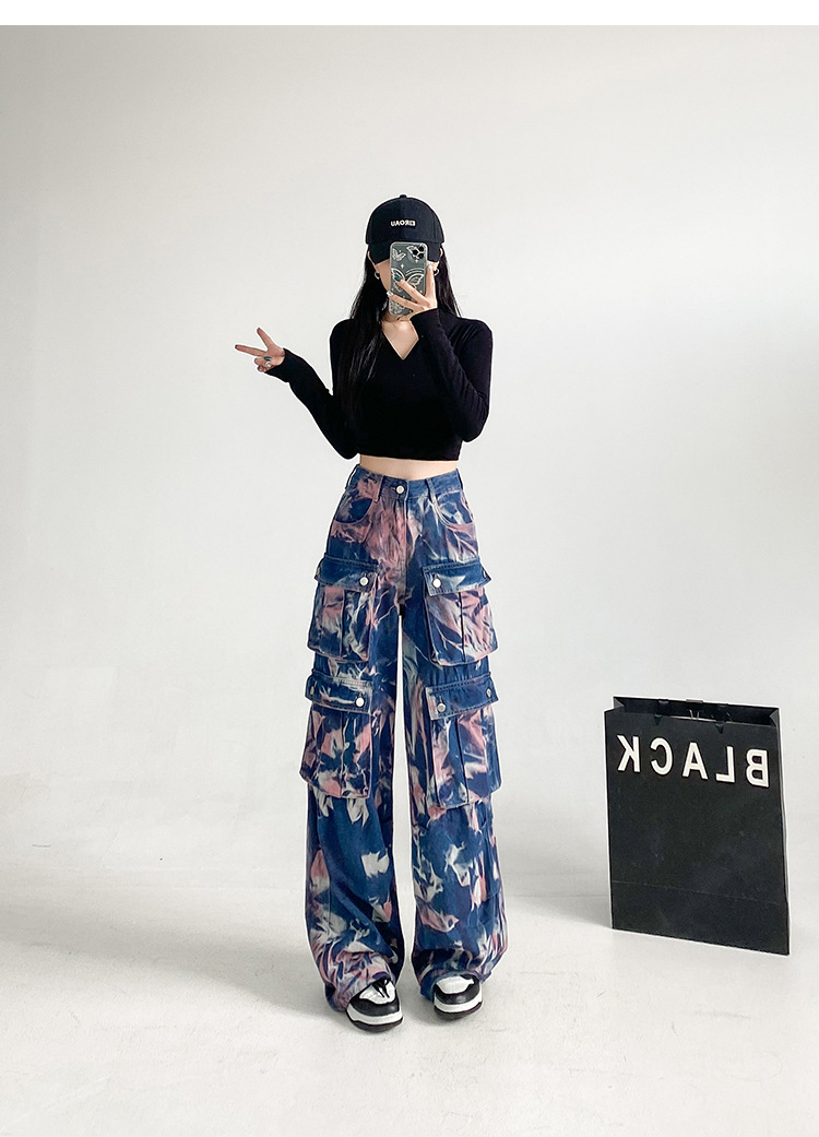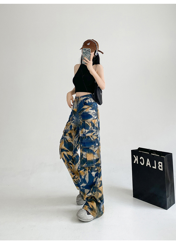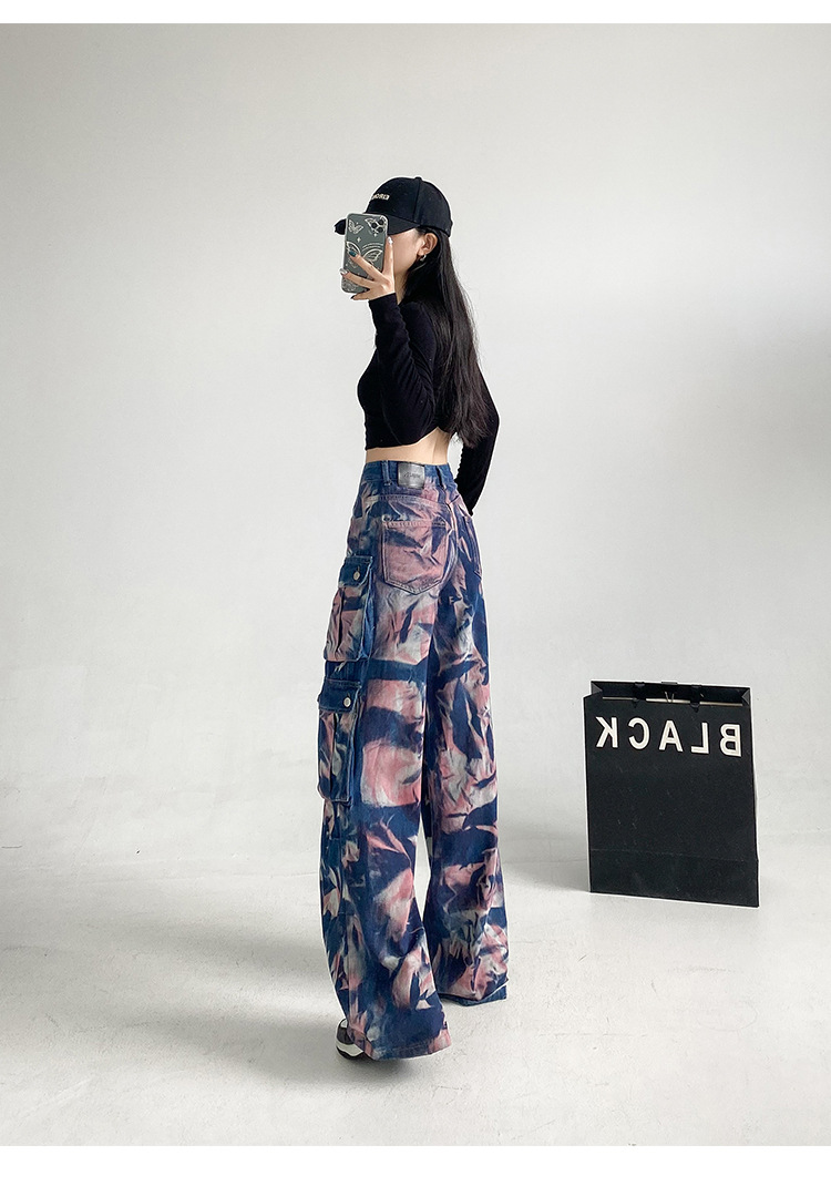 중공업 타이 다이 컬러 캐주얼 스트레이트 청바지 여성의 봄과 가을 새로운 높은 허리 느슨한 슬리밍 올 매치 와이드 다리 오버볼스토어 가기