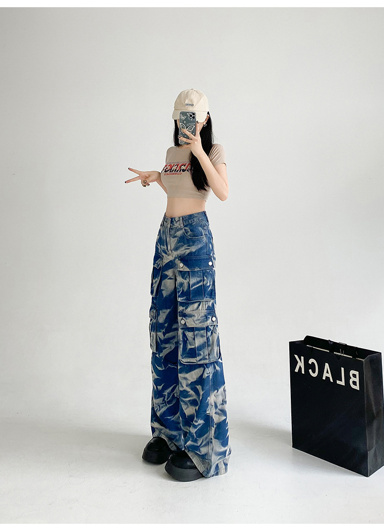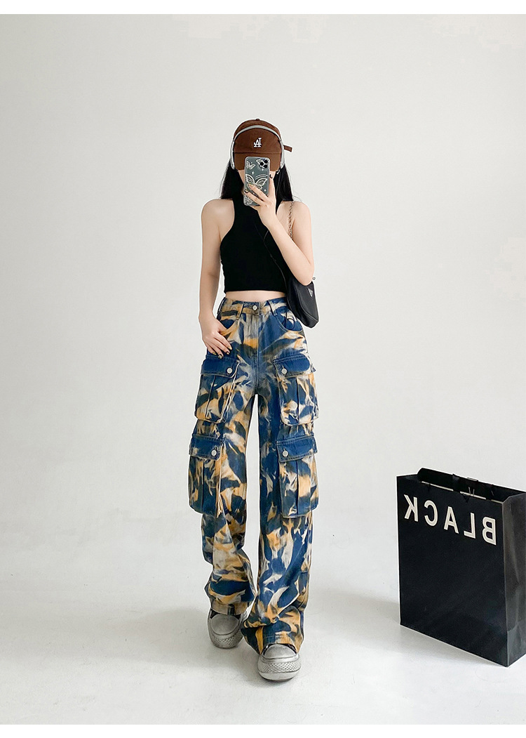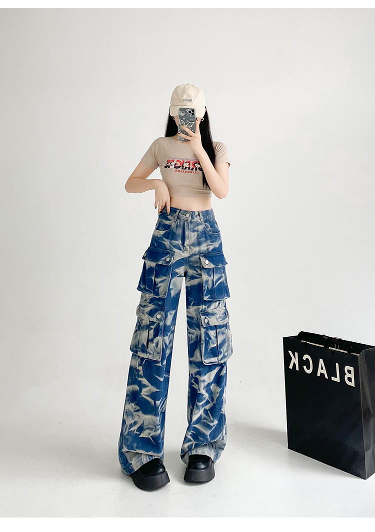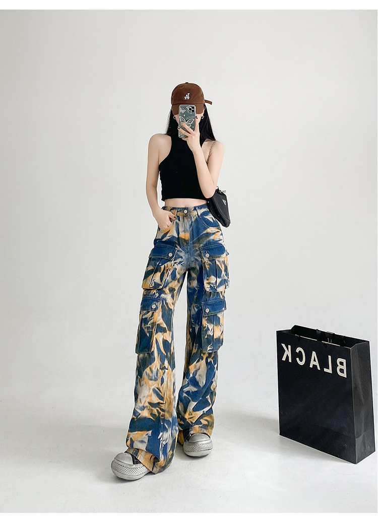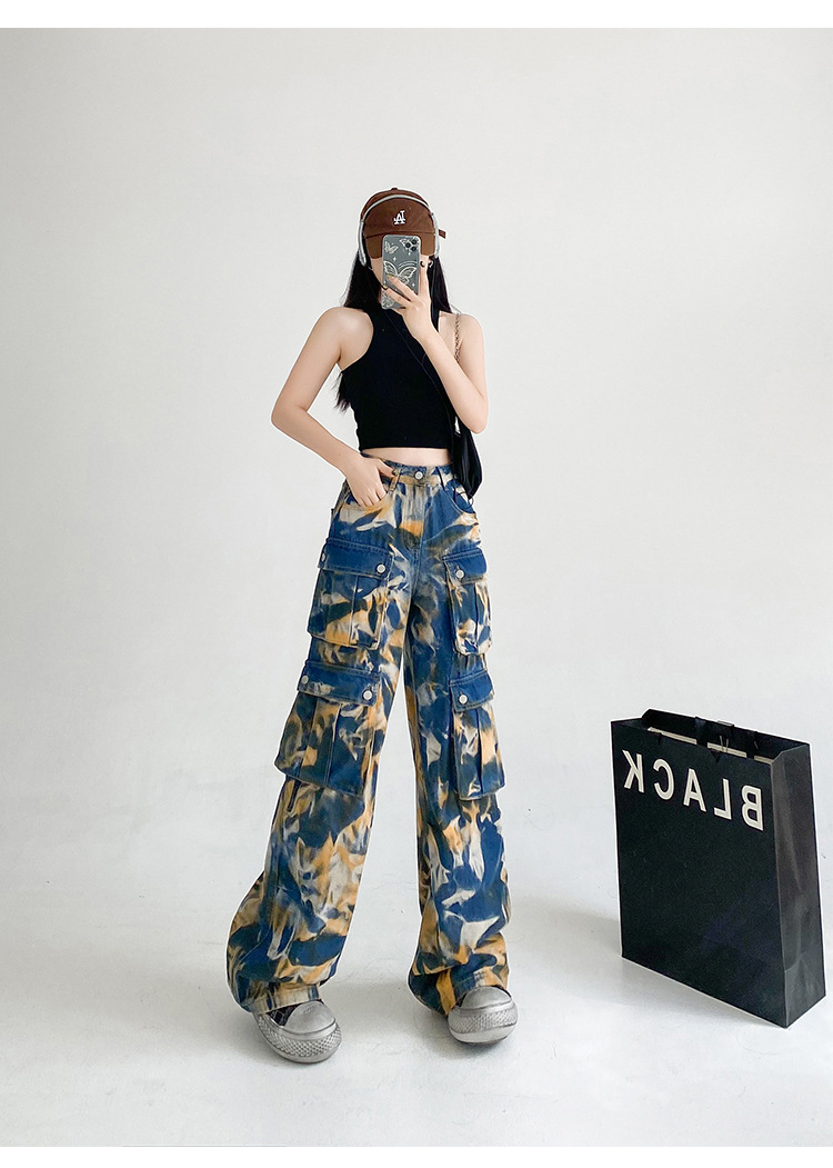 중공업 타이 다이 컬러 캐주얼 스트레이트 청바지 여성의 봄과 가을 새로운 높은 허리 느슨한 슬리밍 올 매치 와이드 다리 오버볼스토어 가기