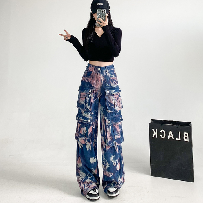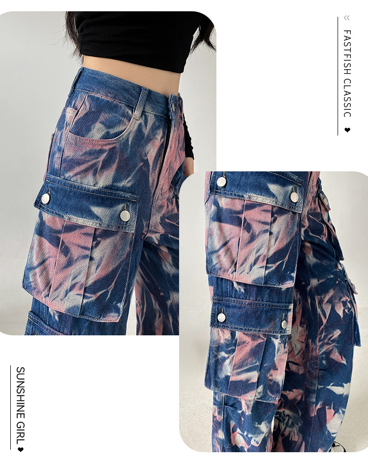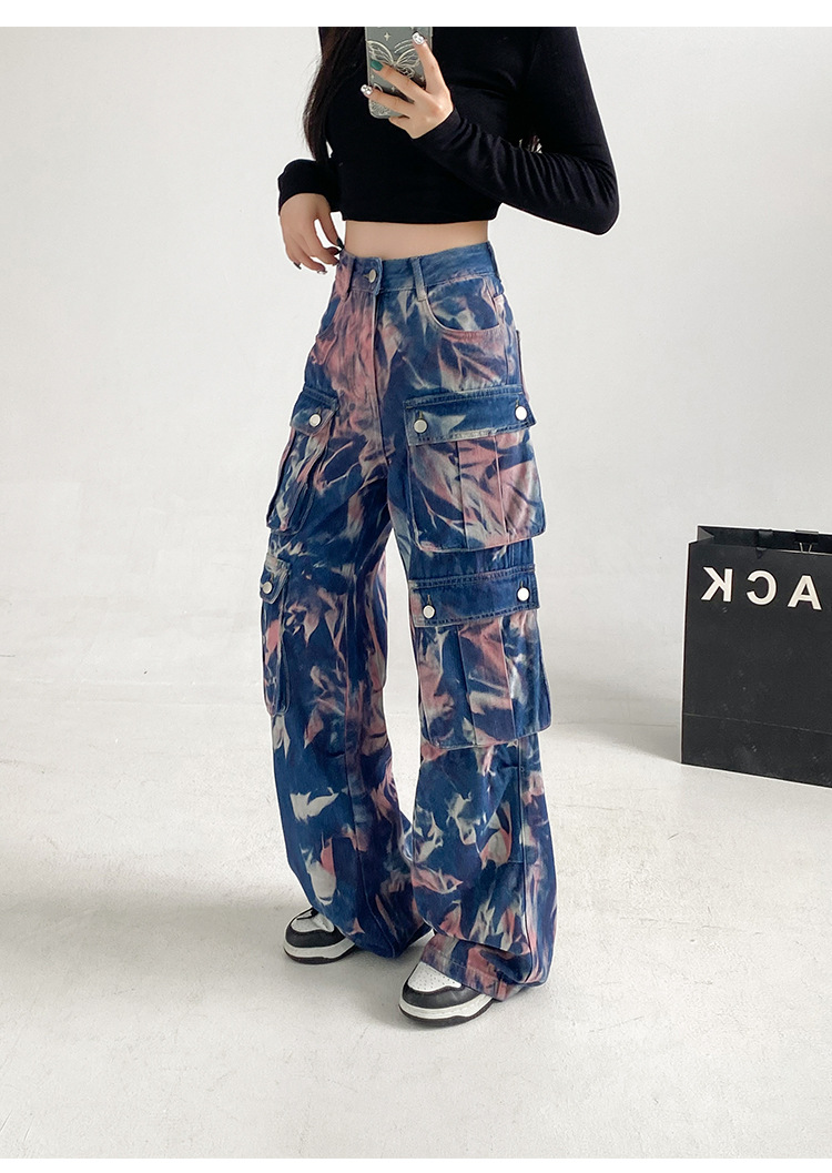 중공업 타이 다이 컬러 캐주얼 스트레이트 청바지 여성의 봄과 가을 새로운 높은 허리 느슨한 슬리밍 올 매치 와이드 다리 오버볼