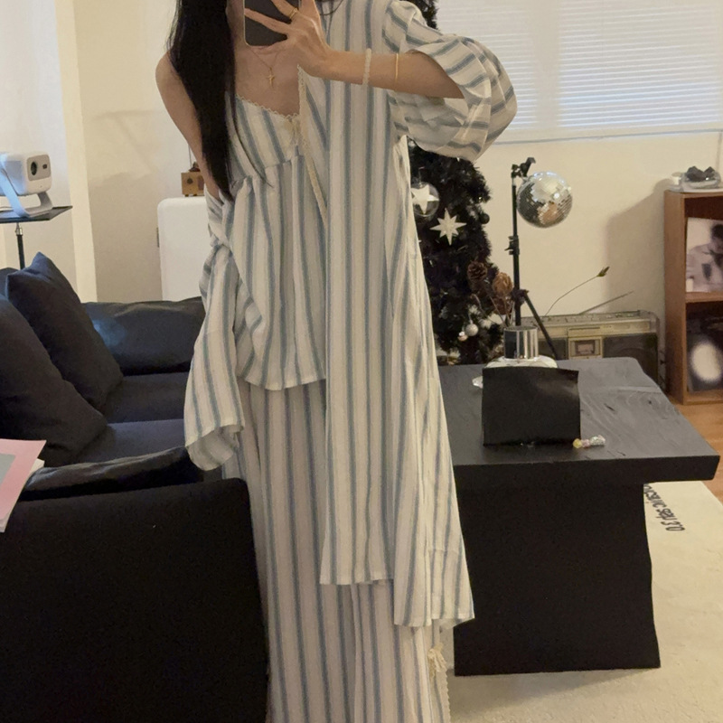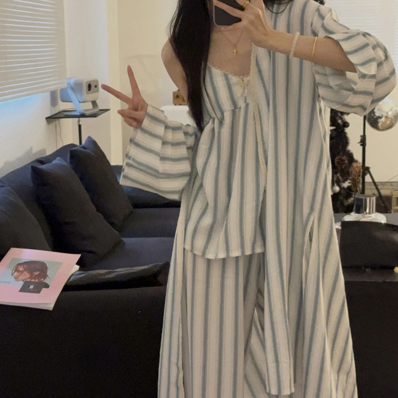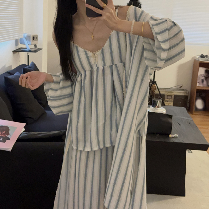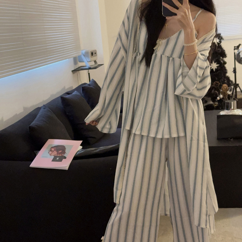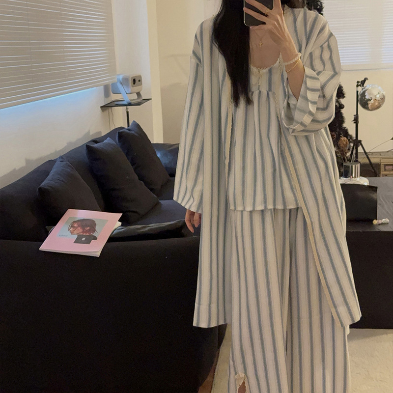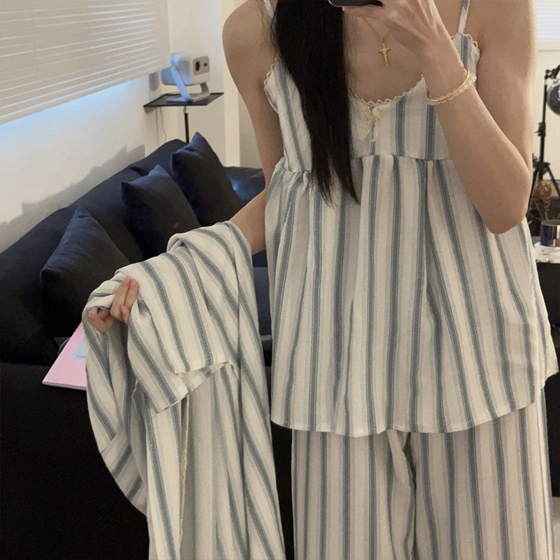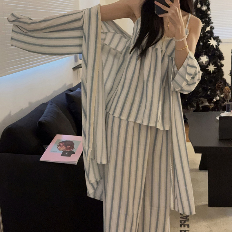 긴 소매 바지 파자마 여성의 봄과 가을 짠 면화 새로운 도착 슬링 가슴 패드 여름 줄무늬 3 조각 세트 외부 착용스토어 가기
