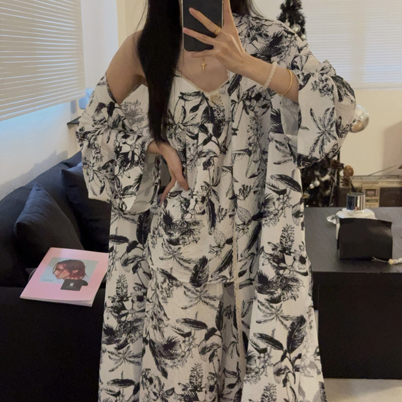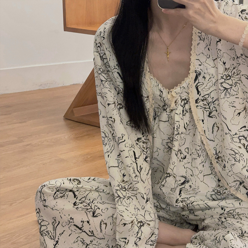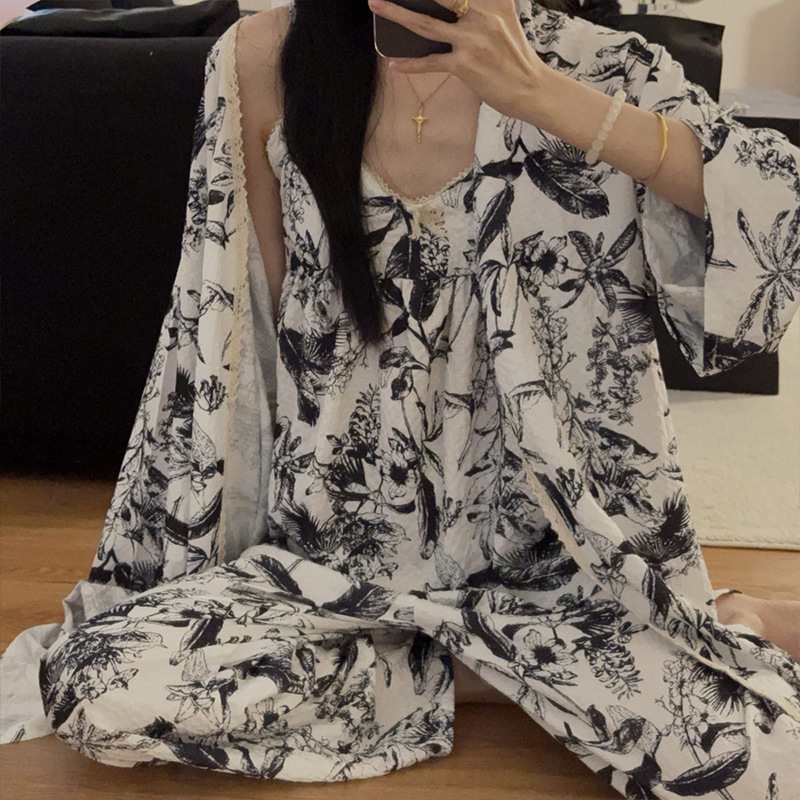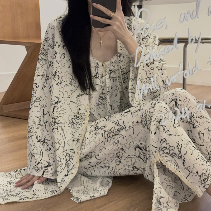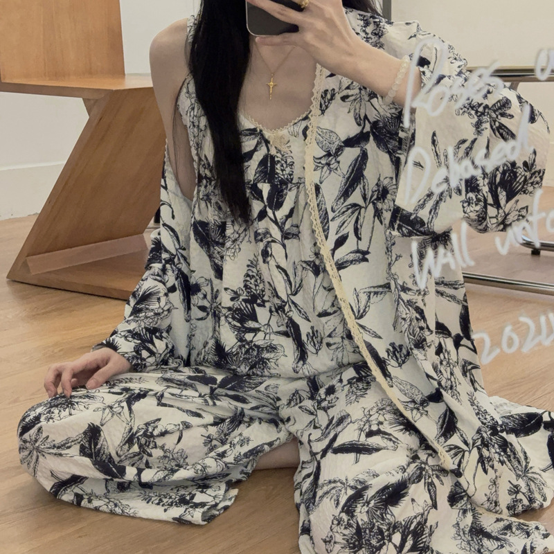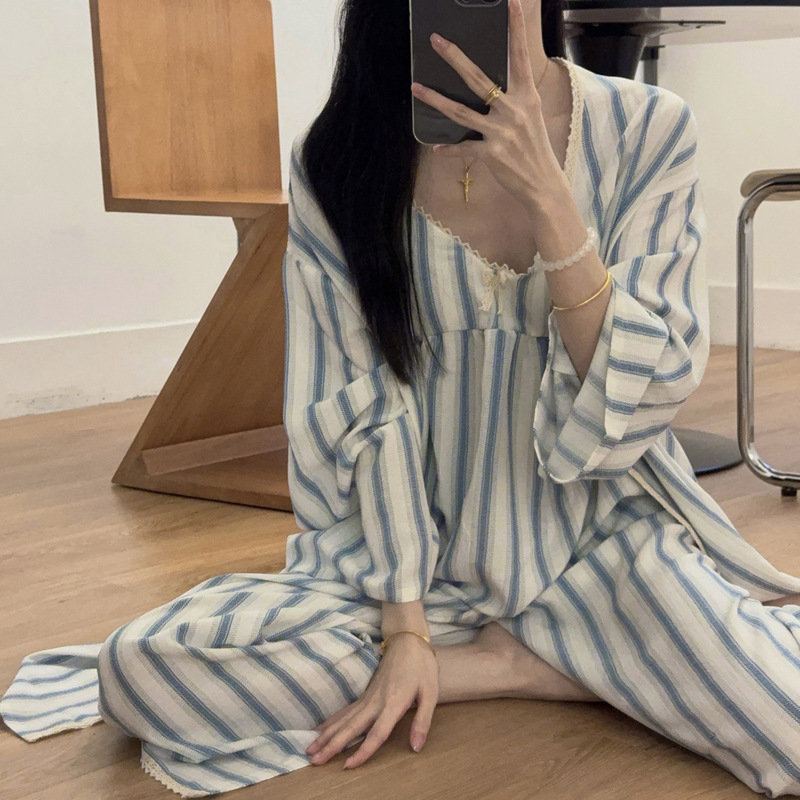 긴 소매 바지 파자마 여성의 봄과 가을 짠 면화 새로운 도착 슬링 가슴 패드 여름 줄무늬 3 조각 세트 외부 착용스토어 가기