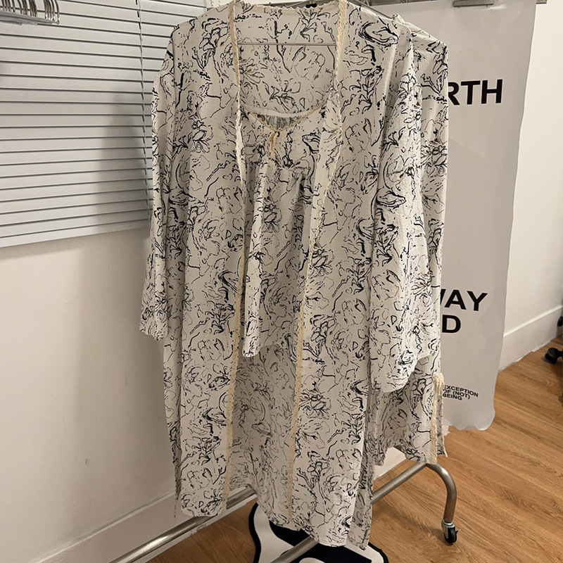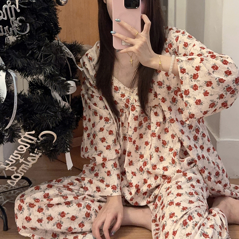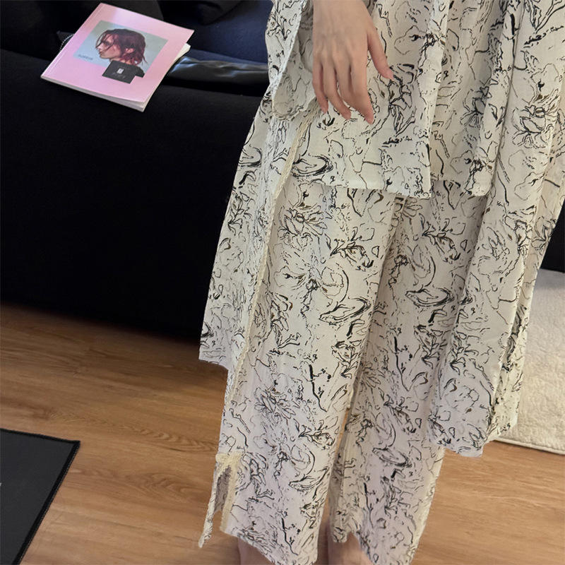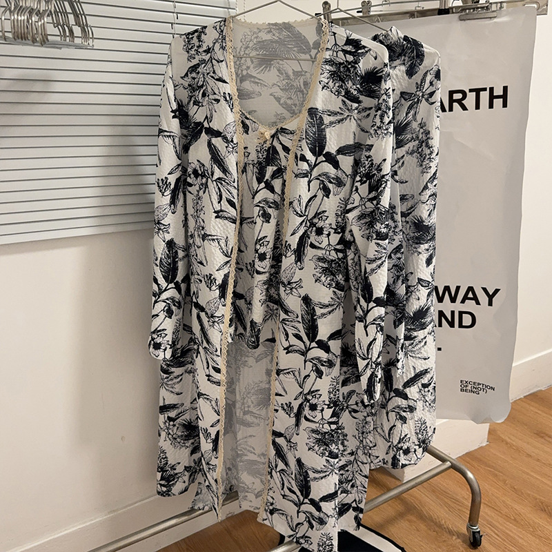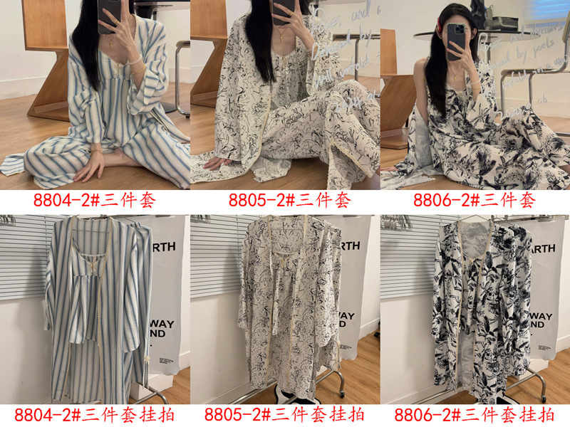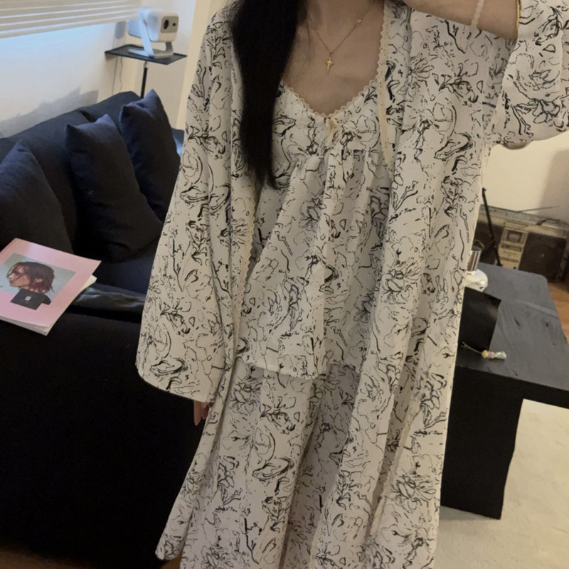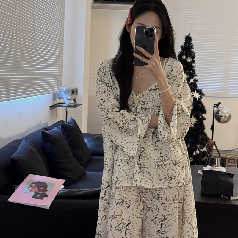 긴 소매 바지 파자마 여성의 봄과 가을 짠 면화 새로운 도착 슬링 가슴 패드 여름 줄무늬 3 조각 세트 외부 착용스토어 가기