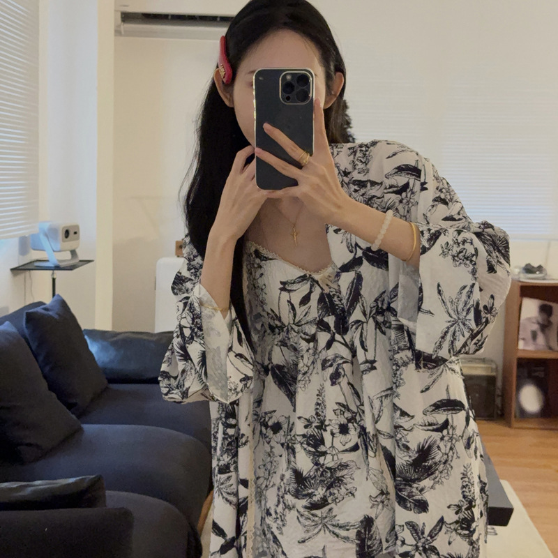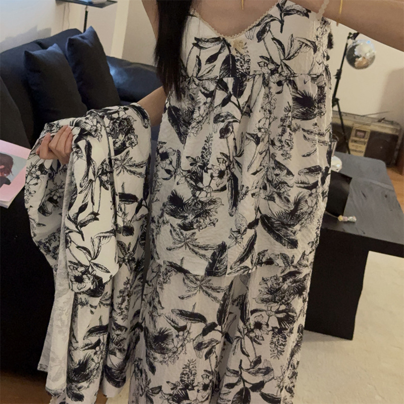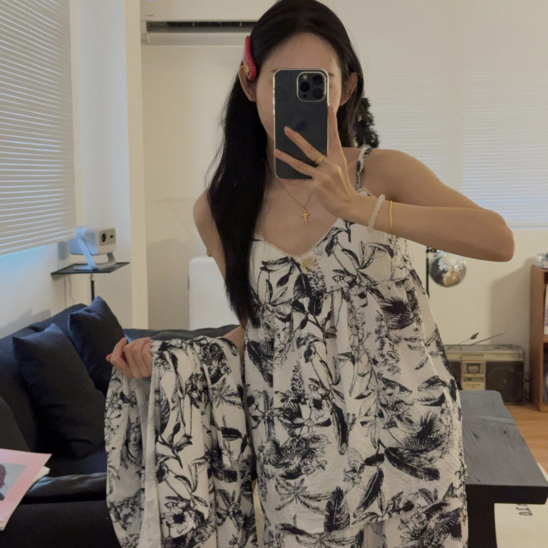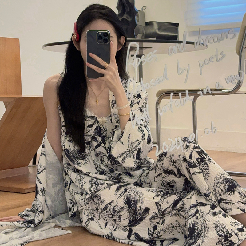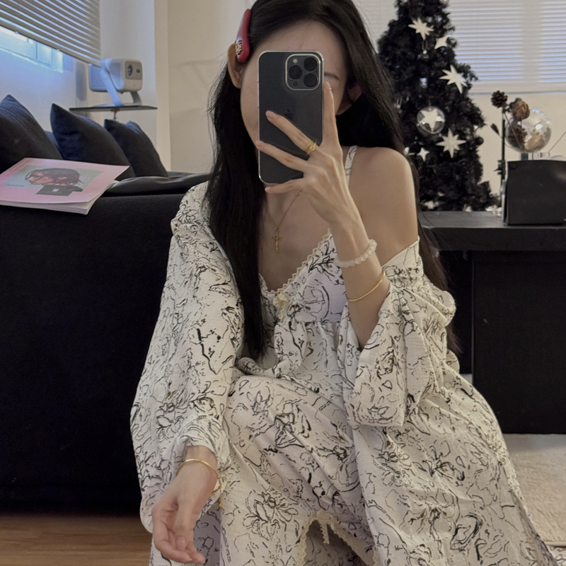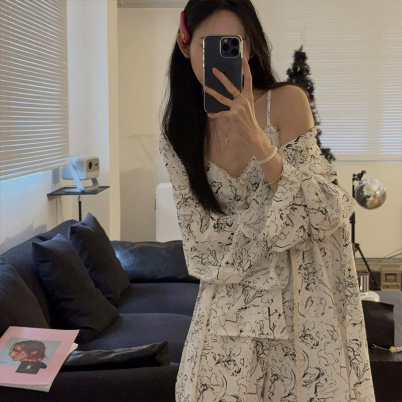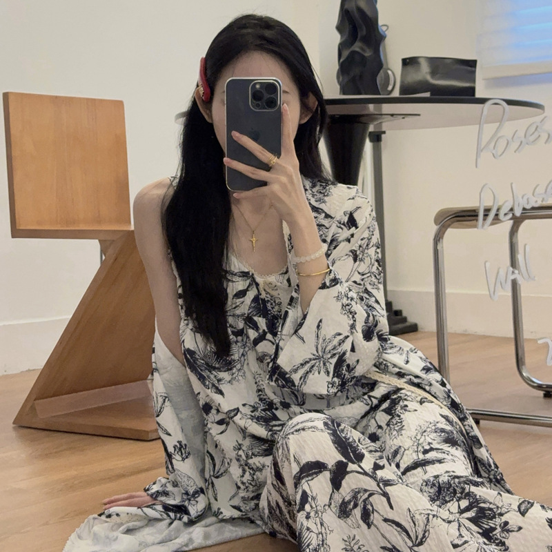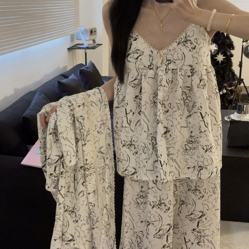 긴 소매 바지 파자마 여성의 봄과 가을 짠 면화 새로운 도착 슬링 가슴 패드 여름 줄무늬 3 조각 세트 외부 착용