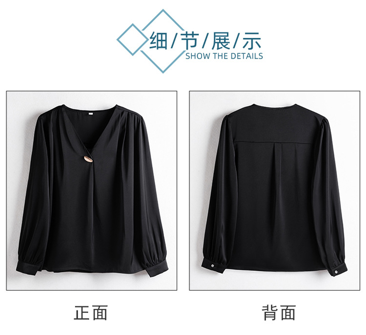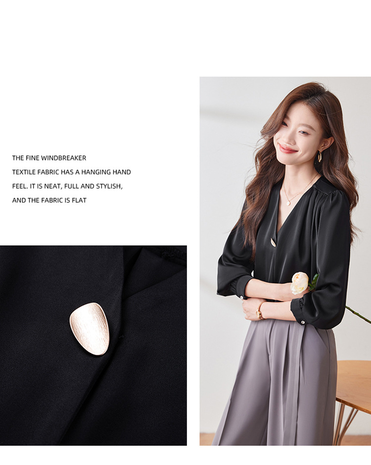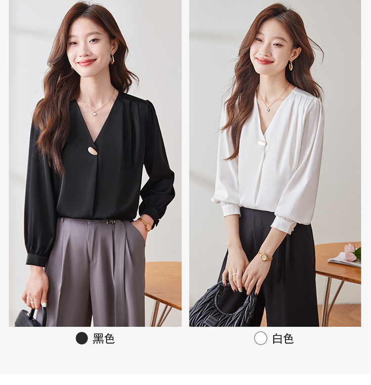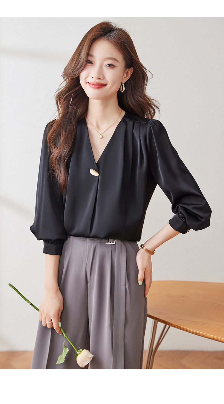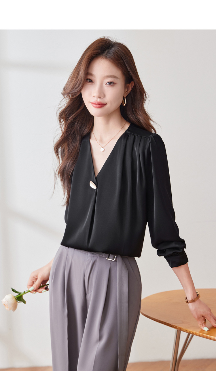 가을 2024 블랙 V 넥 슬림 핏 셔츠 여성용 가을 우아한 긴팔 솔리드 컬러 통근 간단한 셔츠스토어 가기