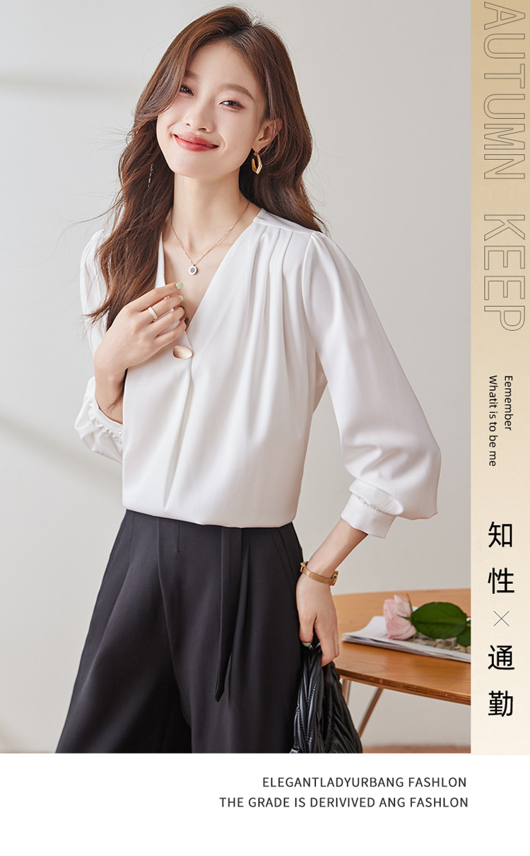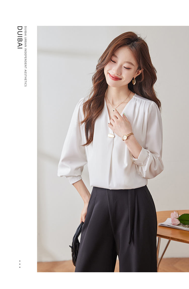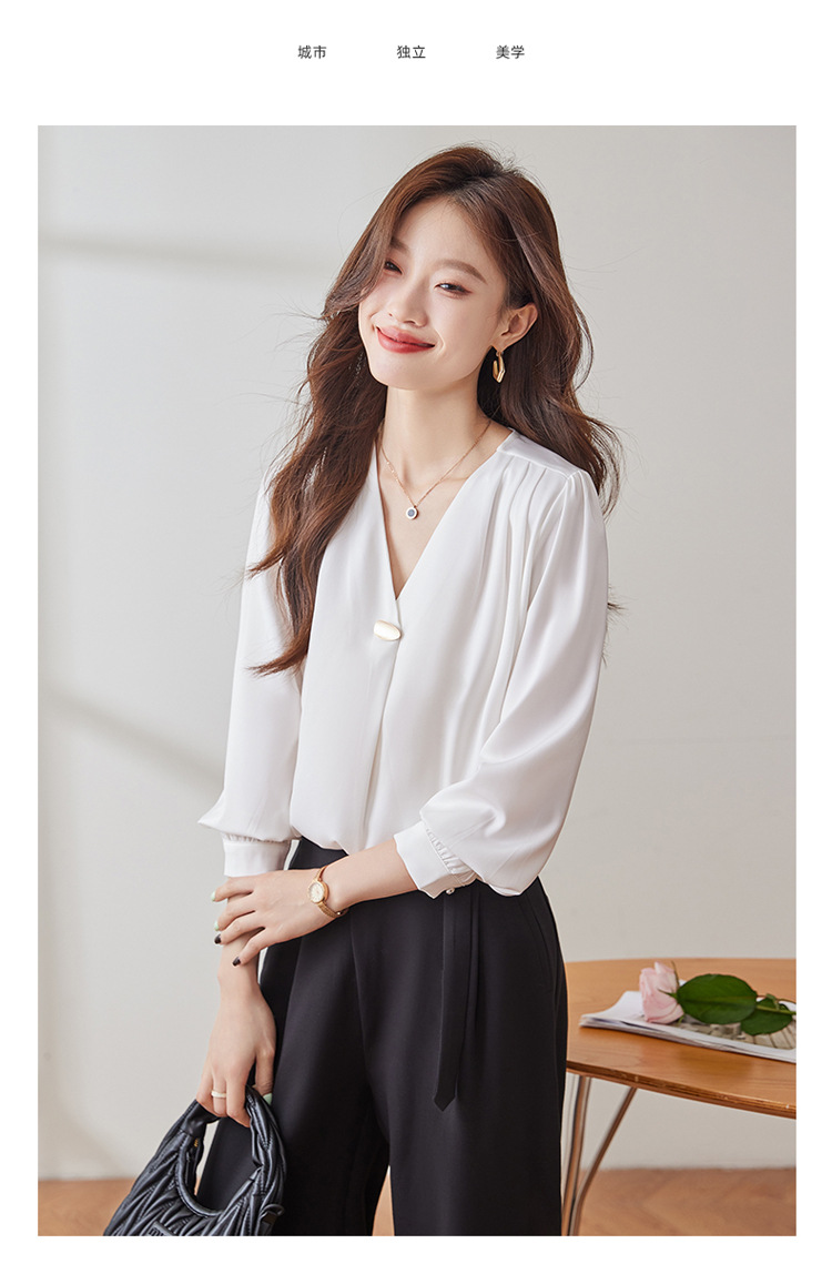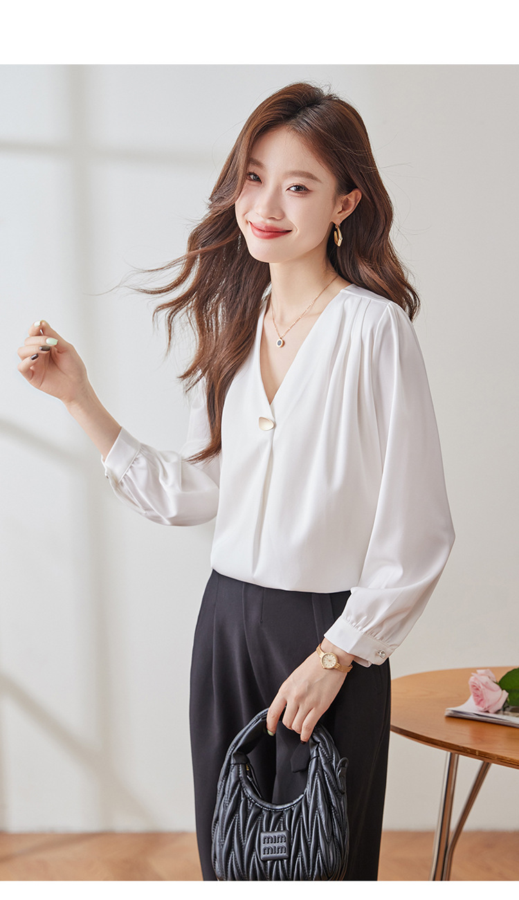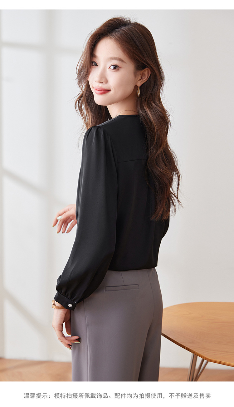 가을 2024 블랙 V 넥 슬림 핏 셔츠 여성용 가을 우아한 긴팔 솔리드 컬러 통근 간단한 셔츠스토어 가기