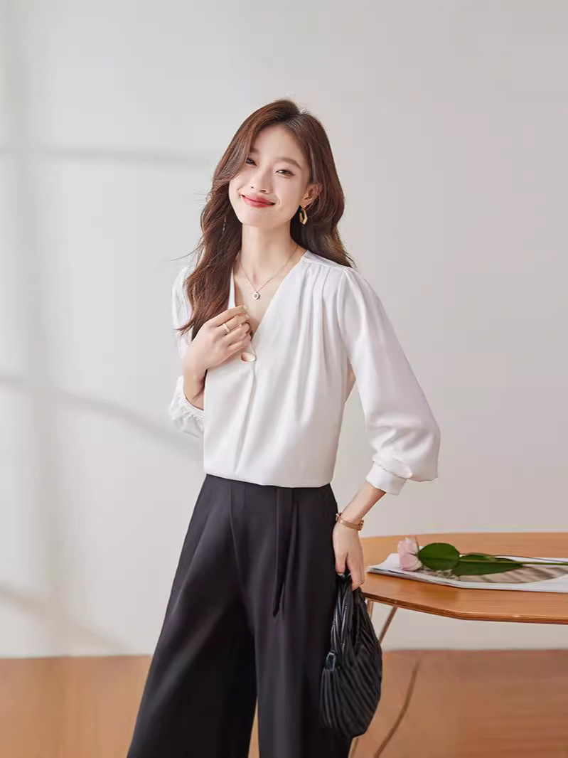 가을 2024 블랙 V 넥 슬림 핏 셔츠 여성용 가을 우아한 긴팔 솔리드 컬러 통근 간단한 셔츠