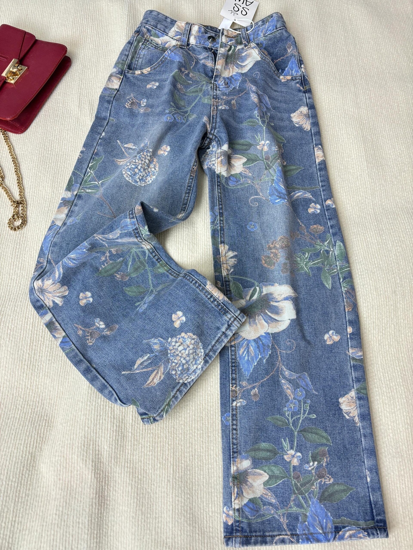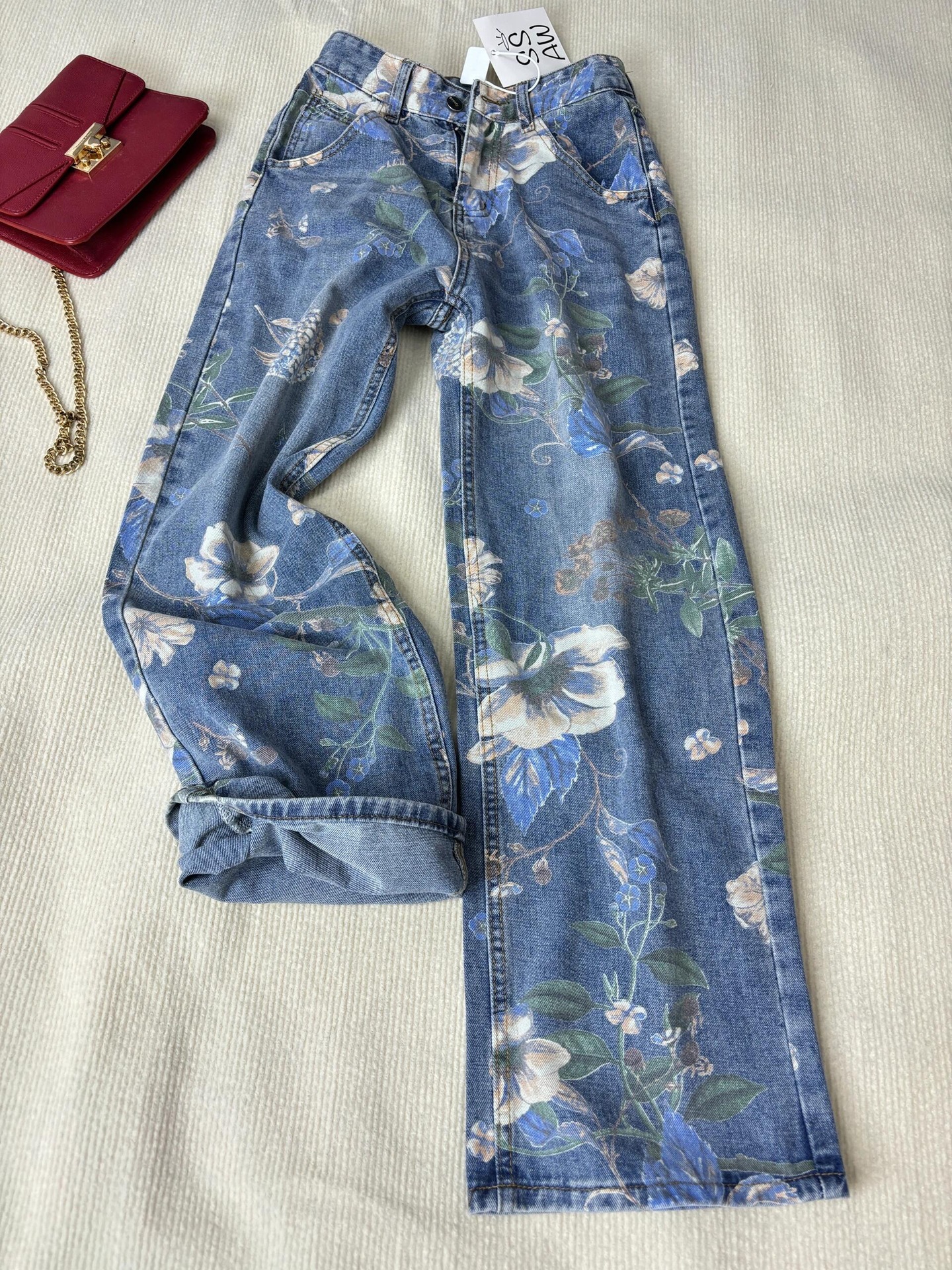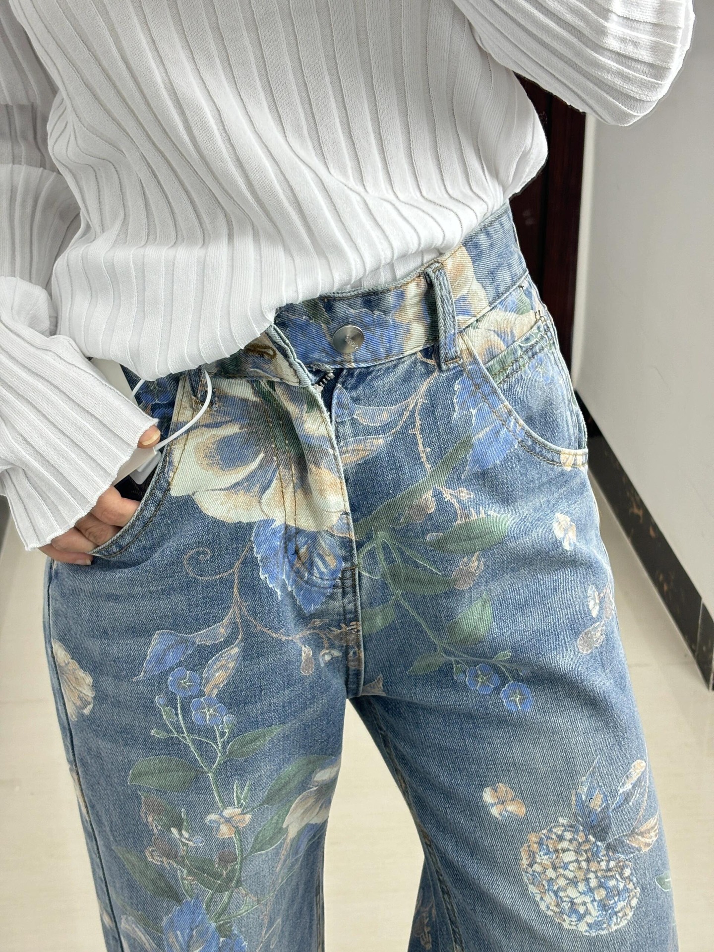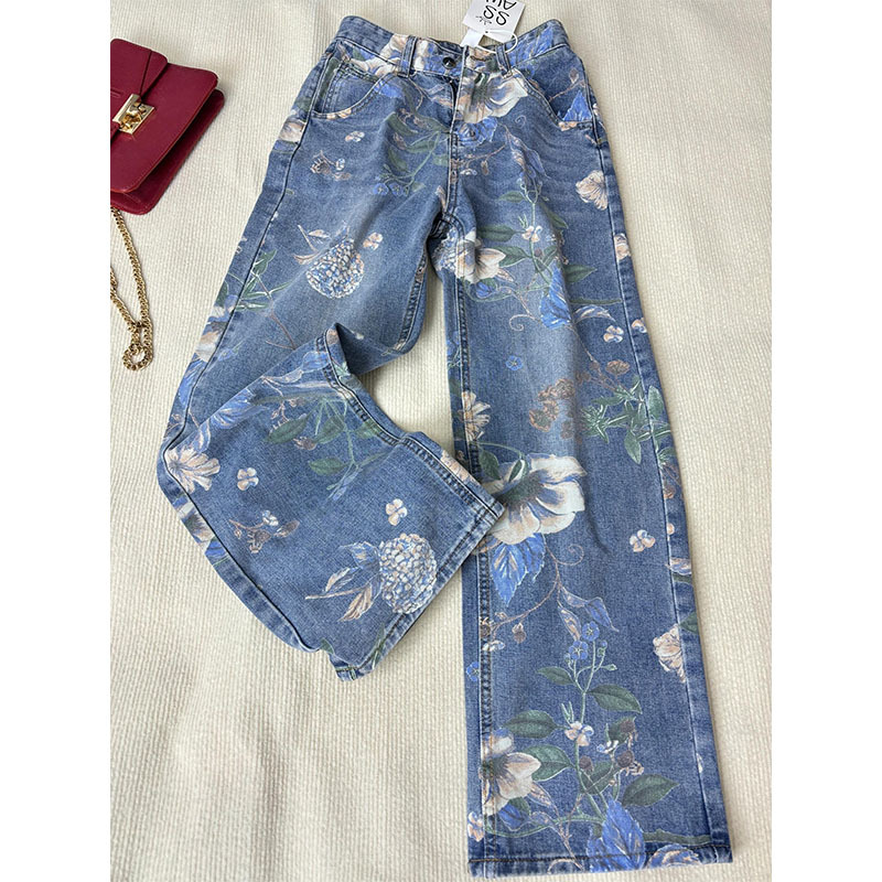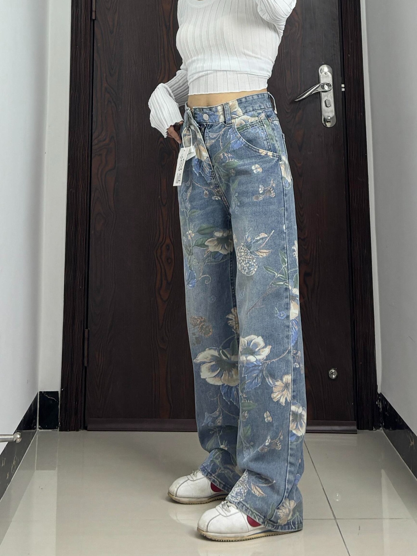 2024 여름 새로운 미국 스타일 레트로 인쇄 된 찢어진 청바지 여성용 올매치 느슨한 스트레이트 와이드 레그 바지