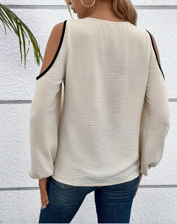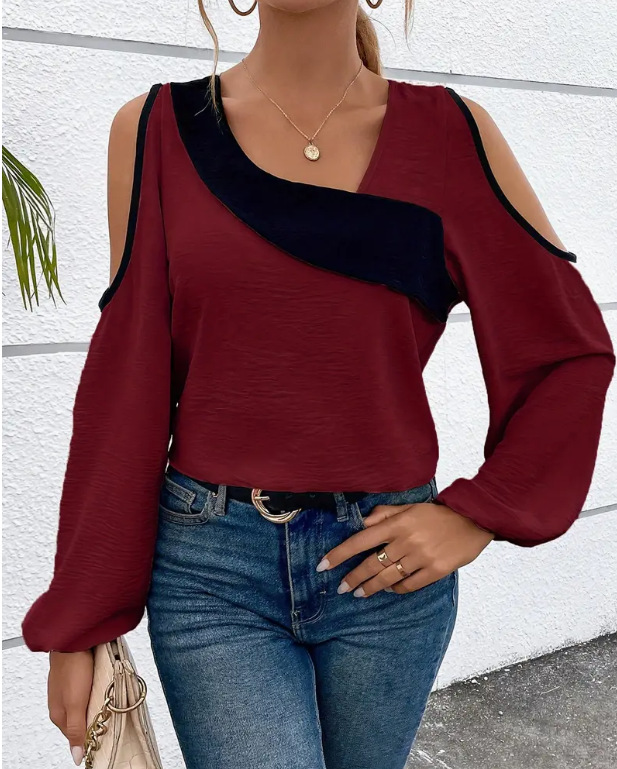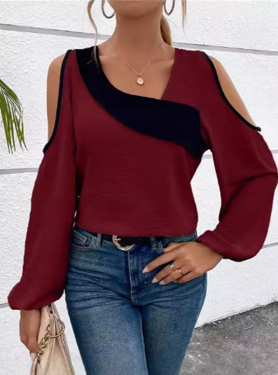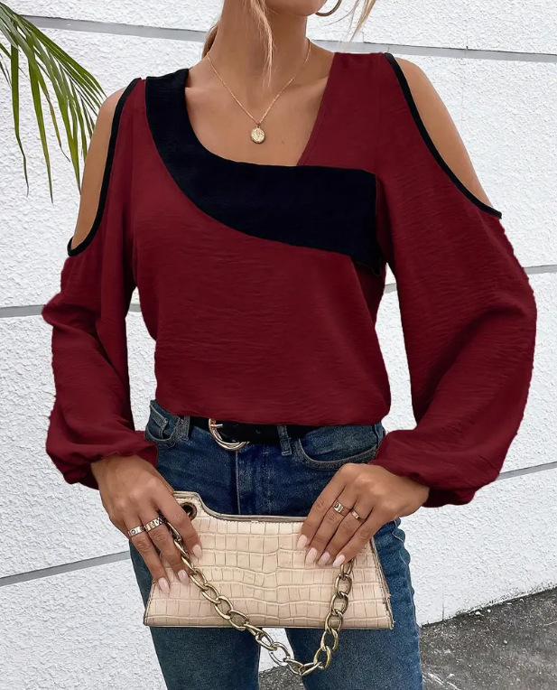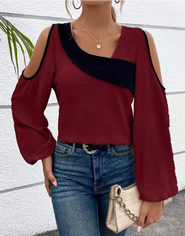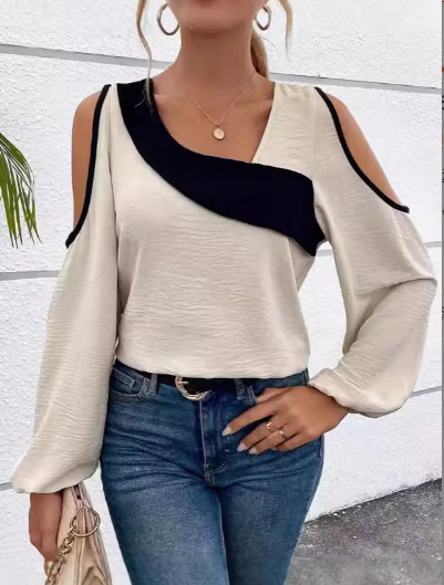 아마존 유럽 및 미국 해외배송 2024 봄/가을 신상 오프숄더 패치워크 슬리브리스 비스듬한 넥라인 긴팔 루즈핏 셔츠