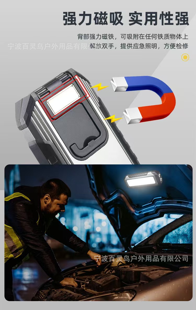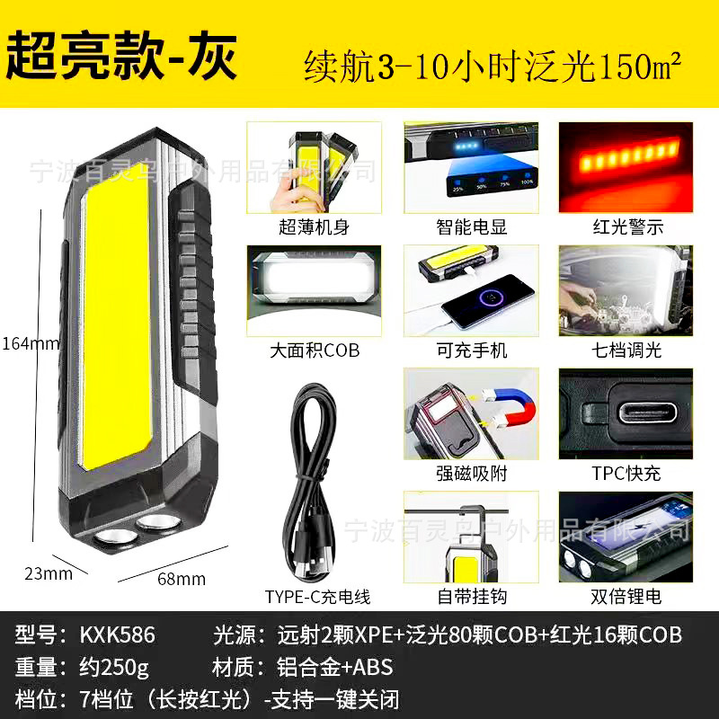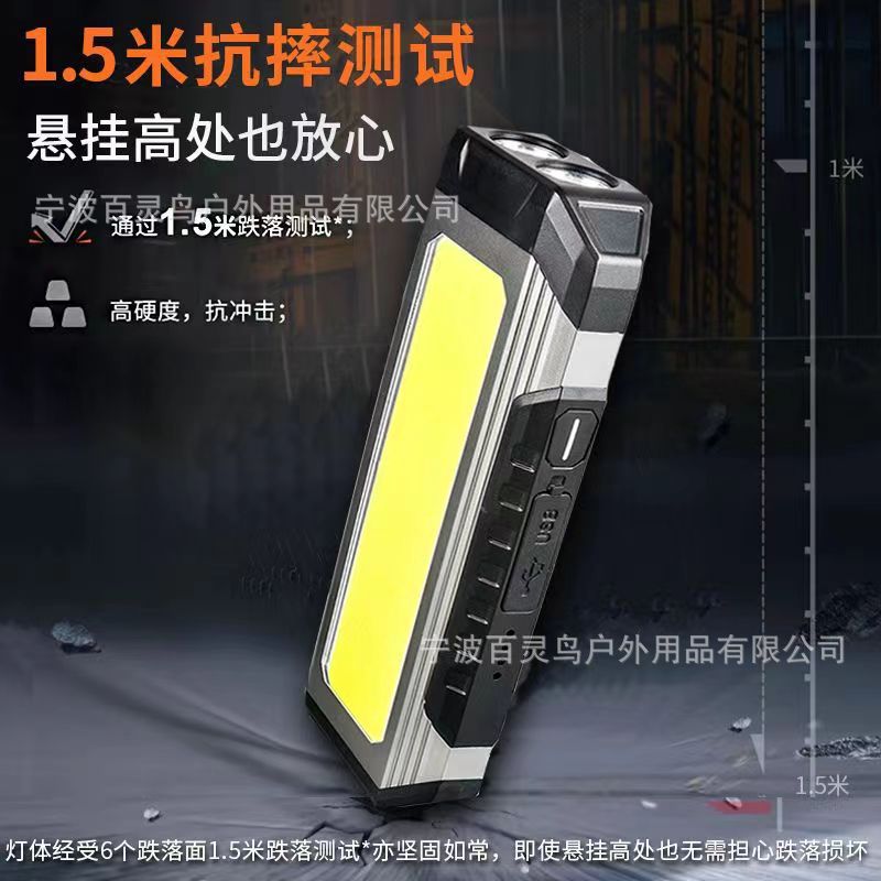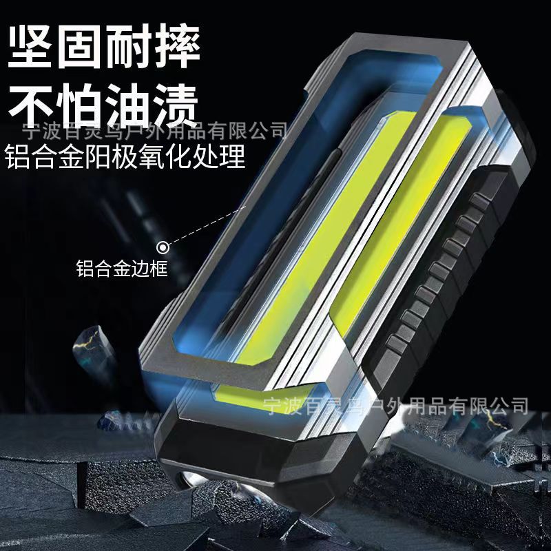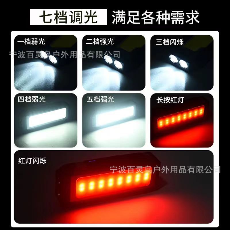 一功能: 前灯中亮- 前灯强亮-前灯爆闪 二功能:COB侧灯中亮-COB侧灯强亮-关 三功能: 长按3秒 红灯警示灯亮-红灯爆闪-关