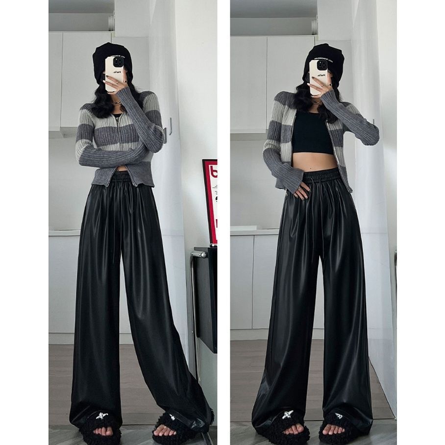 검은 넓은 다리 레트로 가죽 바지 여성의 가을과 겨울 2025 새로운 높은 허리 슬리밍 키가 큰 스파이스 걸스 하이 스트리트 PU 방풍 바지