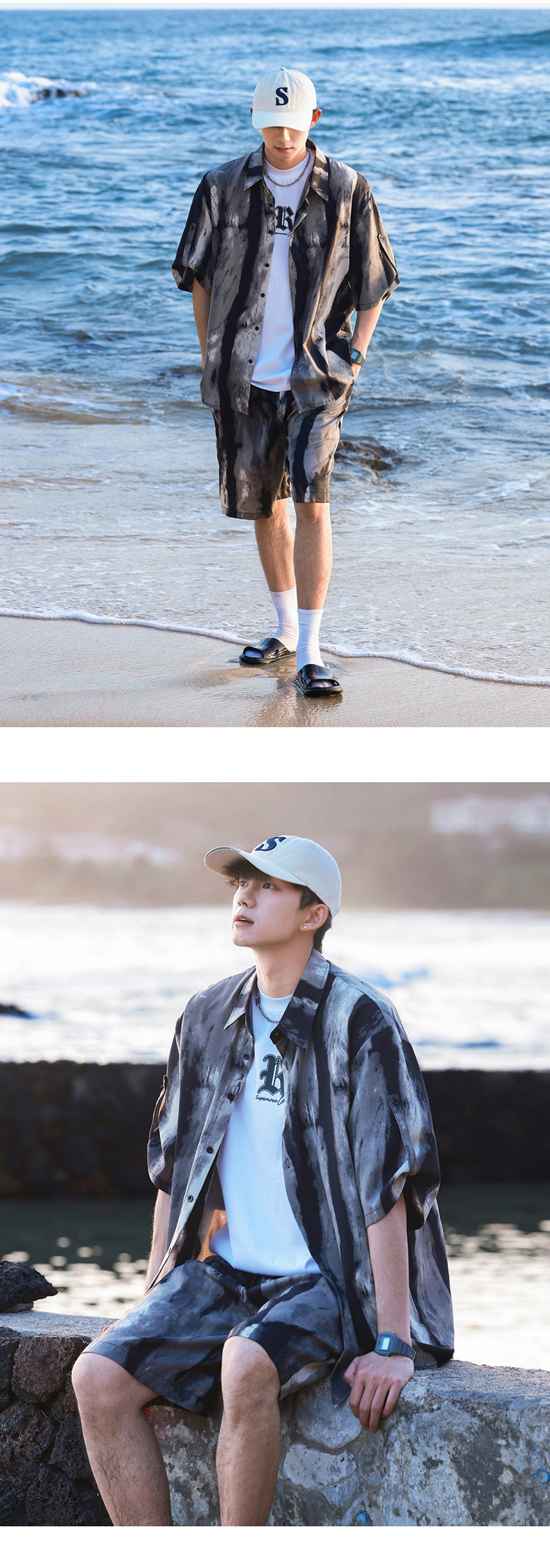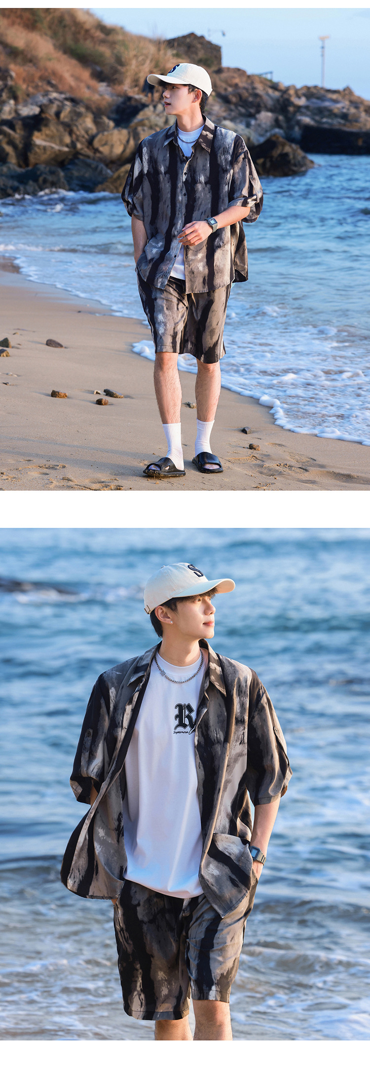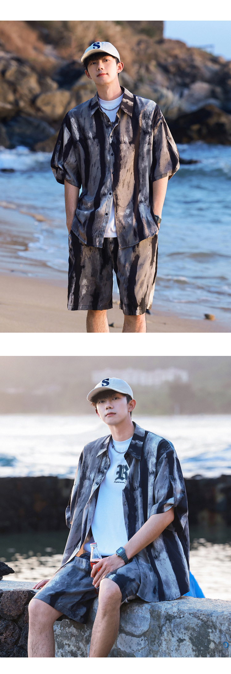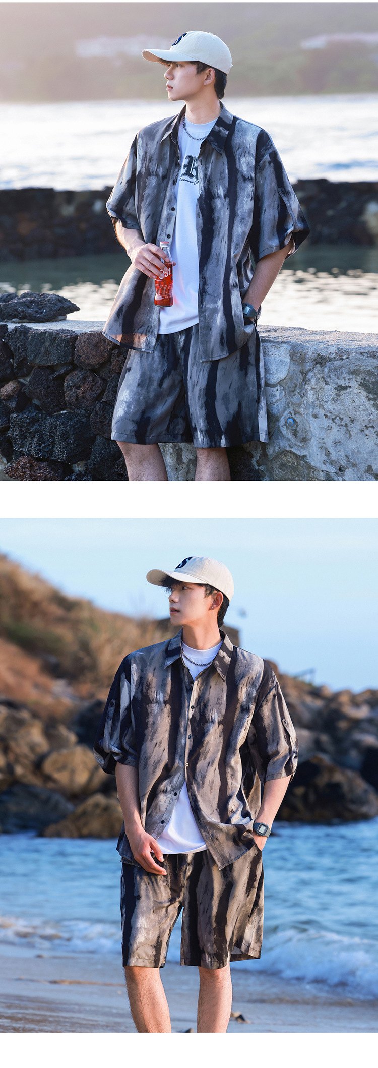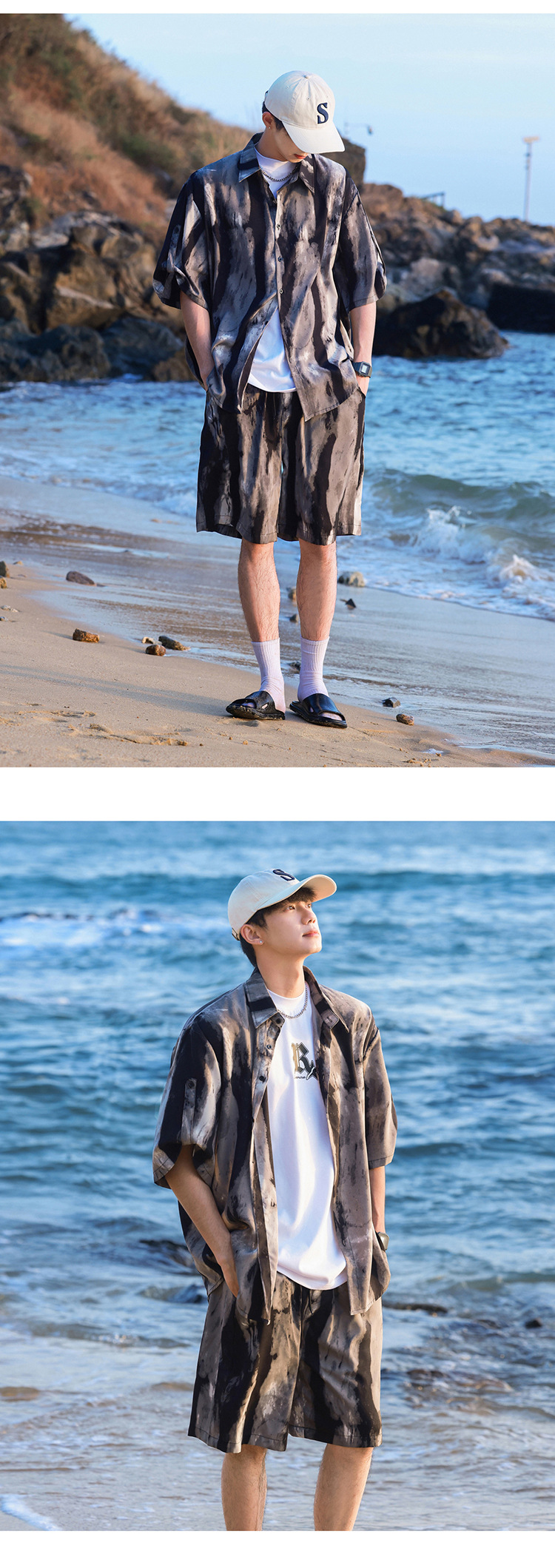 아이스 실크 타이 염료 스포츠 세트 남자 여름 트렌디 브랜드 새로운 스타일 잘 생긴 느슨한 반팔 비치 반바지 캐주얼 투피스 세트스토어 가기
