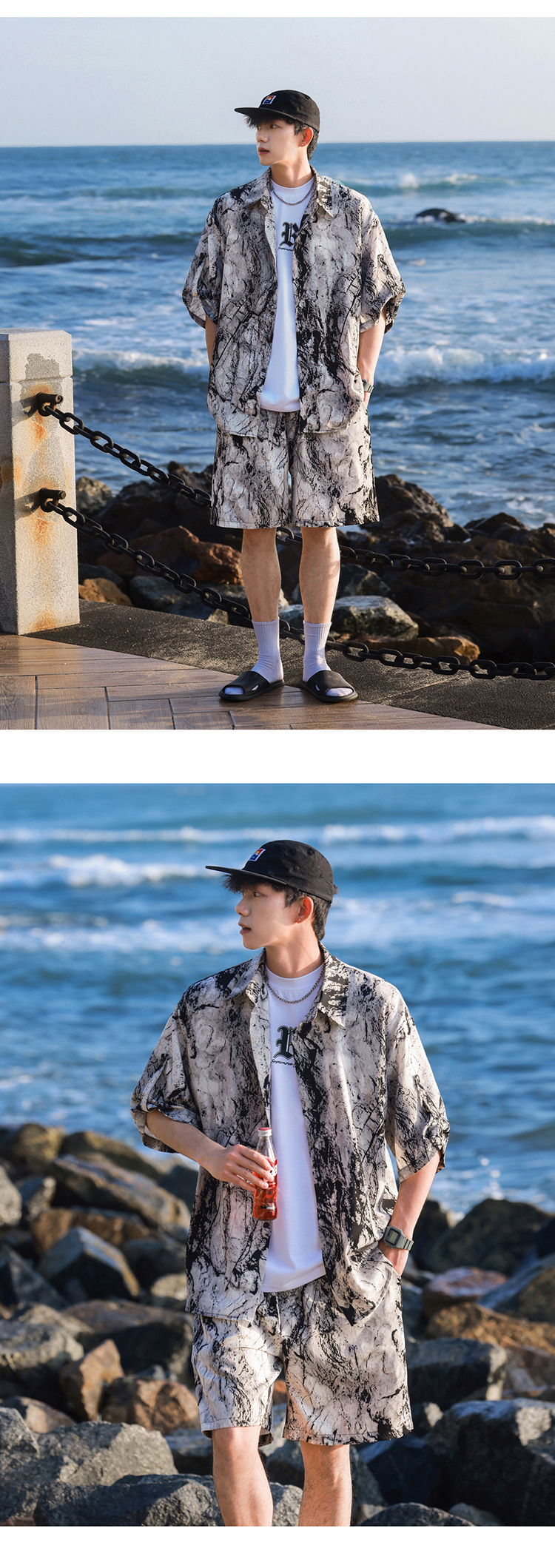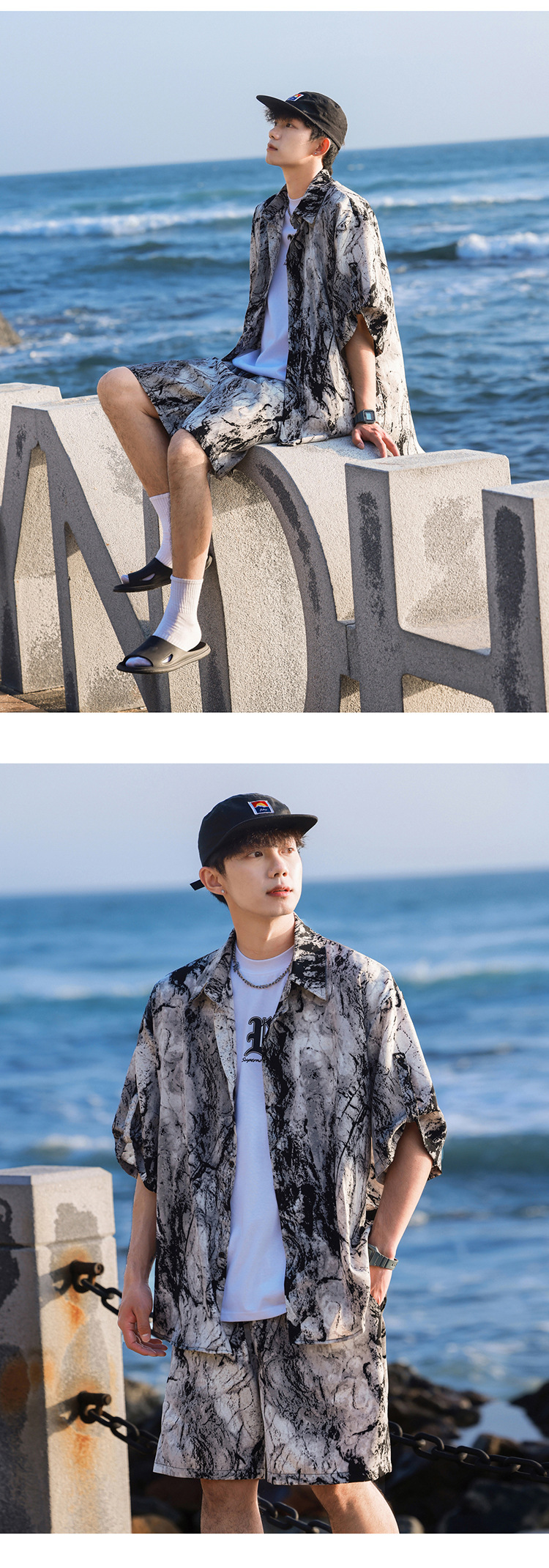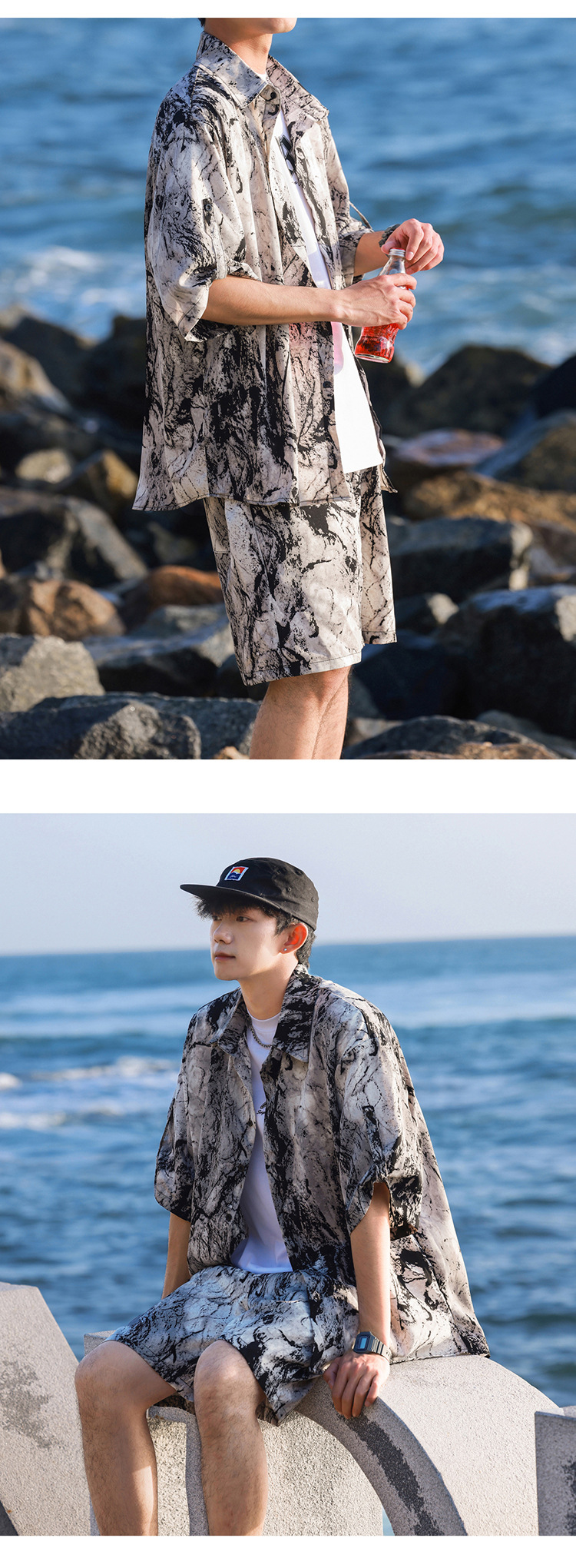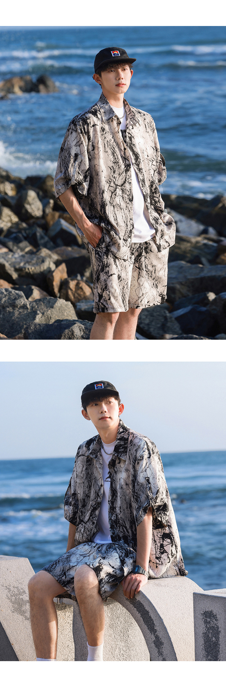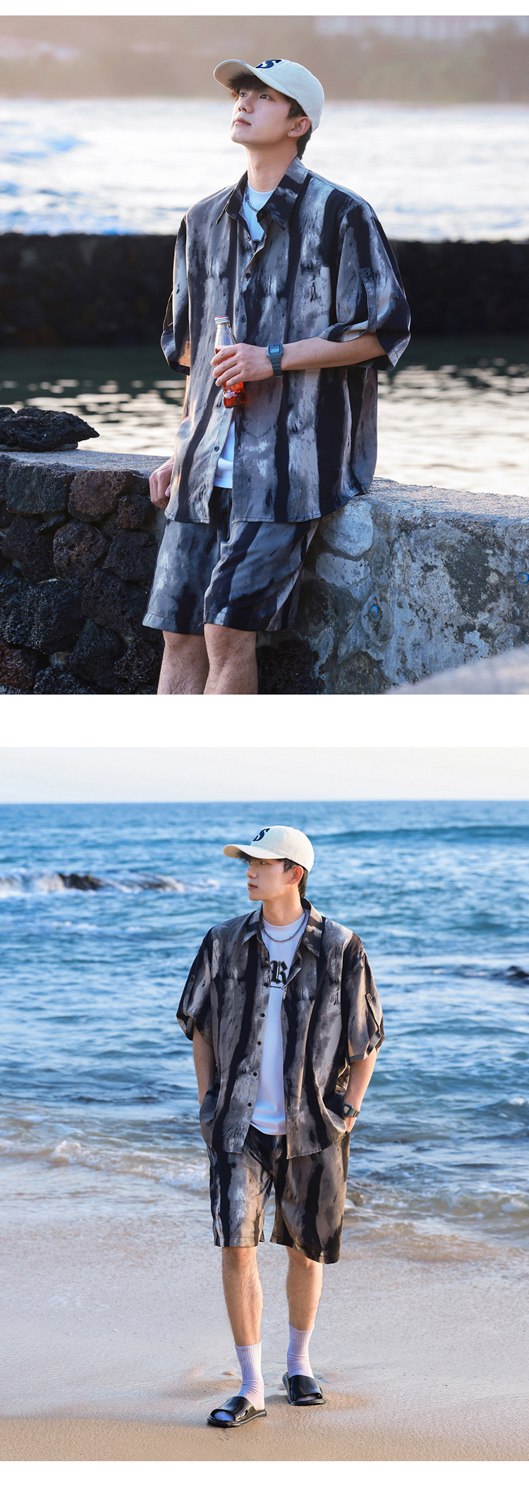 아이스 실크 타이 염료 스포츠 세트 남자 여름 트렌디 브랜드 새로운 스타일 잘 생긴 느슨한 반팔 비치 반바지 캐주얼 투피스 세트스토어 가기