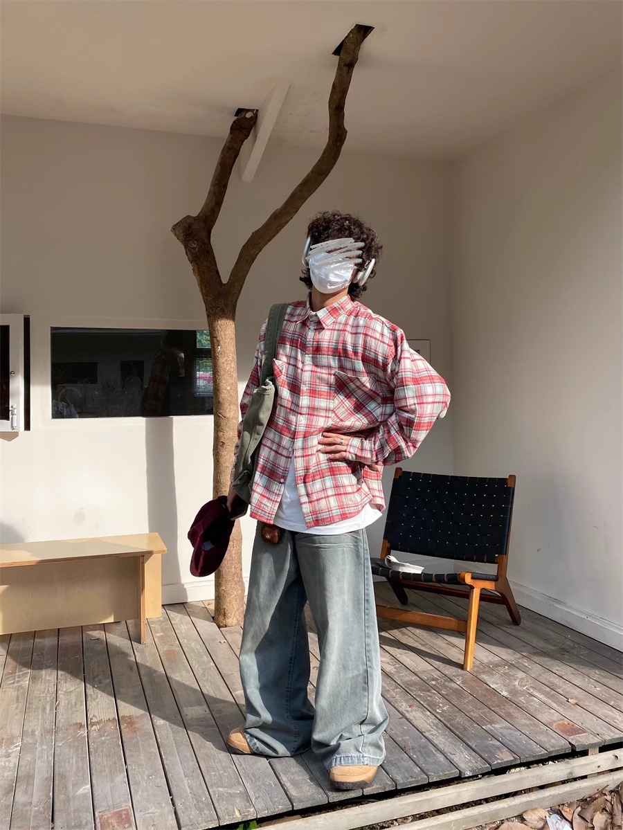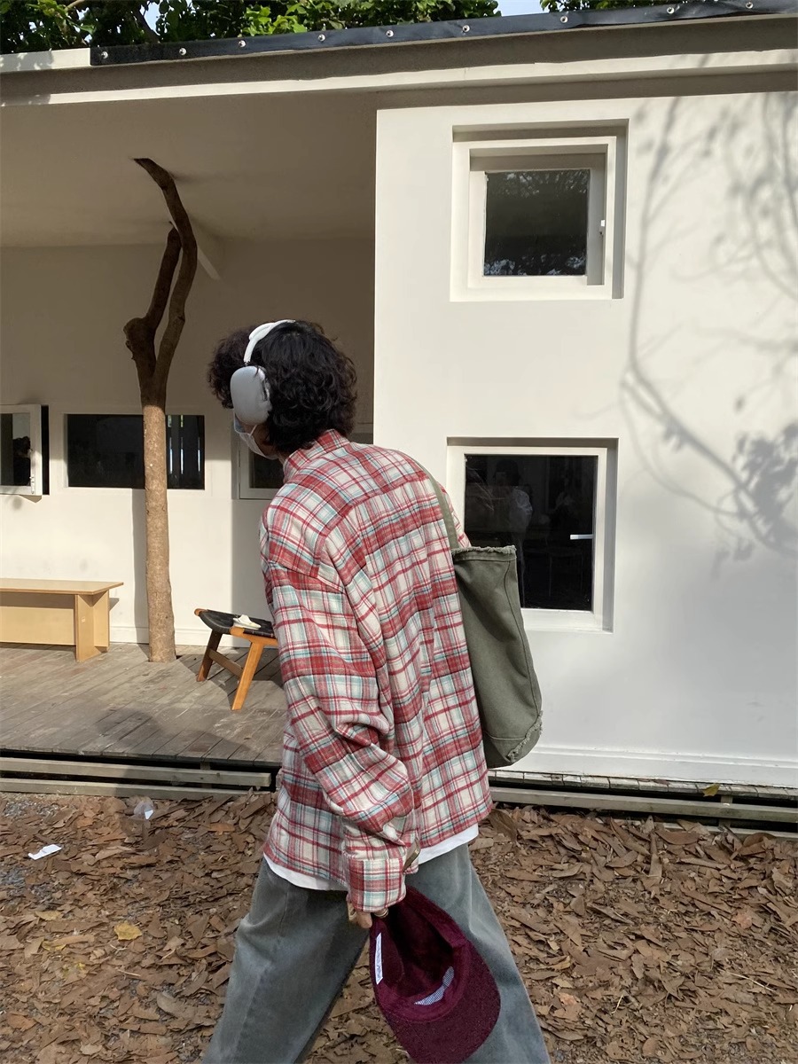 미국 복고풍 격자 무늬 셔츠 남자의 봄과 가을 새로운 느슨한 캐주얼 게으른 스타일 긴팔 셔츠 올 매치 코트 탑스토어 가기