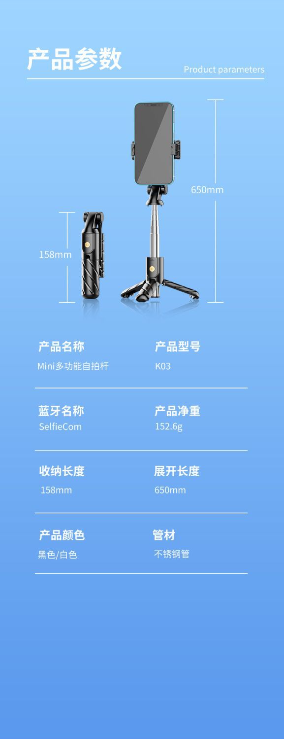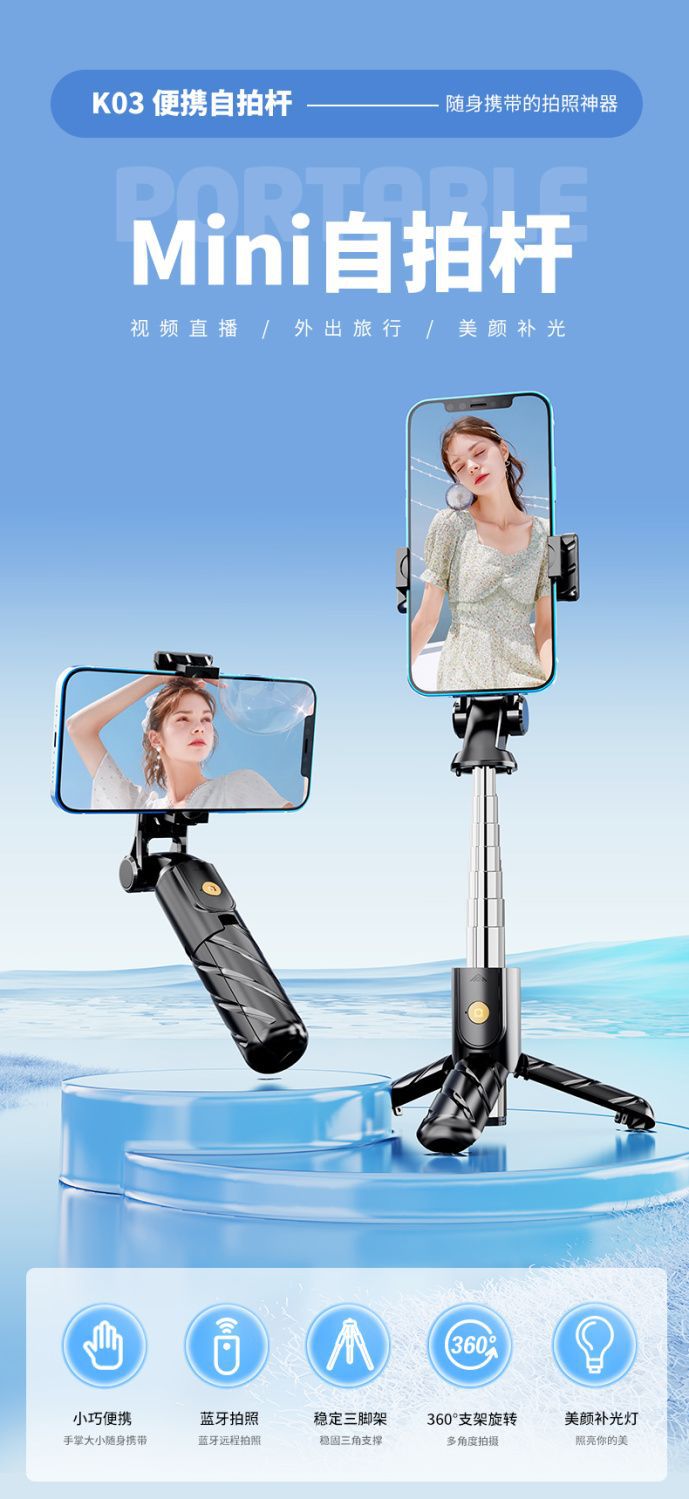 K03 새로운 미니 셀카 스틱 블루투스 카메라 안티 쉐이크 셀카 스틱 휴대 전화 라이브 방송 스탠드 삼각대 통합스토어 가기