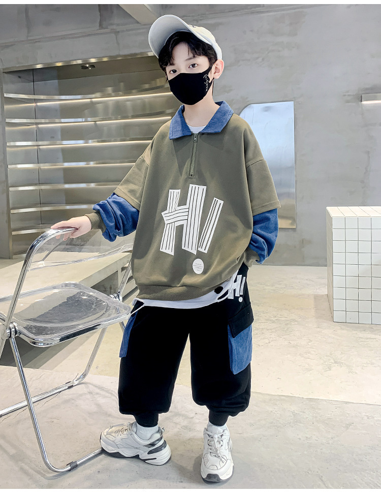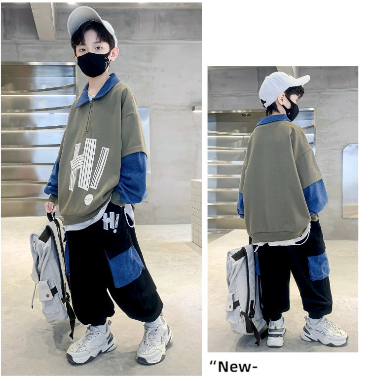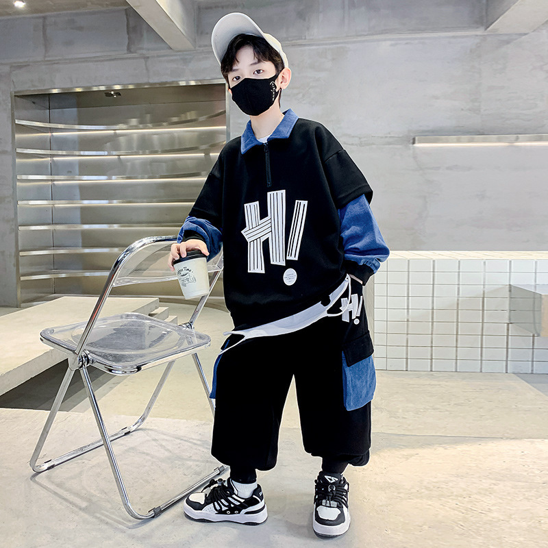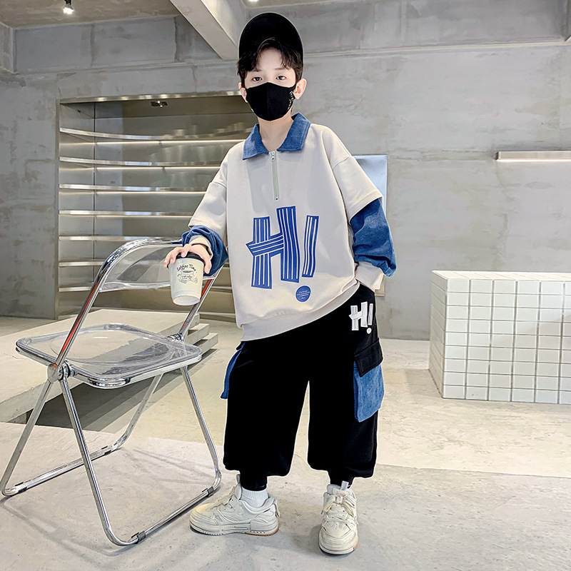 어린이 착용 소년 가을 착용 세트 2023 새로운 봄과 가을 스타일 큰 소년의 후드 잘 생긴 두 조각 유행 세트