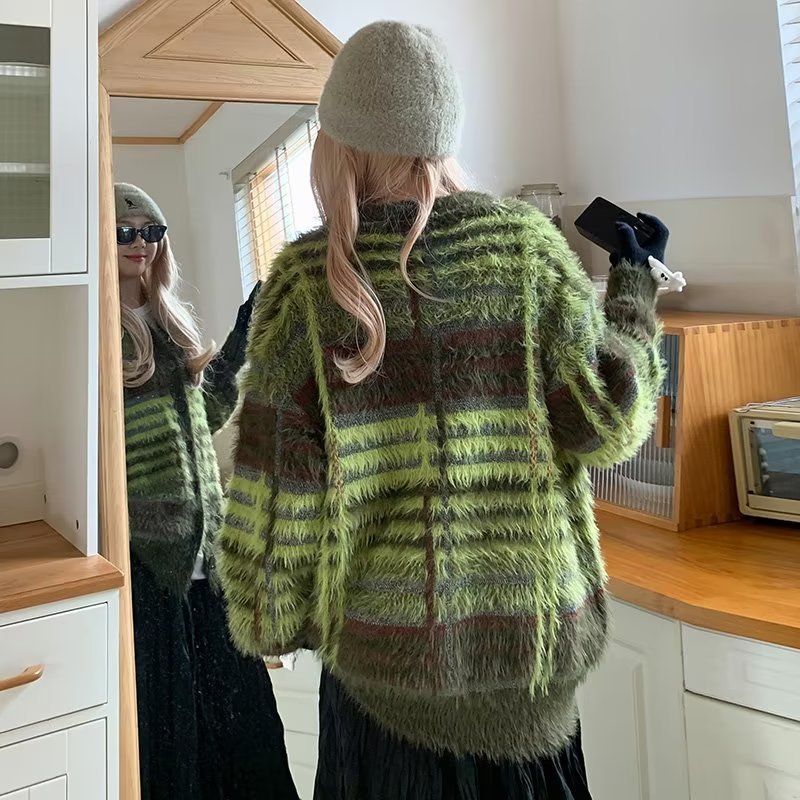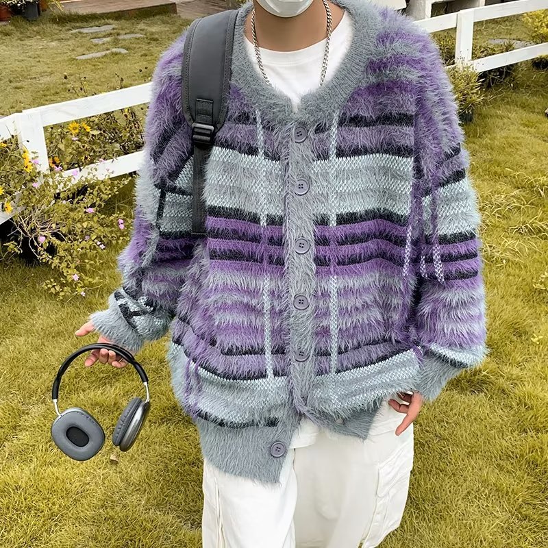 카디건 스웨터 코트 남자 겨울 대비 컬러 스트라이프 한국 스타일 게으른 스타일 V-넥 외부 니트 스웨터 루즈스토어 가기