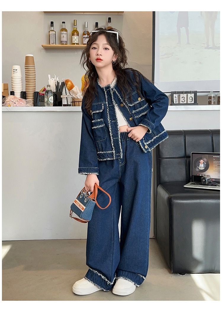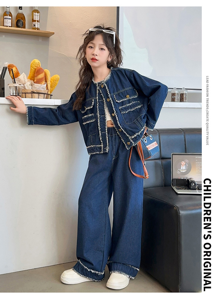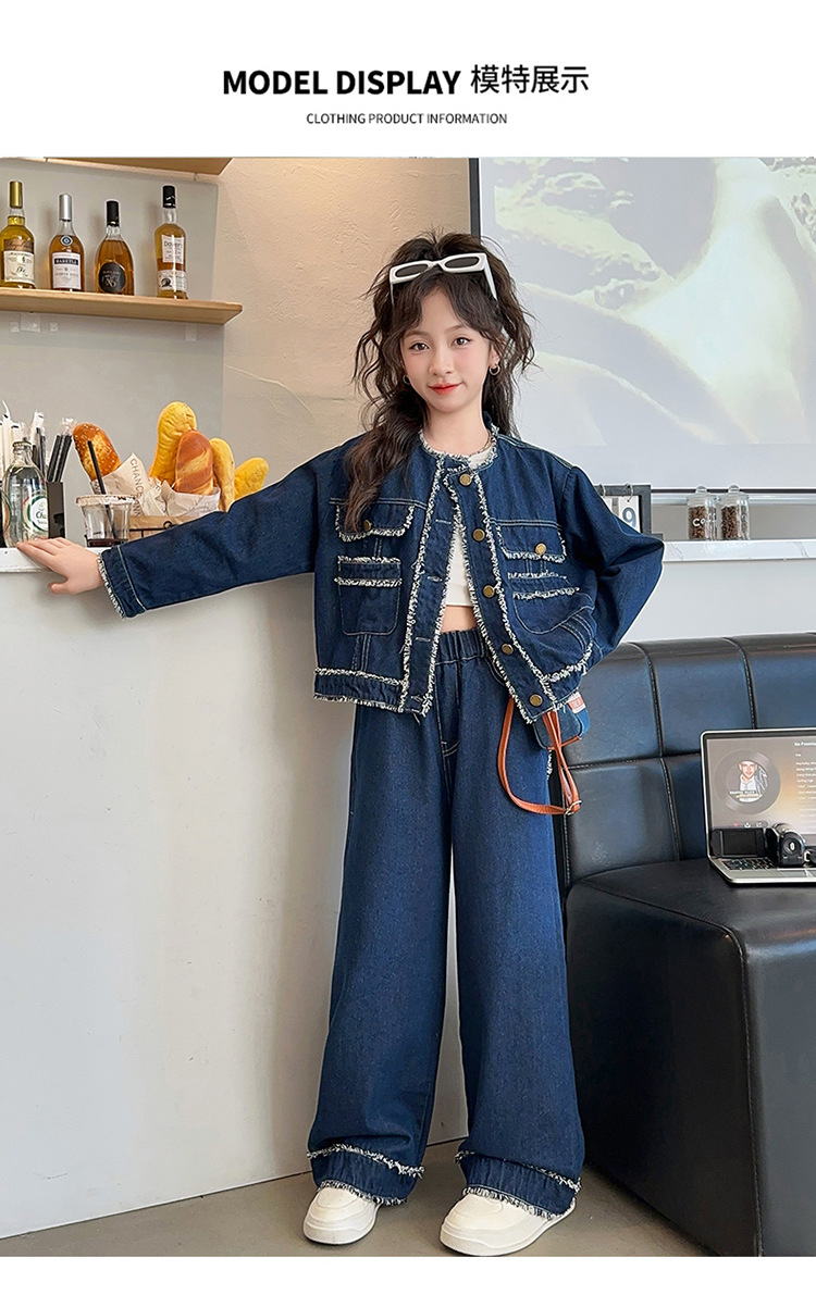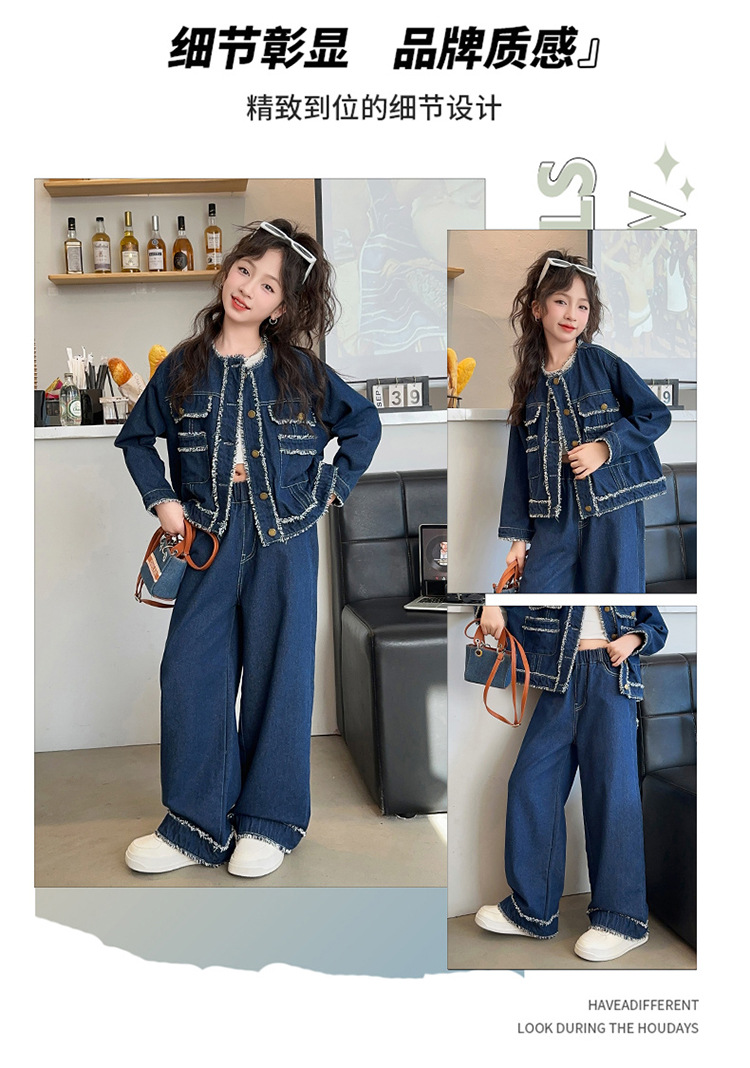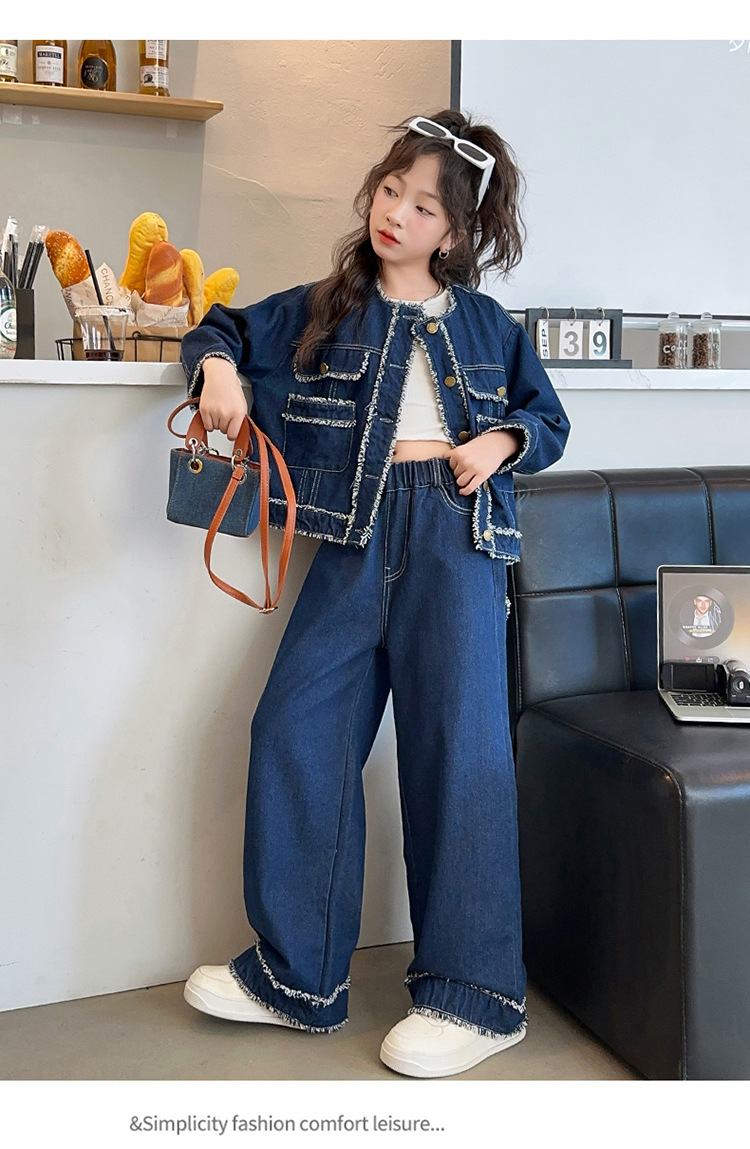 소녀 가을 2024 새로운 어린이 가을 사이버 축하 러프 데님 세트 소녀 서양식 유행 봄과 가을 스타일스토어 가기