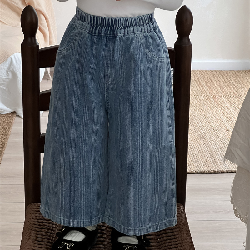 Xi Fan 2024 가을 새로운 어린이 줄무늬 넓은 다리 청바지 간단한 한국 자카드 빈티지 바지스토어 가기