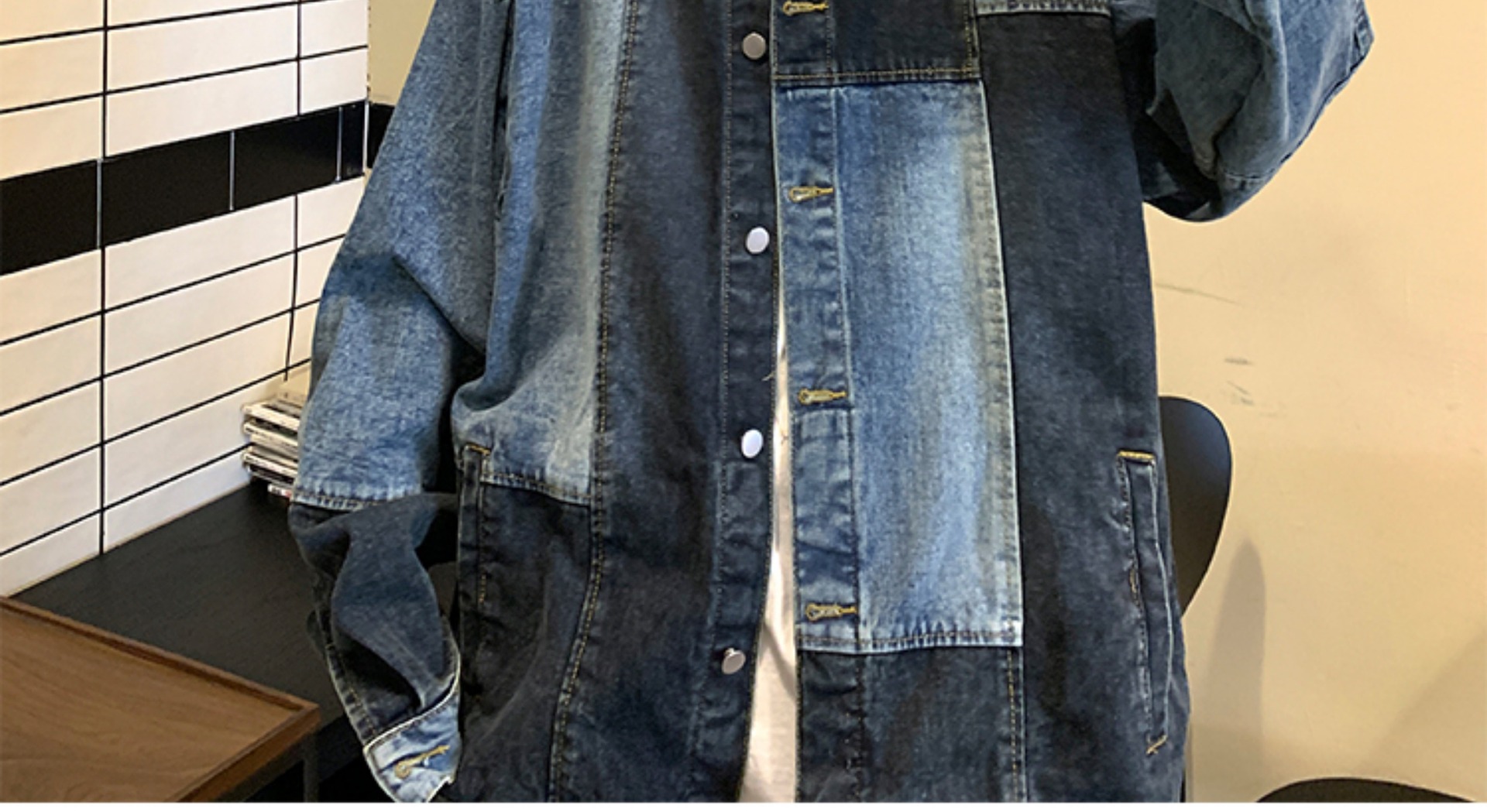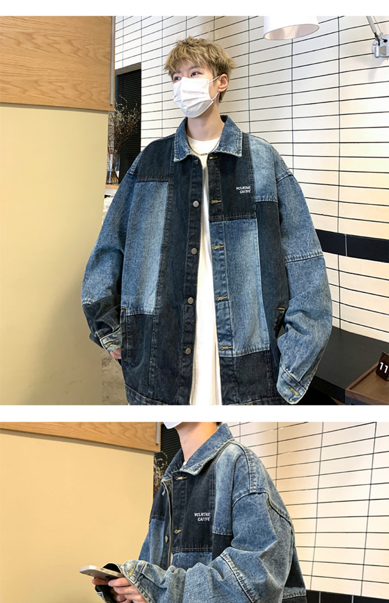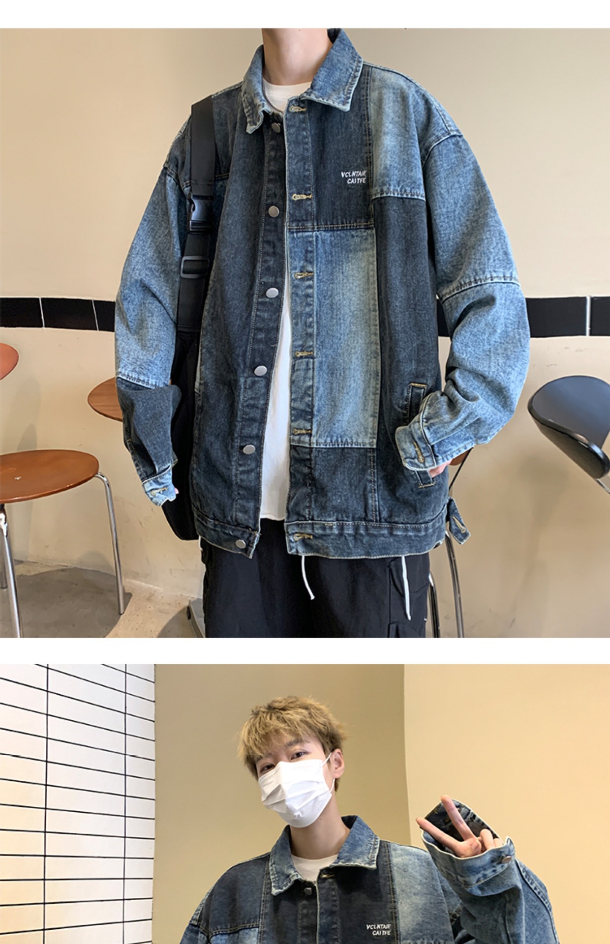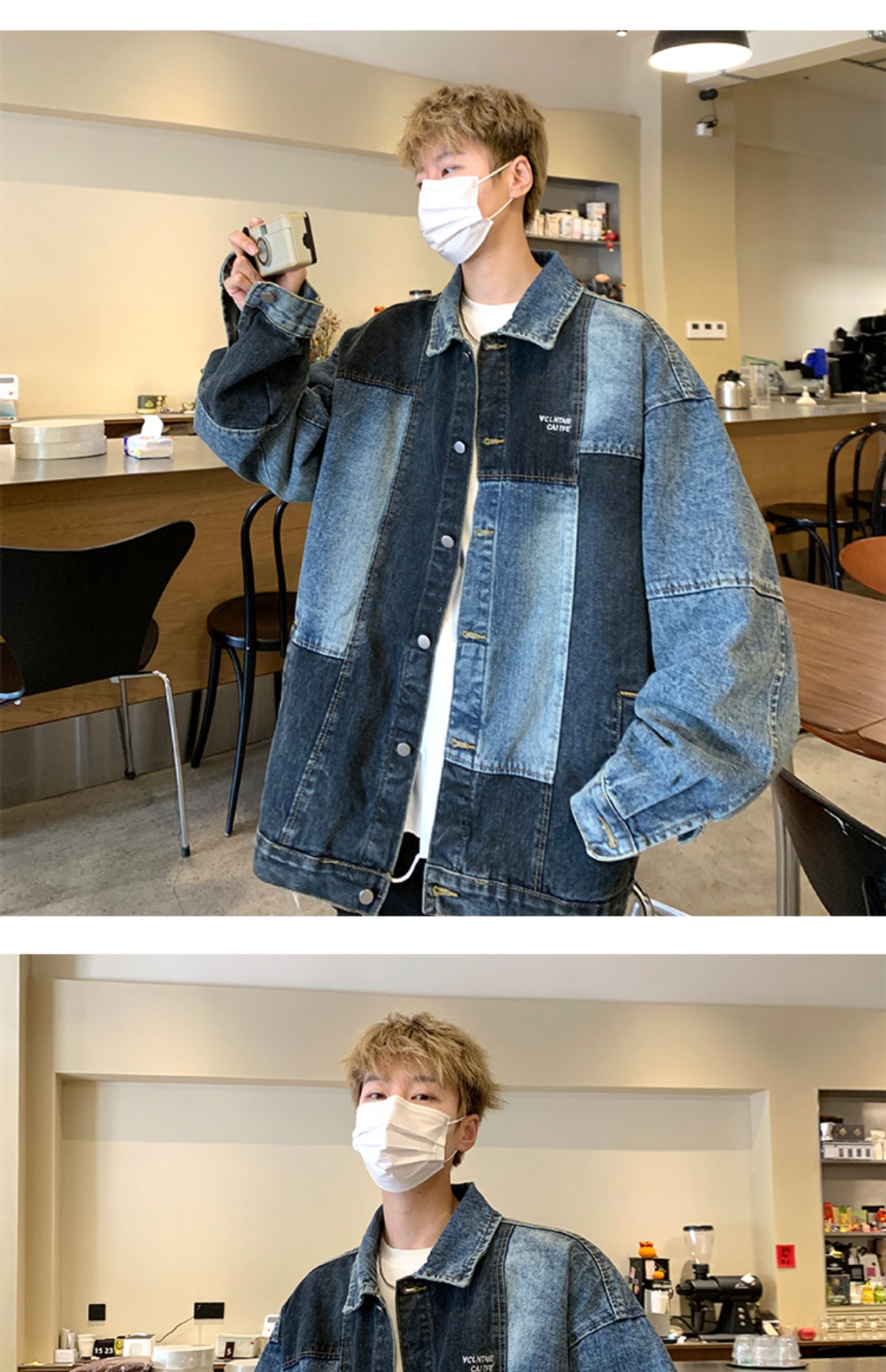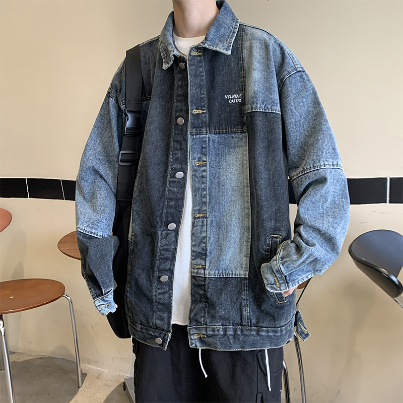 디자인 센스 대비 컬러 바느질 세탁 오래 된 데님 재킷 남성 봄과 가을 패션 브랜드 미국 스타일 느슨한 캐주얼 자켓스토어 가기