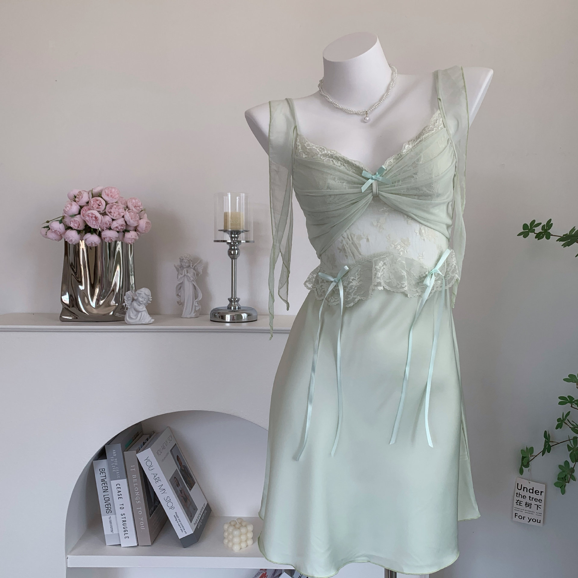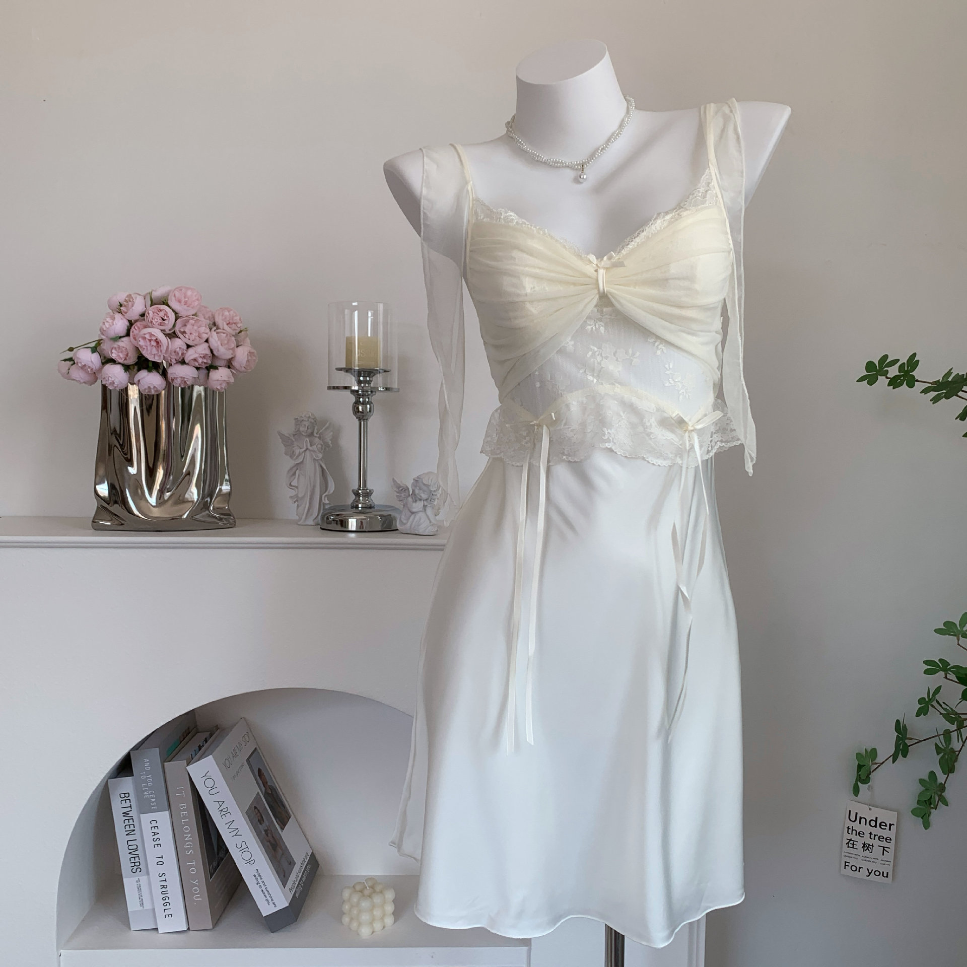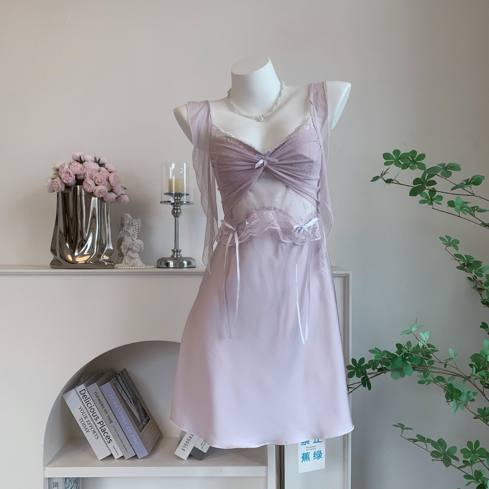 [일몰 꽃 신] 여름 슬링 레이스 세트 요정 메시 투피스 홈 옷 여성 섹시한 아이스 실크