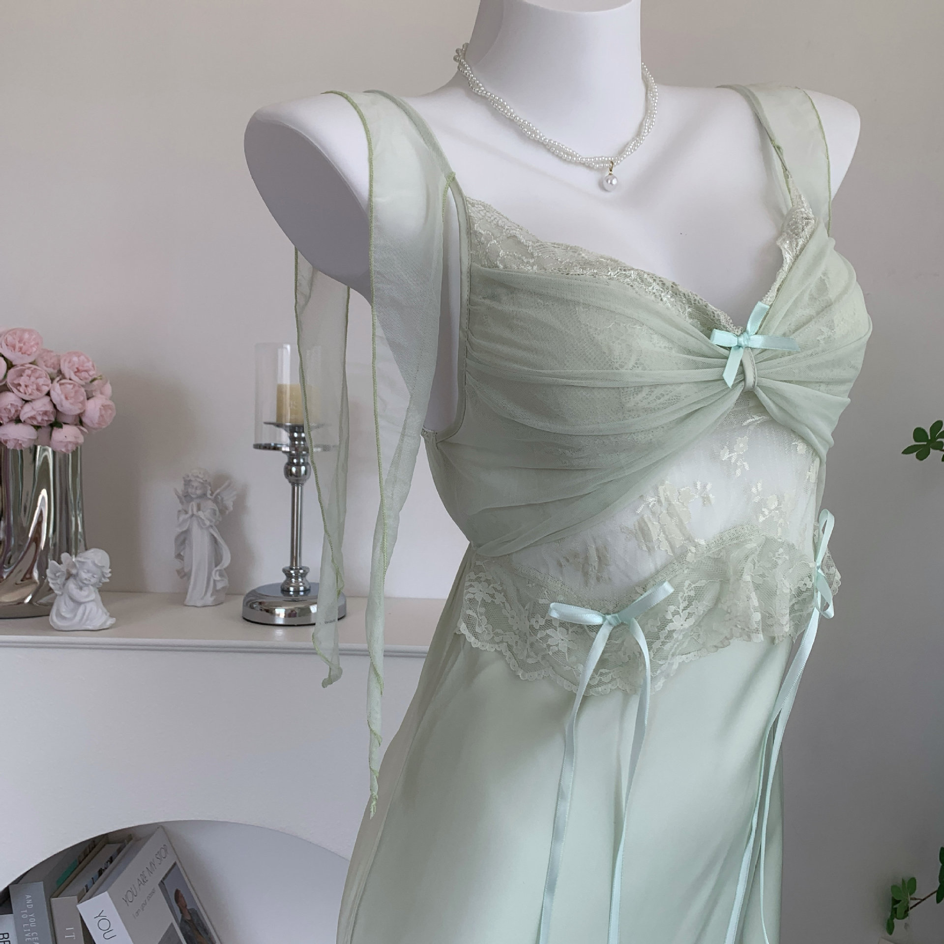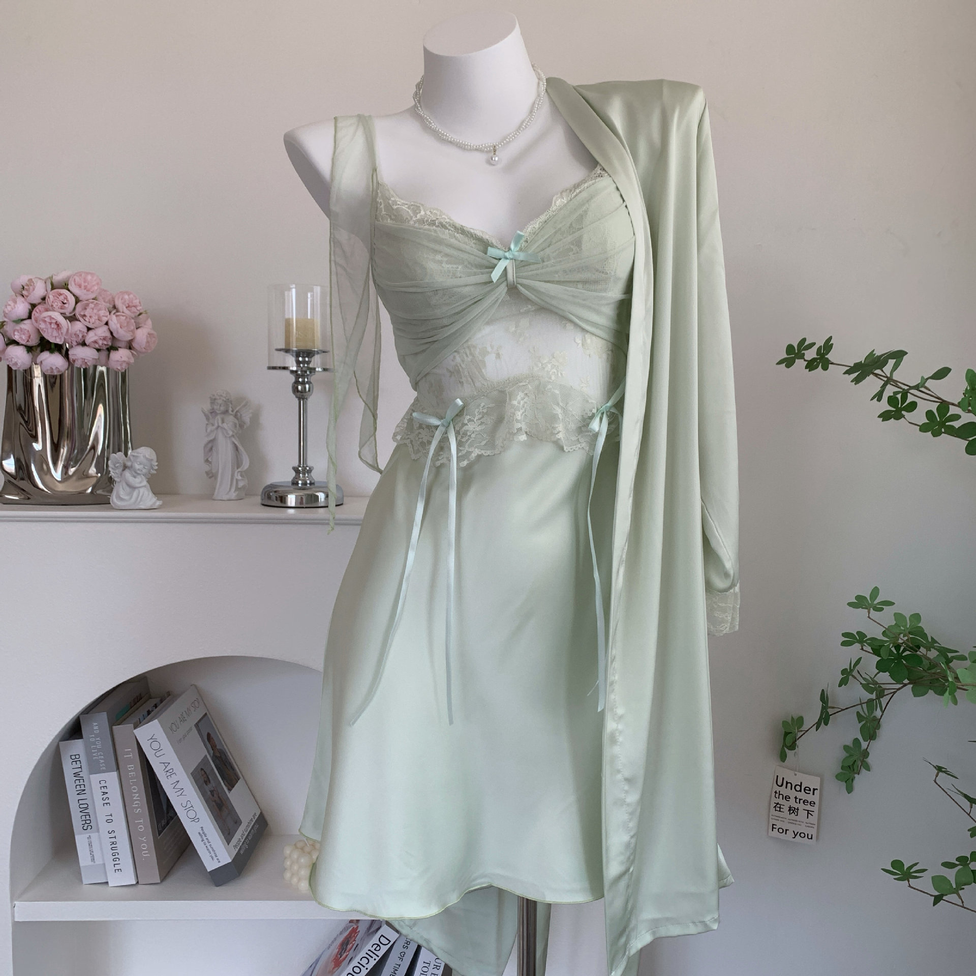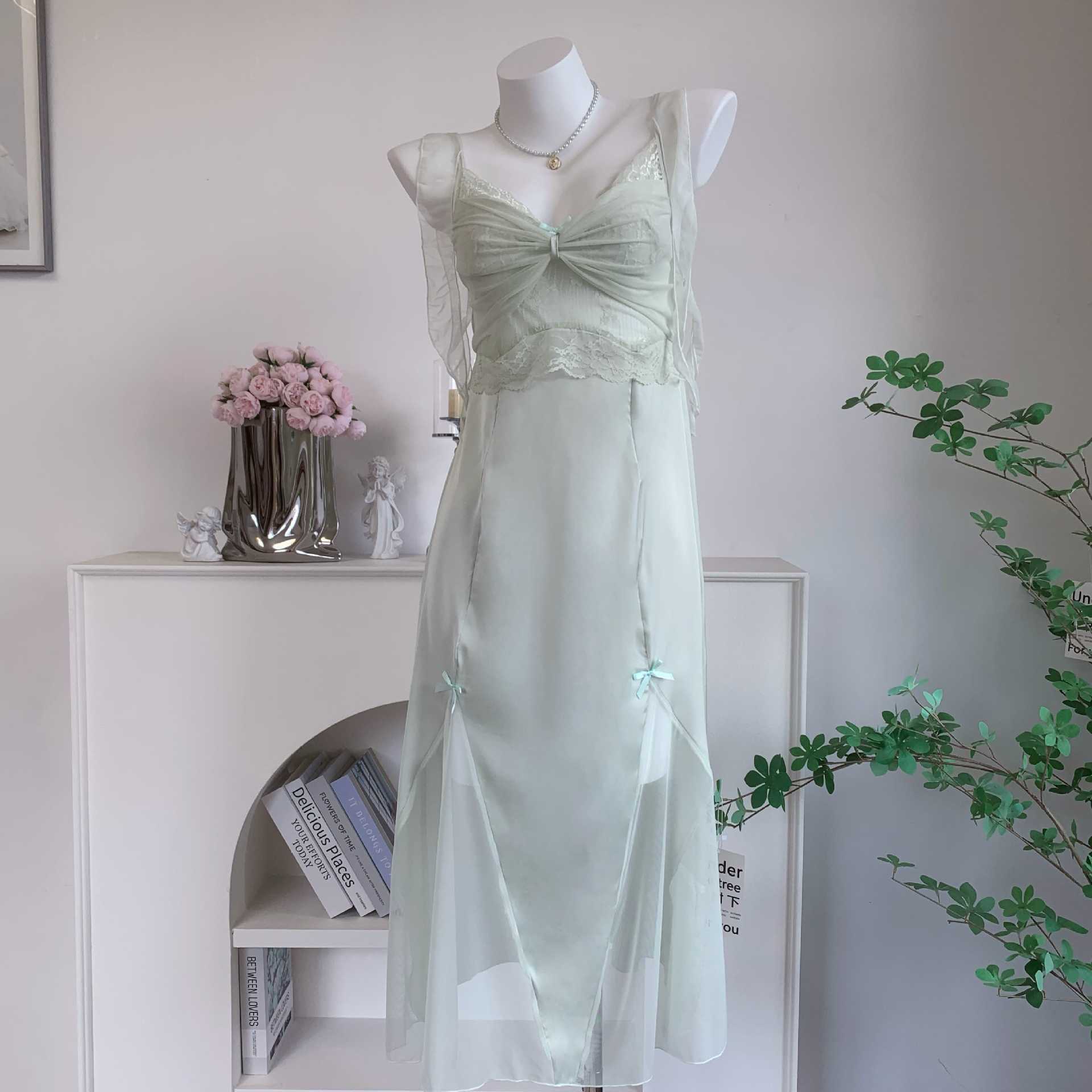 [일몰 꽃 신] 여름 슬링 레이스 세트 요정 메시 투피스 홈 옷 여성 섹시한 아이스 실크스토어 가기
