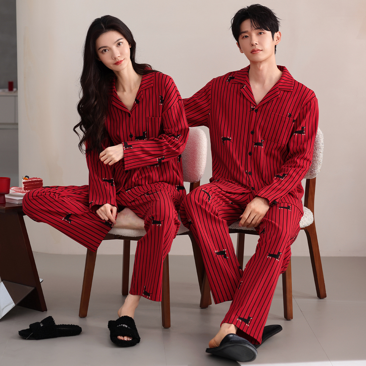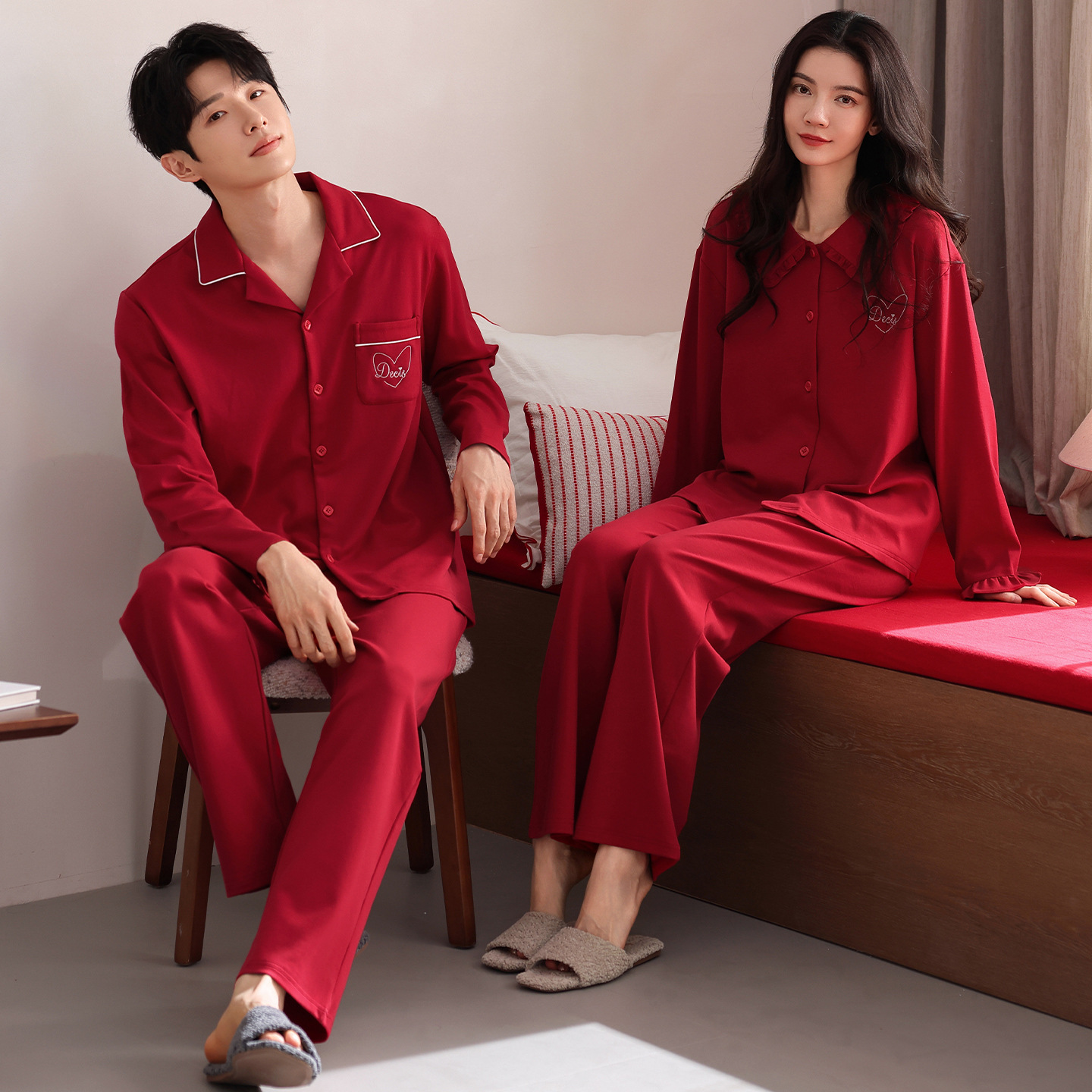 신혼 부부를 위한 빨간색 결혼 잠옷, 봄과 가을 단면 순면 긴팔 남성과 여성의 가을 겨울 홈웨어 세트스토어 가기