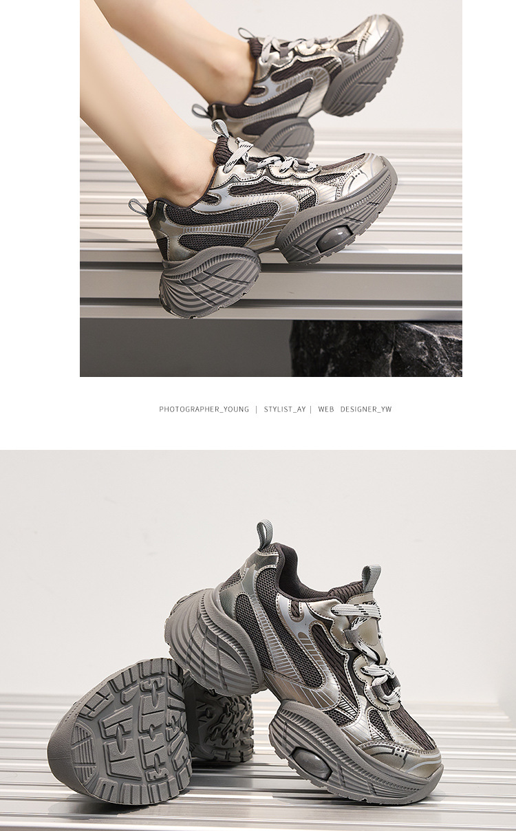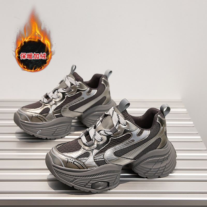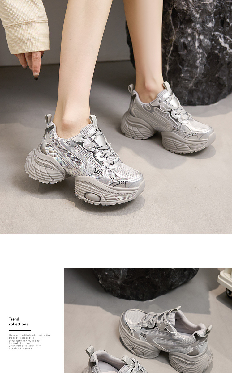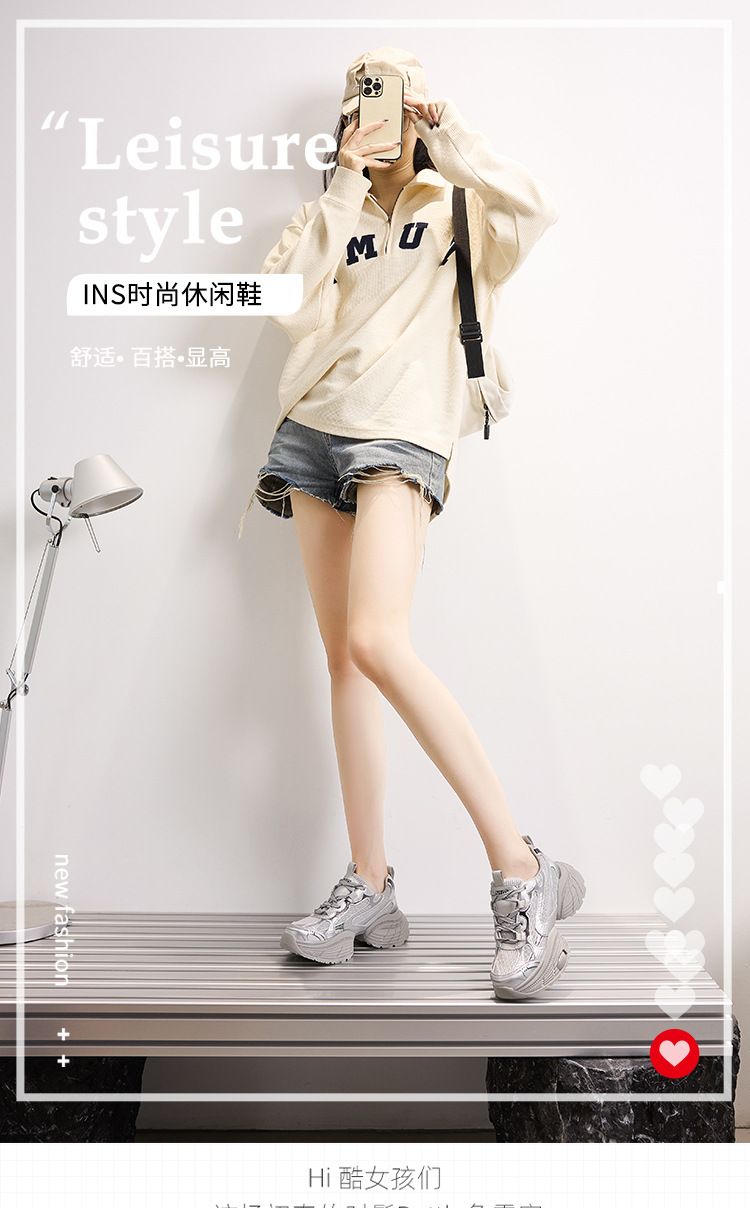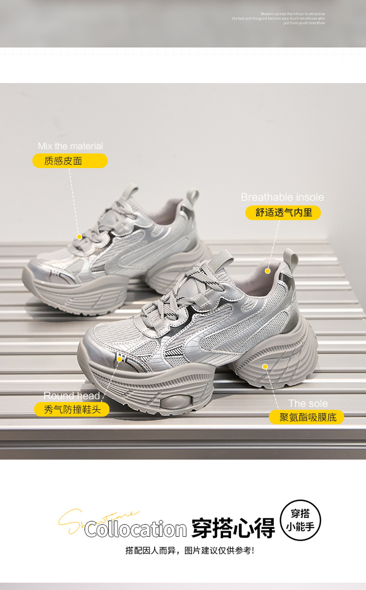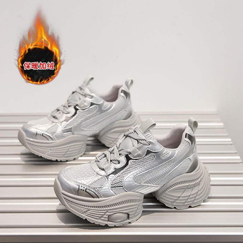 2024 스몰 사이즈 두꺼운 밑창 실버 유행 토르 신발 여성의 새로운 올 매치 캐주얼 신발 높이 증가 경량 운동화 트렌디 신발스토어 가기