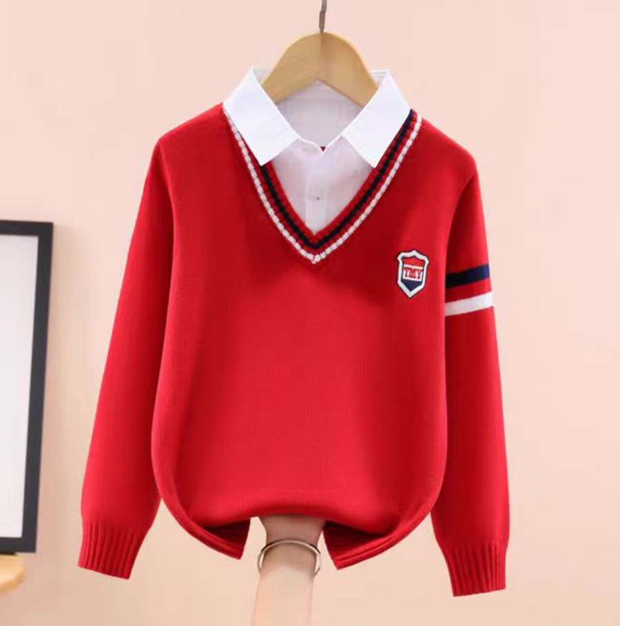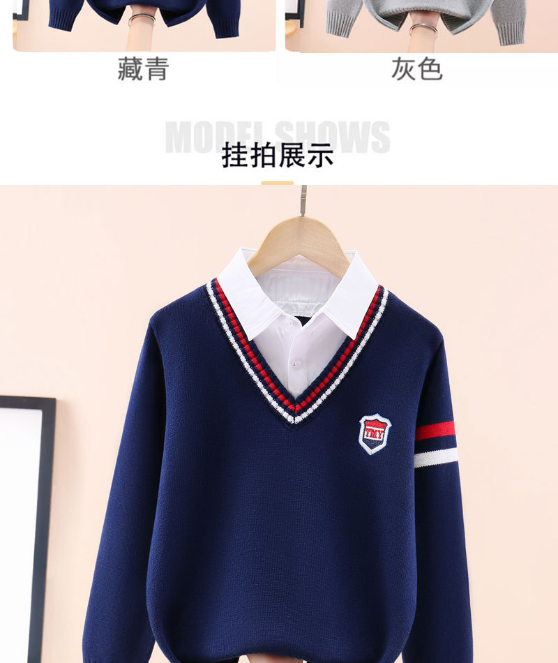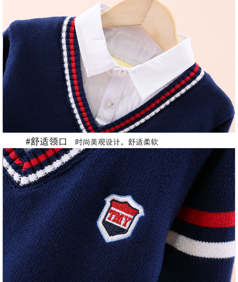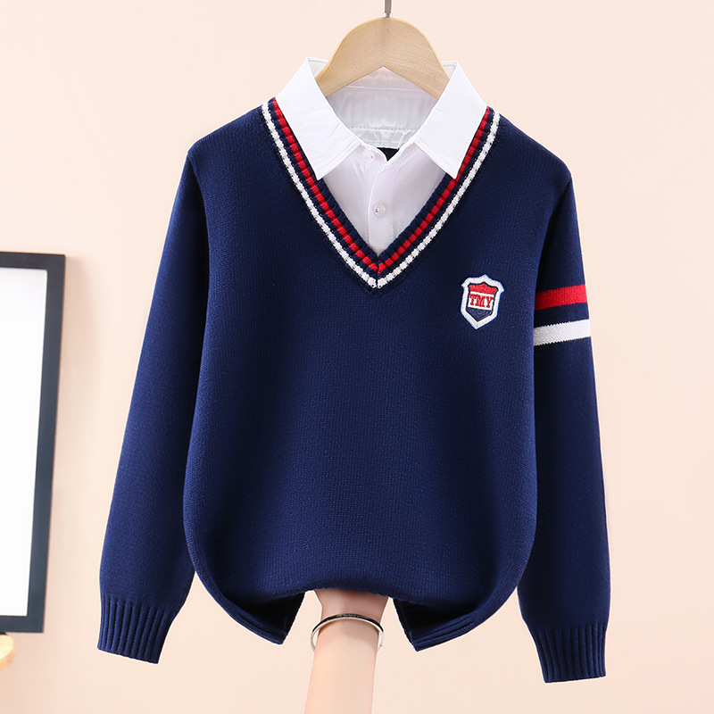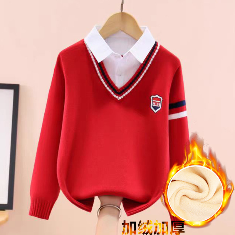 소년 스웨터 어린이 순면 니트 스웨터 봄과 가을 스웨터 가을과 겨울 기모 두꺼운 세트 외국식 중년 어린이 가짜 투피스