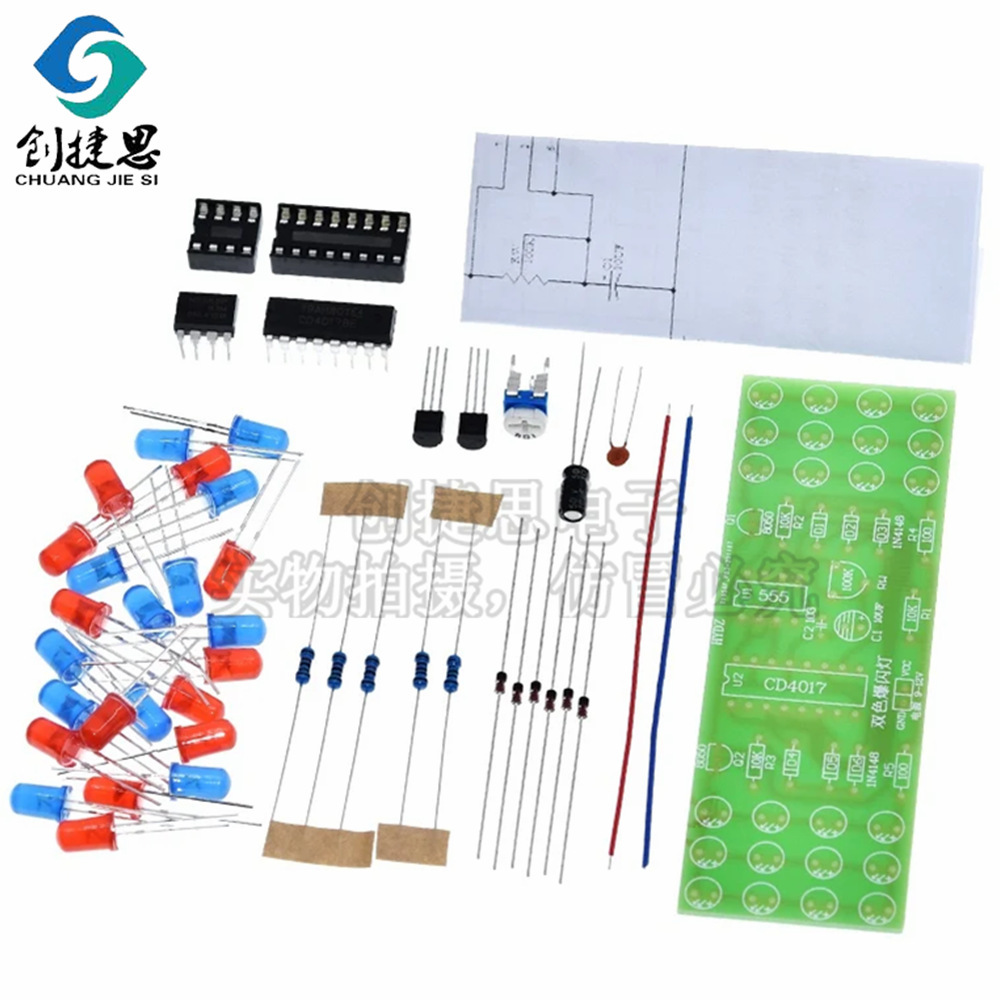 提示:如果两种灯是电压较低的LED,可以用9V,但是本套件使用的蓝灯需要较高的电压,所以供电电压要用12V。