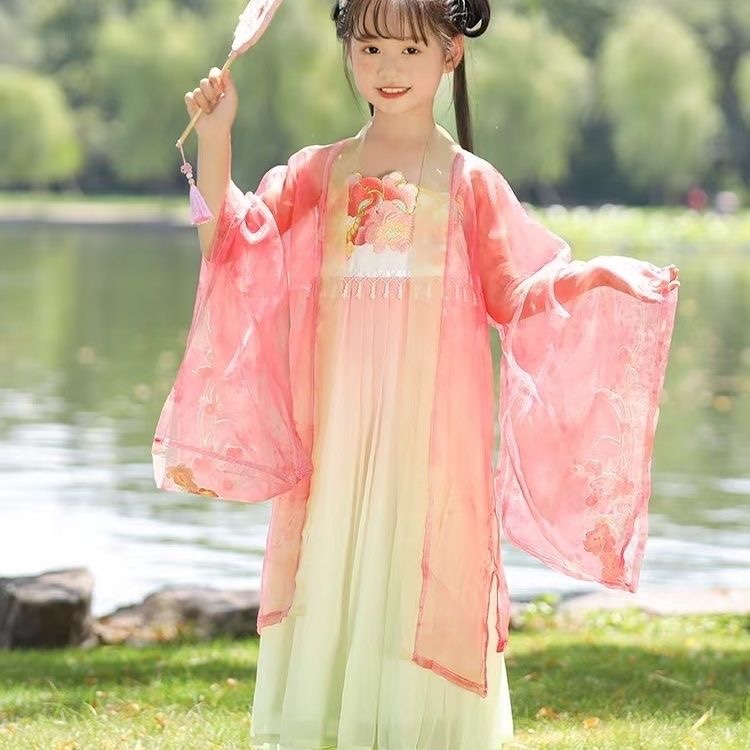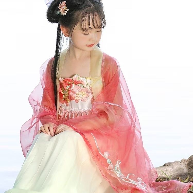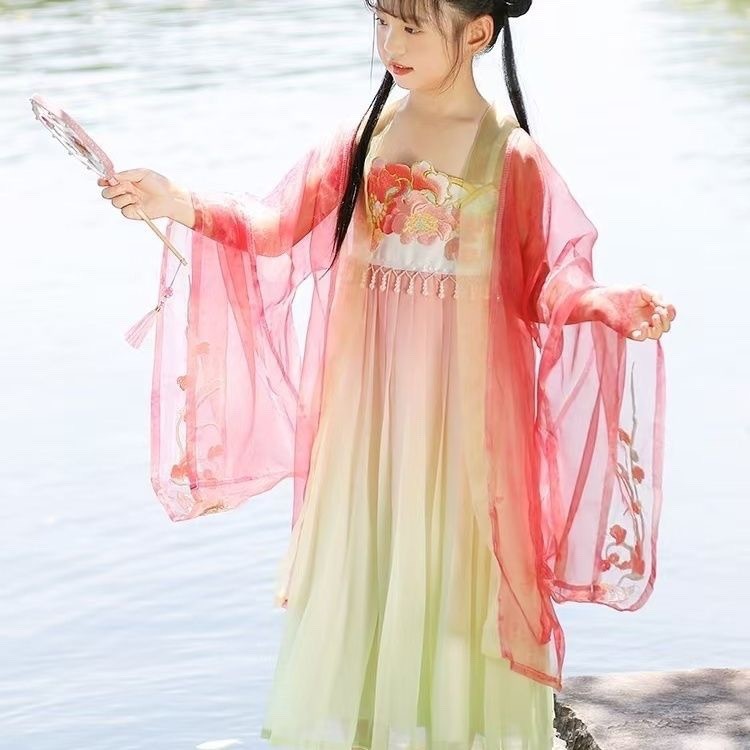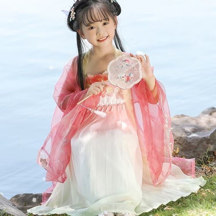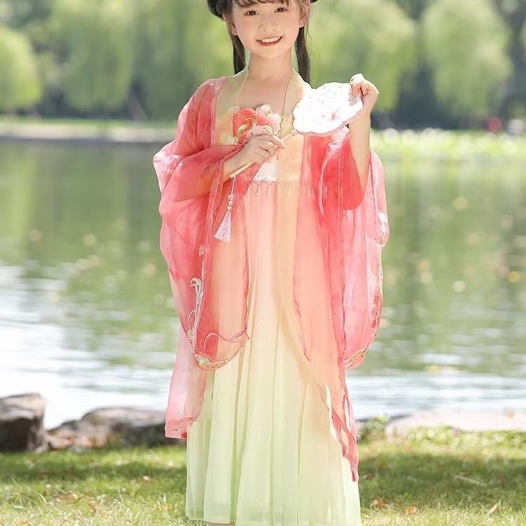 새로운 어린이 개선 된 칭헤푸 자수 당나라 스타일 슬립 스커트 큰 소매 셔츠 한푸 2024 소녀 공연 세트스토어 가기