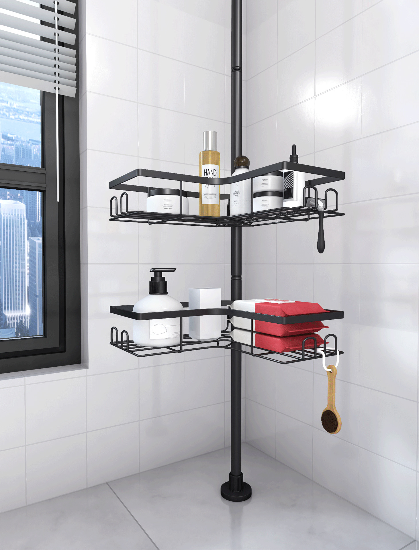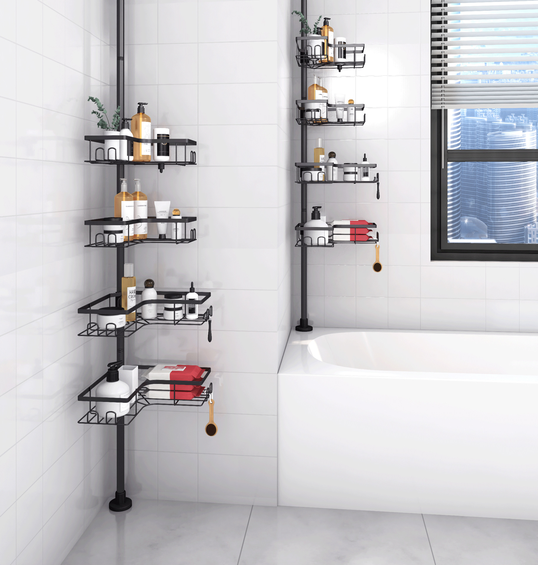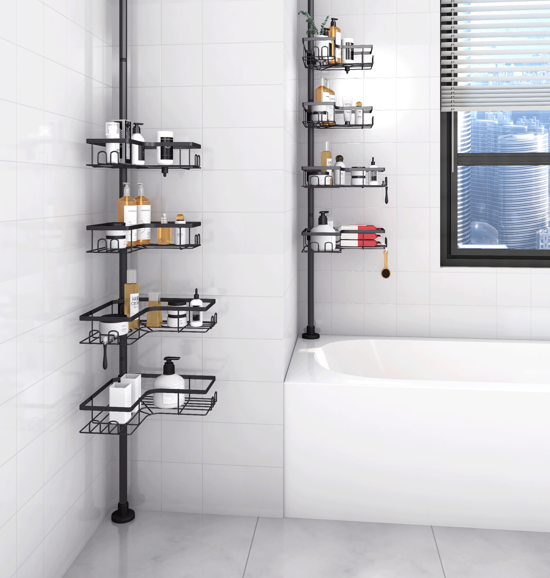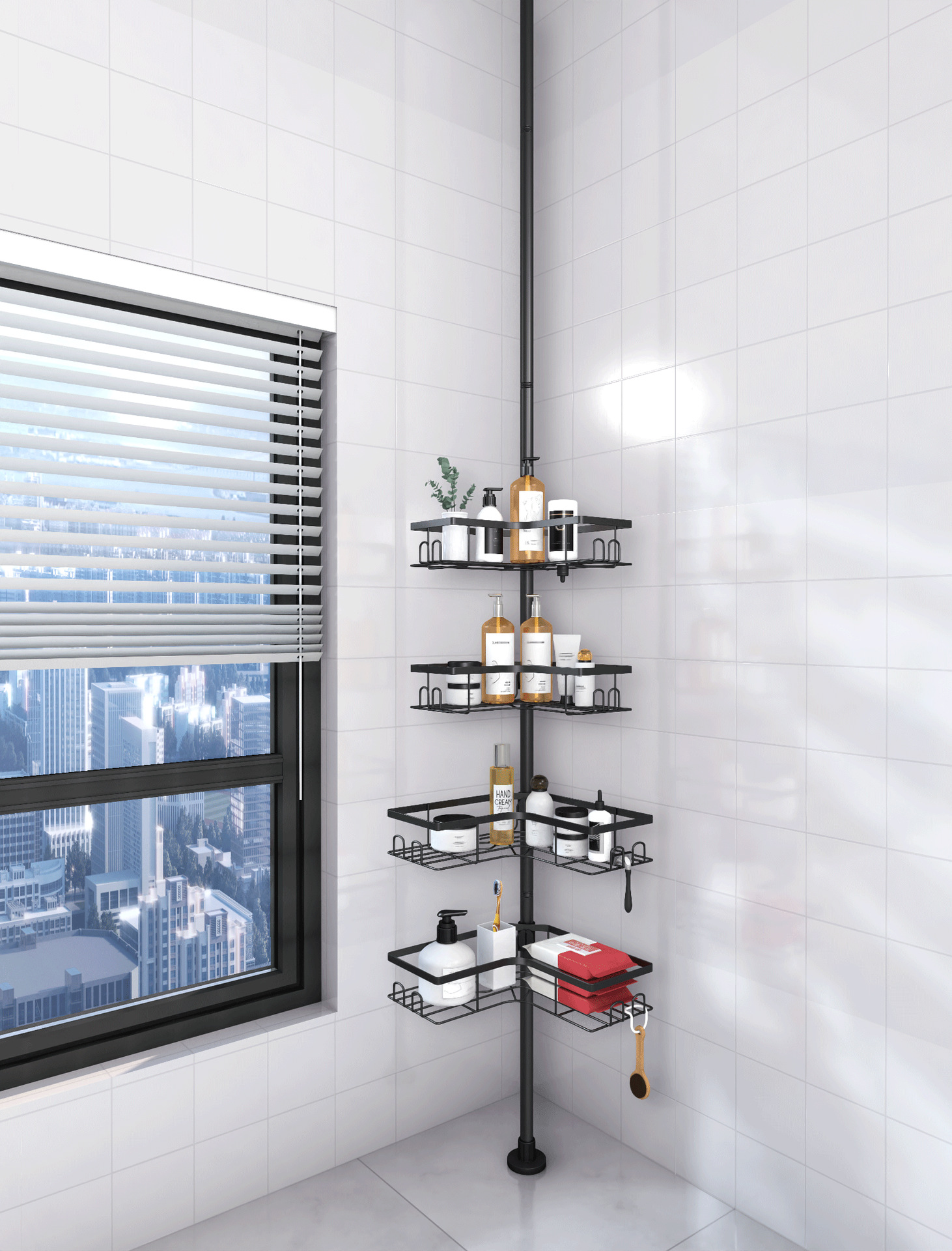 욕실용 크로스보더 펀치프리 욕실 수납선반, 샤워젤을 보관할 수 있는 접이식 삼각대 천장형 수납선반스토어 가기