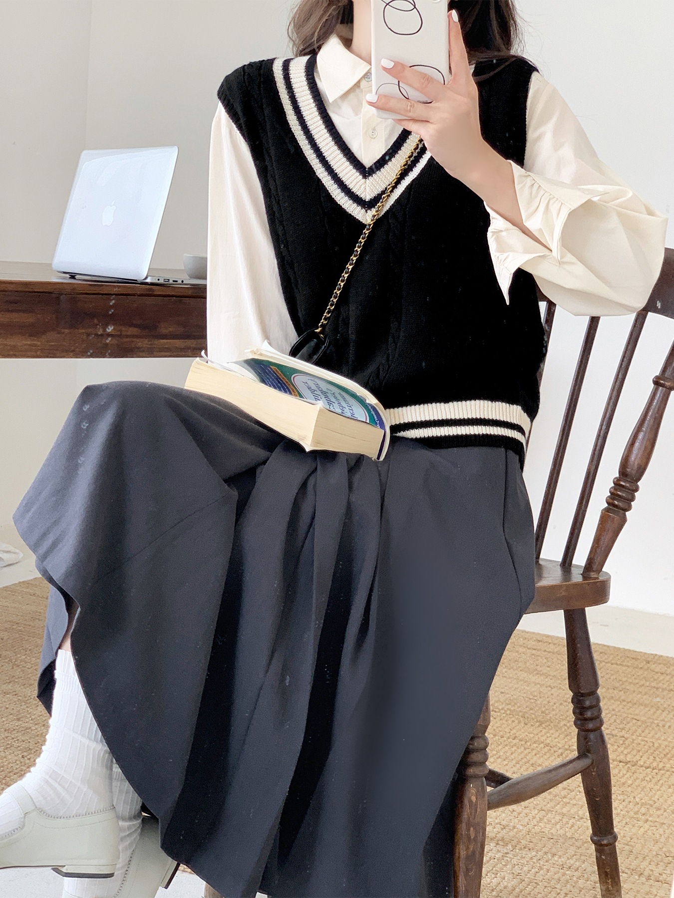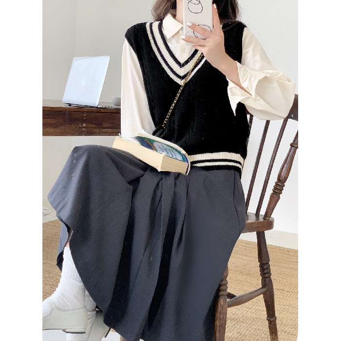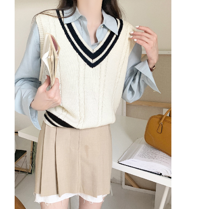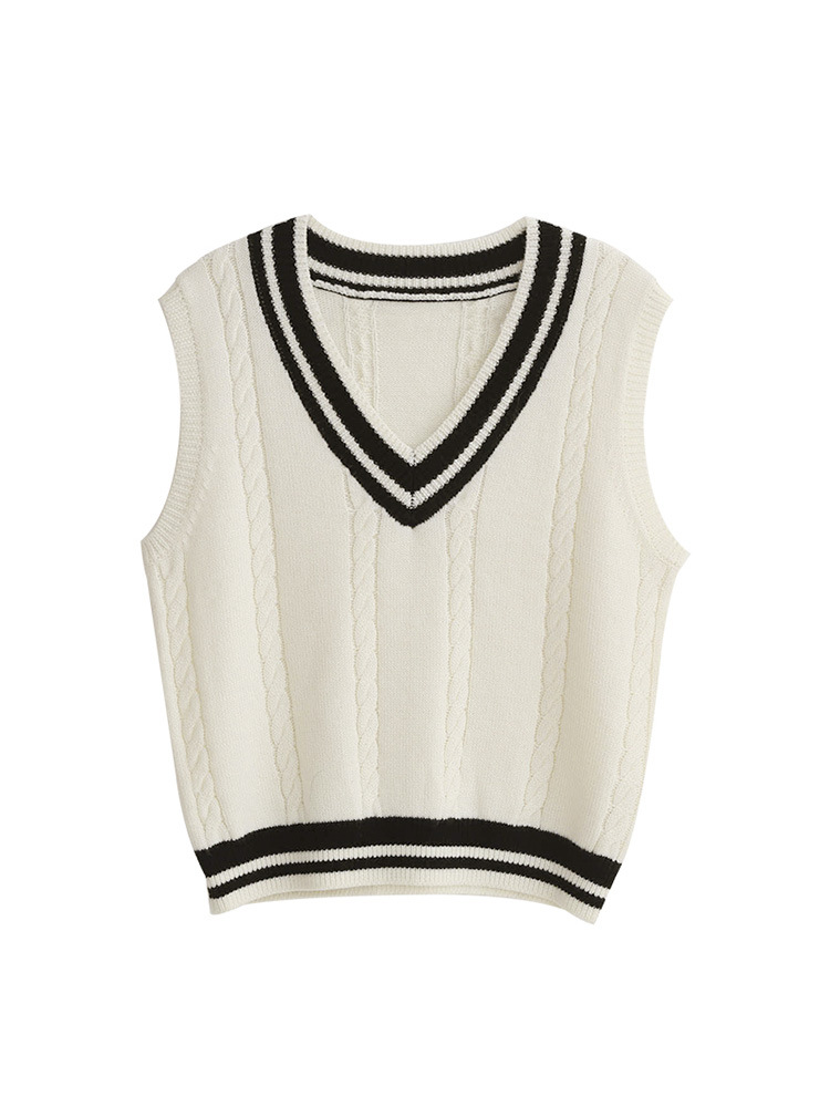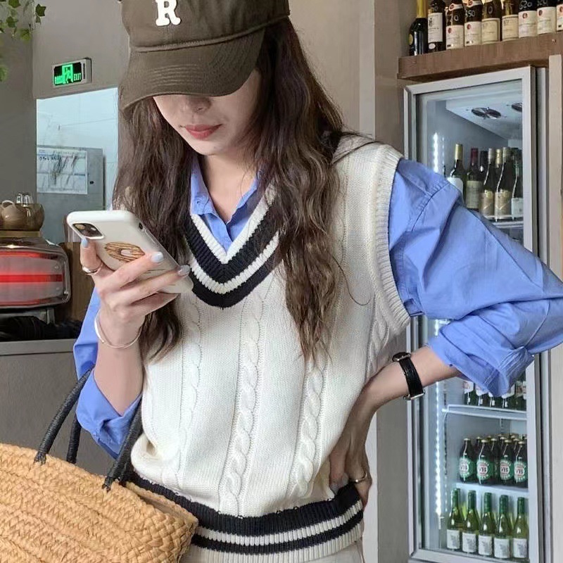 대학 스타일 콘트라스트 컬러 V 넥 니트 조끼 여성 이른 봄 새로운 2024 스택 웨이스트 코트 민소매 스웨터 조끼