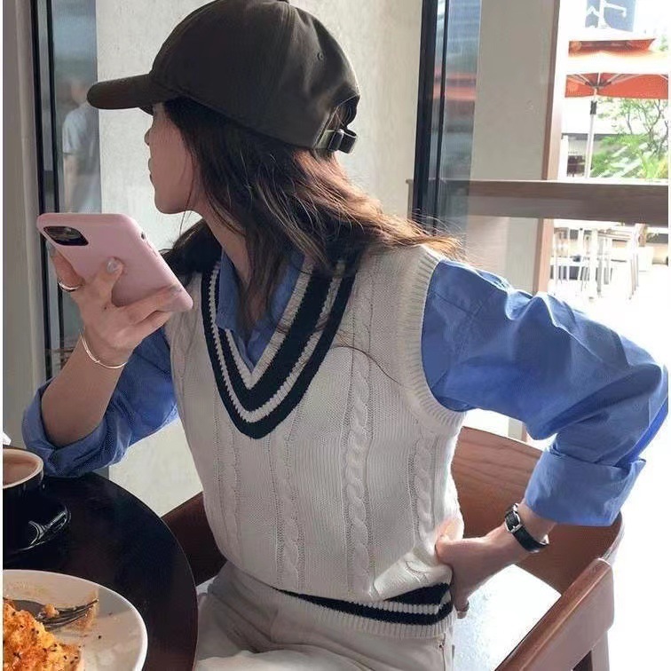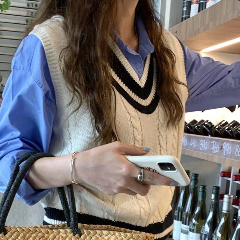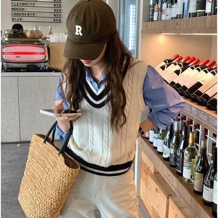 대학 스타일 콘트라스트 컬러 V 넥 니트 조끼 여성 이른 봄 새로운 2024 스택 웨이스트 코트 민소매 스웨터 조끼스토어 가기