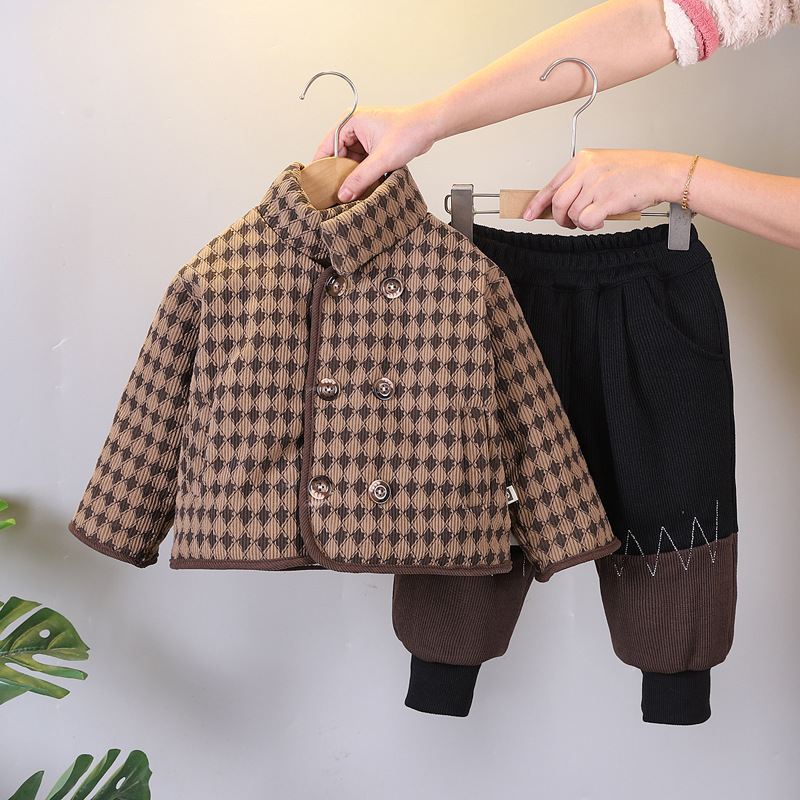 소년 캐시미어 세트 가을과 겨울 어린이 의류 2024 새로운 아기의 겨울 의류 아동용 두꺼운 면 패딩 재킷 투피스 세트