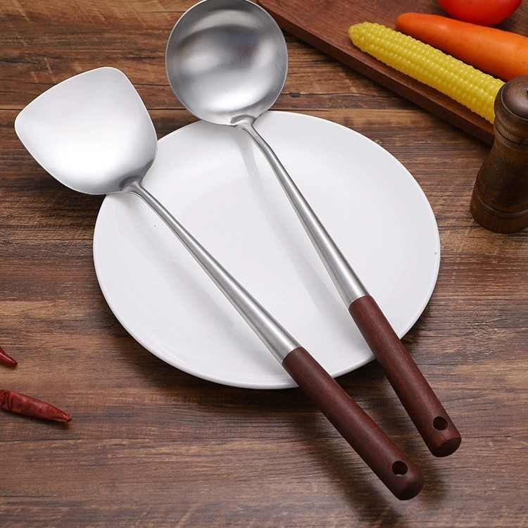 304 스테인레스 스틸 볶음 삽 수프 스푼 가정용 상업용 요리사 볶음 삽 수프 스푼 긴 나무 손잡이 주방용품 세트