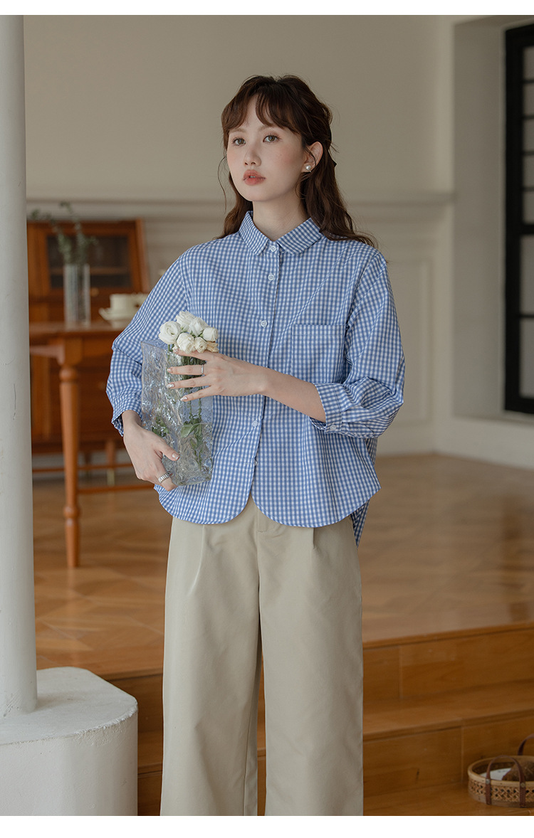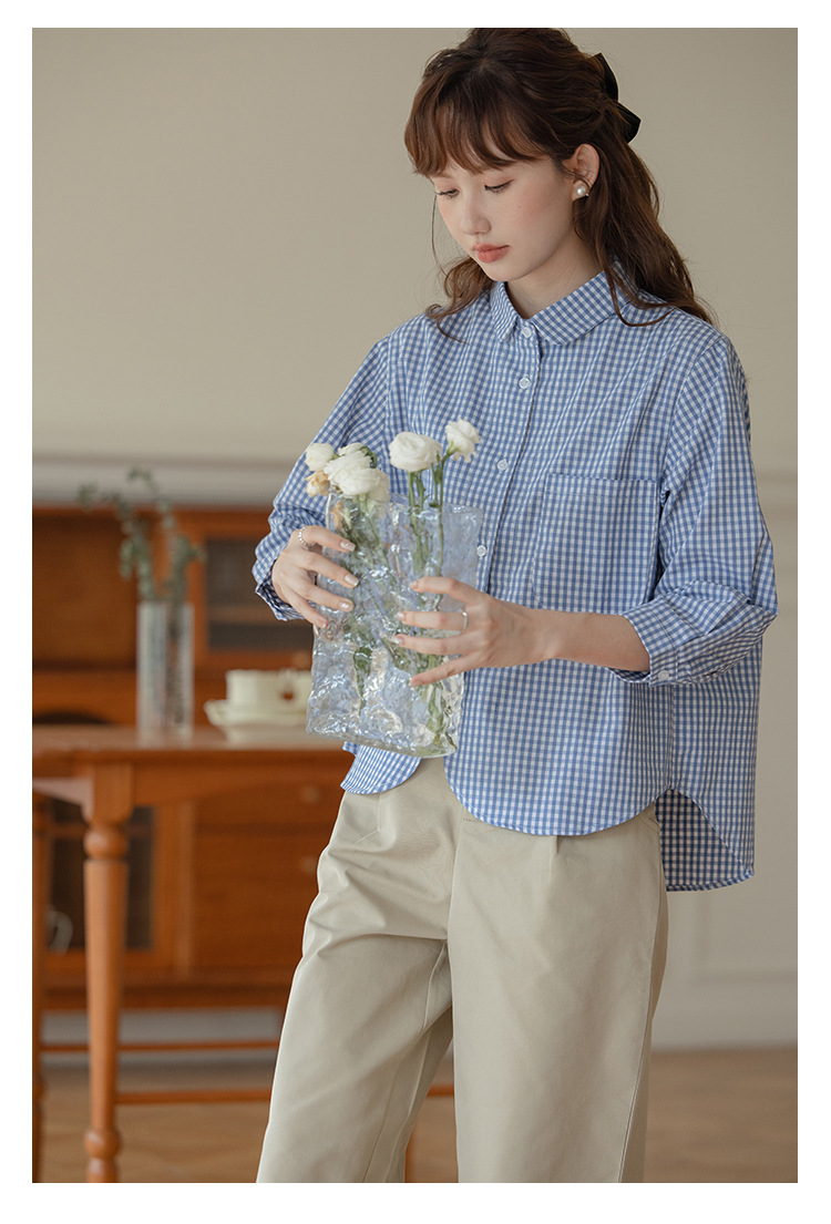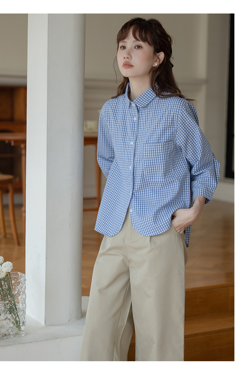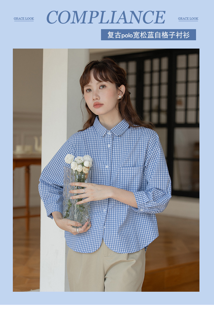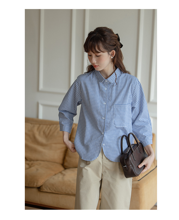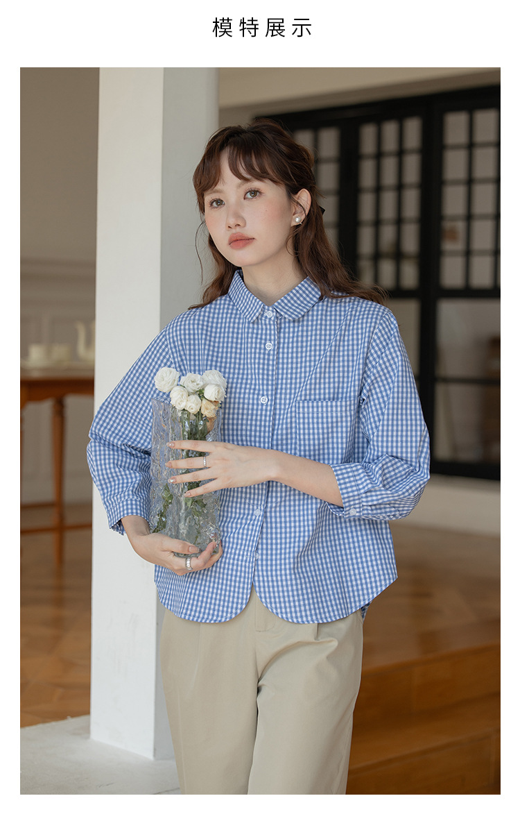 2025 봄 신상 일본풍 예술적인 폴로 칼라 체크 디자인 싱글 버튼 숏 길이 체크 긴팔 셔츠 여성용스토어 가기