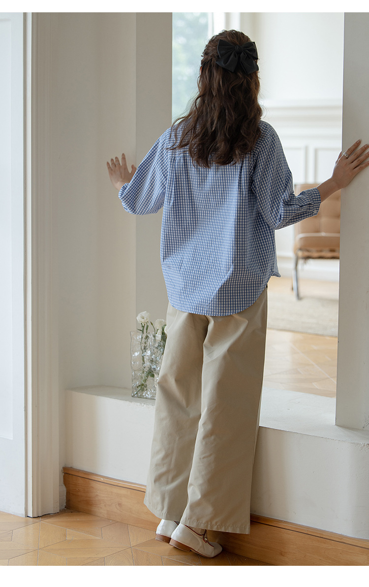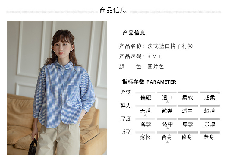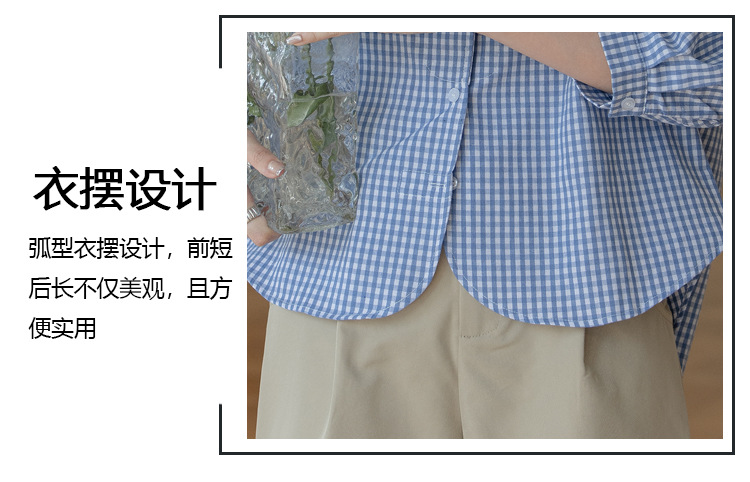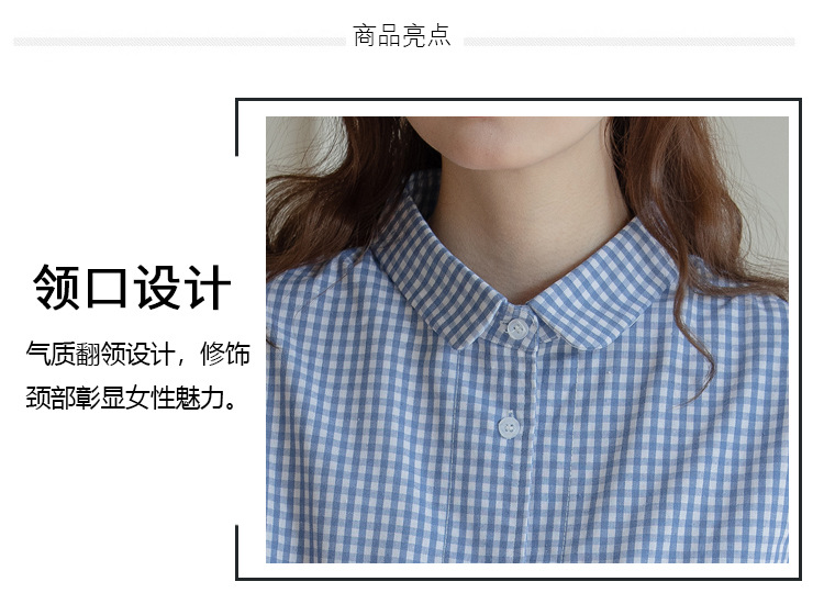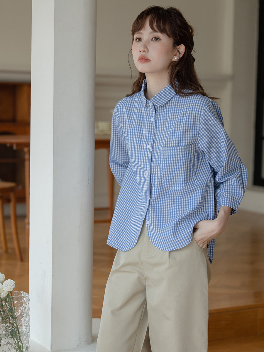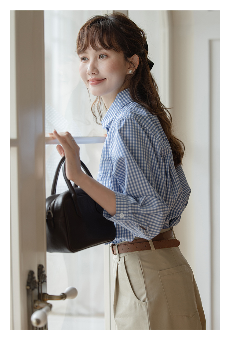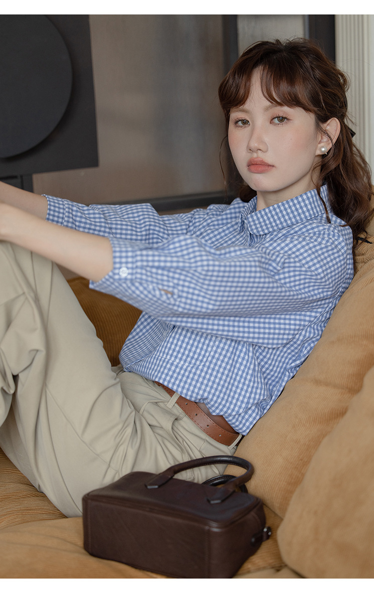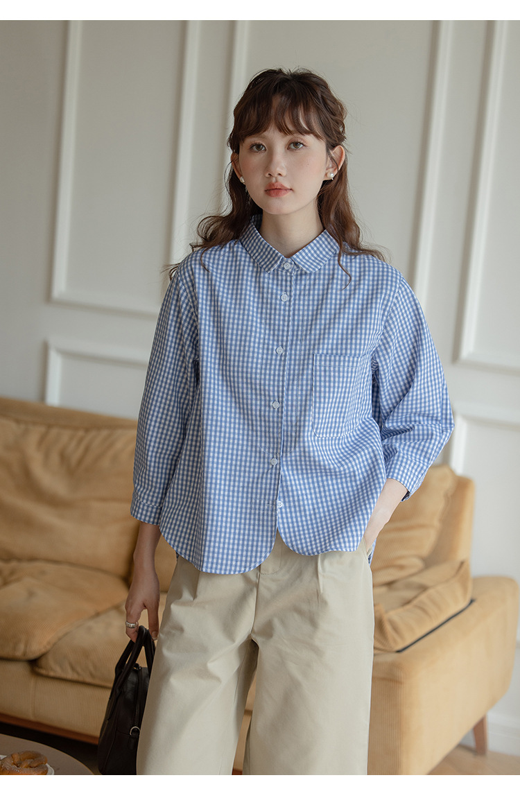 2025 봄 신상 일본풍 예술적인 폴로 칼라 체크 디자인 싱글 버튼 숏 길이 체크 긴팔 셔츠 여성용스토어 가기